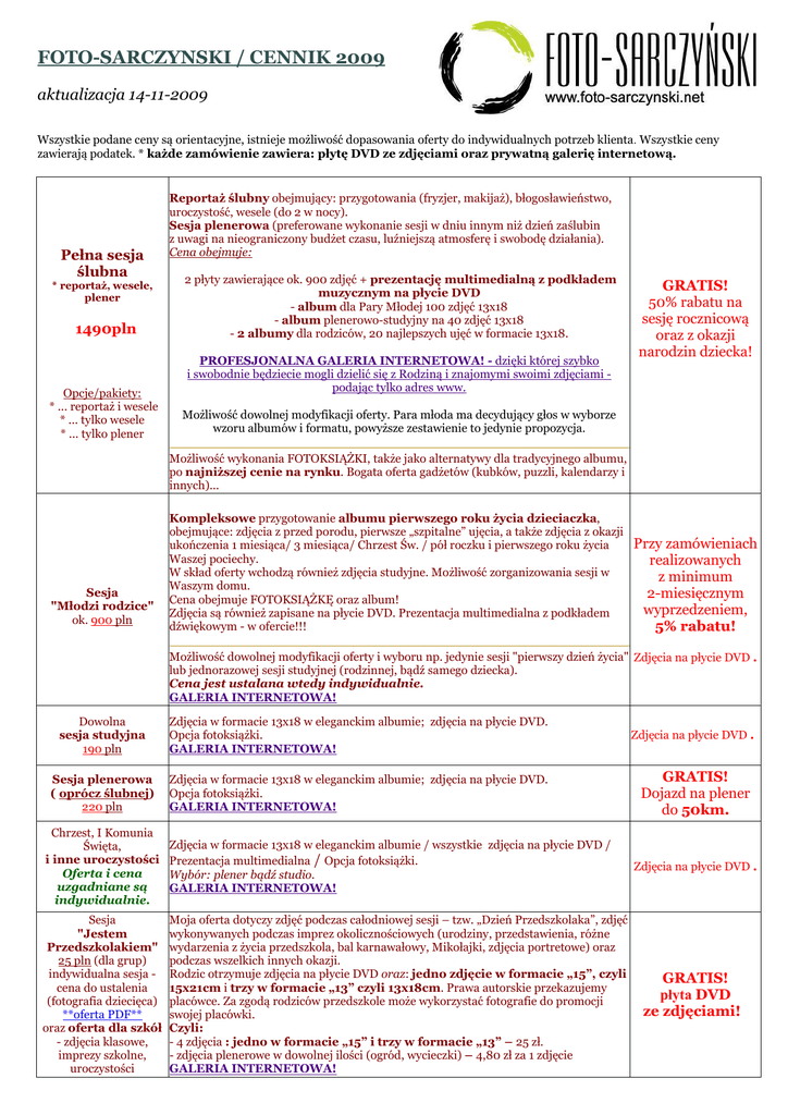 FOTO-SARCZYNSKI / CENNIK 2009 aktualizacja 14-11-2009 Wszystkie podane ceny są orientacyjne, istnieje możliwość dopasowania oferty do indywidualnych potrzeb klienta. Wszystkie ceny zawierają podatek. * każde zamówienie zawiera: płytę DVD ze zdjęciami oraz prywatną galerię internetową. Pełna sesja ślubna * reportaż, wesele, plener 1490pln Opcje/pakiety: * ... reportaż i wesele * ... tylko wesele * ... tylko plener Reportaż ślubny obejmujący: przygotowania (fryzjer, makijaż), błogosławieństwo, uroczystość, wesele (do 2 w nocy). Sesja plenerowa (preferowane wykonanie sesji w dniu innym niż dzień zaślubin z uwagi na nieograniczony budżet czasu, luźniejszą atmosferę i swobodę działania). Cena obejmuje: 2 płyty zawierające ok. 900 zdjęć + prezentację multimedialną z podkładem muzycznym na płycie DVD - album dla Pary Młodej 100 zdjęć 13x18 - album plenerowo-studyjny na 40 zdjęć 13x18 - 2 albumy dla rodziców, 20 najlepszych ujęć w formacie 13x18. PROFESJONALNA GALERIA INTERNETOWA! - dzięki której szybko i swobodnie będziecie mogli dzielić się z Rodziną i znajomymi swoimi zdjęciami podając tylko adres www. GRATIS! 50% rabatu na sesję rocznicową oraz z okazji narodzin dziecka! Możliwość dowolnej modyfikacji oferty. Para młoda ma decydujący głos w wyborze wzoru albumów i formatu, powyższe zestawienie to jedynie propozycja. Możliwość wykonania FOTOKSIĄŻKI, także jako alternatywy dla tradycyjnego albumu, po najniższej cenie na rynku. Bogata oferta gadżetów (kubków, puzzli, kalendarzy i innych)... Sesja "Młodzi rodzice" ok. 900 pln Kompleksowe przygotowanie albumu pierwszego roku życia dzieciaczka, obejmujące: zdjęcia z przed porodu, pierwsze „szpitalne” ujęcia, a także zdjęcia z okazji ukończenia 1 miesiąca/ 3 miesiąca/ Chrzest Św. / pół roczku i pierwszego roku życia Waszej pociechy. W skład oferty wchodzą również zdjęcia studyjne. Możliwość zorganizowania sesji w Waszym domu. Cena obejmuje FOTOKSIĄŻKĘ oraz album! Zdjęcia są również zapisane na płycie DVD. Prezentacja multimedialna z podkładem dźwiękowym - w ofercie!!! Przy zamówieniach realizowanych z minimum 2-miesięcznym wyprzedzeniem, 5% rabatu! Możliwość dowolnej modyfikacji oferty i wyboru np. jedynie sesji "pierwszy dzień życia" Zdjęcia na płycie DVD . lub jednorazowej sesji studyjnej (rodzinnej, bądź samego dziecka). Cena jest ustalana wtedy indywidualnie. GALERIA INTERNETOWA! Dowolna sesja studyjna 190 pln Zdjęcia w formacie 13x18 w eleganckim albumie; zdjęcia na płycie DVD. Opcja fotoksiążki. GALERIA INTERNETOWA! Zdjęcia na płycie DVD . Sesja plenerowa ( oprócz ślubnej) 220 pln Zdjęcia w formacie 13x18 w eleganckim albumie; zdjęcia na płycie DVD. Opcja fotoksiążki. GALERIA INTERNETOWA! GRATIS! Dojazd na plener do 50km. Chrzest, I Komunia Święta, i inne uroczystości Oferta i cena uzgadniane są indywidualnie. Zdjęcia w formacie 13x18 w eleganckim albumie / wszystkie zdjęcia na płycie DVD / Prezentacja multimedialna / Opcja fotoksiążki. Wybór: plener bądź studio. GALERIA INTERNETOWA! Sesja "Jestem Przedszkolakiem" 25 pln (dla grup) indywidualna sesja cena do ustalenia (fotografia dziecięca) **oferta PDF** oraz oferta dla szkół - zdjęcia klasowe, imprezy szkolne, uroczystości Moja oferta dotyczy zdjęć podczas całodniowej sesji – tzw. „Dzień Przedszkolaka”, zdjęć wykonywanych podczas imprez okolicznościowych (urodziny, przedstawienia, różne wydarzenia z życia przedszkola, bal karnawałowy, Mikołajki, zdjęcia portretowe) oraz podczas wszelkich innych okazji. Rodzic otrzymuje zdjęcia na płycie DVD oraz: jedno zdjęcie w formacie „15”, czyli 15x21cm i trzy w formacie „13” czyli 13x18cm. Prawa autorskie przekazujemy placówce. Za zgodą rodziców przedszkole może wykorzystać fotografie do promocji swojej placówki. Czyli: - 4 zdjęcia : jedno w formacie „15” i trzy w formacie „13” – 25 zł. - zdjęcia plenerowe w dowolnej ilości (ogród, wycieczki) – 4,80 zł za 1 zdjęcie GALERIA INTERNETOWA! Zdjęcia na płycie DVD . GRATIS! płyta DVD ze zdjęciami!