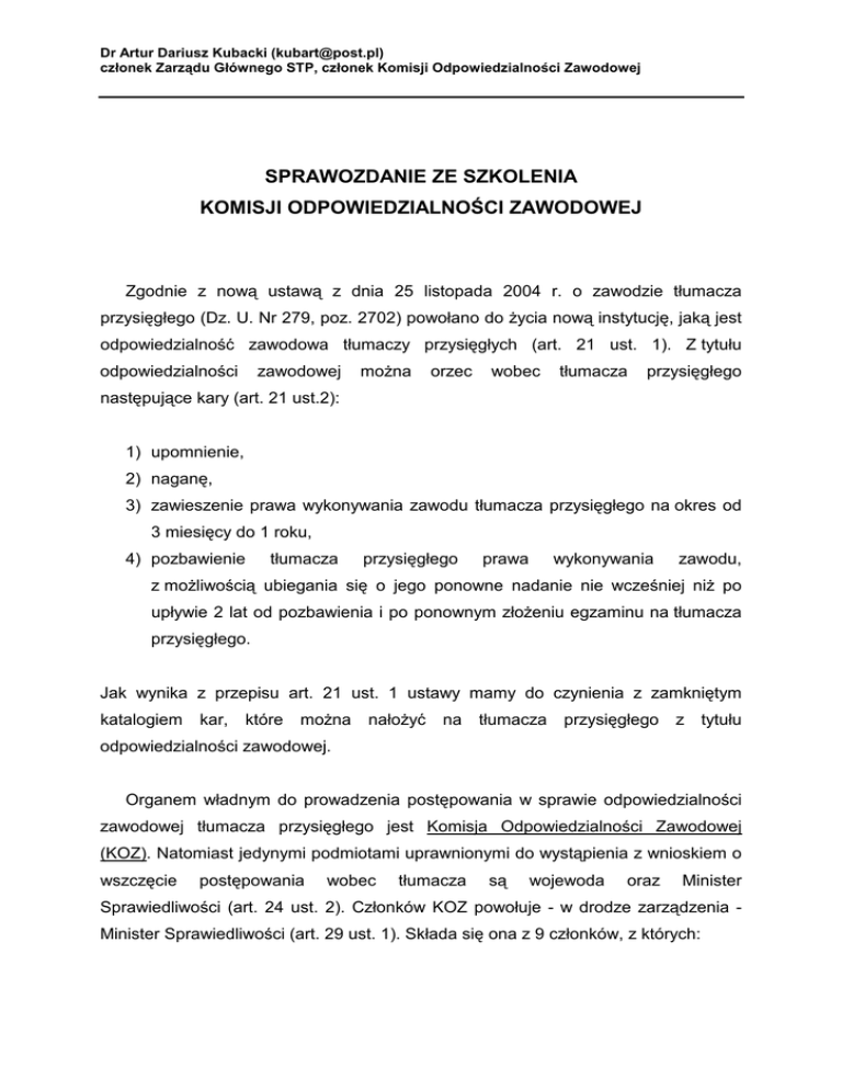 Dr Artur Dariusz Kubacki ([email protected]) członek Zarządu Głównego STP, członek Komisji Odpowiedzialności Zawodowej SPRAWOZDANIE ZE SZKOLENIA KOMISJI ODPOWIEDZIALNOŚCI ZAWODOWEJ Zgodnie z nową ustawą z dnia 25 listopada 2004 r. o zawodzie tłumacza przysięgłego (Dz. U. Nr 279, poz. 2702) powołano do Ŝycia nową instytucję, jaką jest odpowiedzialność zawodowa tłumaczy przysięgłych (art. 21 ust. 1). Z tytułu odpowiedzialności zawodowej moŜna orzec wobec tłumacza przysięgłego następujące kary (art. 21 ust.2): 1) upomnienie, 2) naganę, 3) zawieszenie prawa wykonywania zawodu tłumacza przysięgłego na okres od 3 miesięcy do 1 roku, 4) pozbawienie tłumacza przysięgłego prawa wykonywania zawodu, z moŜliwością ubiegania się o jego ponowne nadanie nie wcześniej niŜ po upływie 2 lat od pozbawienia i po ponownym złoŜeniu egzaminu na tłumacza przysięgłego. Jak wynika z przepisu art. 21 ust. 1 ustawy mamy do czynienia z zamkniętym katalogiem kar, które moŜna nałoŜyć na tłumacza przysięgłego z tytułu odpowiedzialności zawodowej. Organem władnym do prowadzenia postępowania w sprawie odpowiedzialności zawodowej tłumacza przysięgłego jest Komisja Odpowiedzialności Zawodowej (KOZ). Natomiast jedynymi podmiotami uprawnionymi do wystąpienia z wnioskiem o wszczęcie postępowania wobec tłumacza są wojewoda oraz Minister Sprawiedliwości (art. 24 ust. 2). Członków KOZ powołuje - w drodze zarządzenia Minister Sprawiedliwości (art. 29 ust. 1). Składa się ona z 9 członków, z których: - 4 osoby wskazuje Minister Sprawiedliwości, - 4 osoby wskazują organizacje zrzeszające tłumaczy (stowarzyszenia STP oraz TEPIS reprezentują po 2 osoby), - 1 osobę wskazuje minister właściwy do spraw pracy. Komisja Odpowiedzialności Zawodowej została powołana 1 września 2005 roku zarządzeniem Ministra Sprawiedliwości. Tłumacz przysięgły, wobec którego wszczęto postępowanie, moŜe ustanowić obrońcę spośród tłumaczy przysięgłych, adwokatów lub radców prawnych (art. 24 ust. 4) i sam nie musi brać udziału w postępowaniu dotyczącym odpowiedzialności tłumacza. NaleŜy zaznaczyć, Ŝe jego nieusprawiedliwione niestawiennictwo nie wstrzymuje postępowania (art. 24 ust. 3), a wstrzymuje postępowanie jedynie nieobecność usprawiedliwiona. Ustawa zawiera takŜe zamknięty katalog rodzajów orzeczeń, jakie moŜe wydać KOZ. Po przeprowadzeniu postępowania KOZ: - uniewinnia tłumacza przysięgłego od zarzutu, - orzeka wobec niego karę lub umarza postępowanie (art. 25 ust 1). Instancją odwoławczą od orzeczeń KOZ jest sąd apelacyjny właściwy ze względu na miejsce zamieszkania tłumacza przysięgłego (art. 26 ust. 1). Orzeczoną karę wobec tłumacza przysięgłego odnotowuje się w jego wpisie na liście prowadzonej przez Ministra Sprawiedliwości (art. 21 ust. 3). NaleŜy przy tym podkreślić, Ŝe informacja o nałoŜeniu kary nie jest podawana do publicznej wiadomości ani na liście publikowanej corocznie przez Ministra Sprawiedliwości, ani w Biuletynie Informacji Publicznej (art. 9 ust.3 i art. 10). Kara orzeczona z tytułu odpowiedzialności zawodowej tłumacza przysięgłego ulega zatarciu z mocy prawa, jeŜeli od daty uprawomocnienia orzeczenia o karze upłynęły: - 2 lata – w przypadku kar upomnienia i nagany, 2 - 3 lata - w przypadku cięŜszych kar, tj. zawieszenia prawa wykonywania zawodu tłumacza przysięgłego na okres od 3 miesięcy do 1 roku lub pozbawieniem go tego prawa (art. 23 ust. 1). Zatarcie ukarania skutkuje całkowitym wymazaniem kary oraz usunięciem wpisu o karze z listy tłumaczy przysięgłych (art. 23 ust. 2). W dniach 12-13 grudnia 2005 r. w ośrodku Szkoleniowo-Wypoczynkowym „Albrechtówka” w Kazimierzu Dolnym nad Wisłą odbyło się szkolenie członków Komisji Odpowiedzialności Zawodowej Tłumaczy Przysięgłych działającej przy Ministrze Sprawiedliwości. W programie szkolenia znalazły się dwa referaty przewodniczącego odpowiedzialności stosowanych w KOZ, prokuratora dyscyplinarnej postępowaniu Jacka tłumacza przed KOZ Zielińskiego, przysięgłego, procedur ze szczególnym dotyczące prawnych uwzględnieniem przepisów kodeksu postępowania karnego. Zastępca przewodniczącego KOZ, Wojciech Ulitko - reprezentujący Departament Legislacyjno-Prawny w Ministerstwie Sprawiedliwości, omówił zagadnienia prawne oraz interpretacje niektórych przepisów ustawy o zawodzie tłumacza przysięgłego. Prezes PT TEPIS - Danuta Kierzkowska szczegółowo przedstawiła zasady etyki zawodowej tłumaczy przysięgłych wynikające z Kodeksu Tłumacza Przysięgłego. Na zakończenie szkolenia przeprowadzono symulację rozprawy z udziałem stron procesowych. PoniŜej lista najwaŜniejszych wniosków z konferencji: 1) nie ma moŜliwości zawieszenia uprawnień tłumacza przysięgłego przez niego samego; jedynie Minister Sprawiedliwości moŜe to zrobić w określonych ustawą przypadkach, tj. z powodu niewykonywania przez tłumacza czynności przez okres dłuŜszy aniŜeli 3 lata, licząc od dnia ostatniej czynności (art. 11 ust. 1) lub jako karę (art. 21 ust. 2 pkt 3); 2) tłumacze przysięgli, którzy zostali ustanowieni na podstawie nieaktualnych juŜ przepisów rozporządzenia Ministra Sprawiedliwości z dnia 8 czerwca 1987 r. w sprawie biegłych sądowych i tłumaczy przysięgłych i którzy do 27 lipca 2005 r. nie złoŜyli wniosku - zgodnie z przepisami przejściowymi rozdziału 5. nowej ustawy o zawodzie tłumacza przysięgłego (art. 33) - o wpis na listę tłumaczy 3 przysięgłych prowadzoną przez Ministra Sprawiedliwości, nie utracili wszystkich uprawnień wynikających z tego rozporządzenia. Do dnia 27 stycznia 2007 r. mogą bowiem wykonywać czynności tłumacza przysięgłego i posługiwać się dotychczasowymi pieczęciami urzędowymi. 3) kwestia odpowiedzialności zawodowej tłumacza przysięgłego zamieszkałego poza granicami Polski budzi wiele wątpliwości