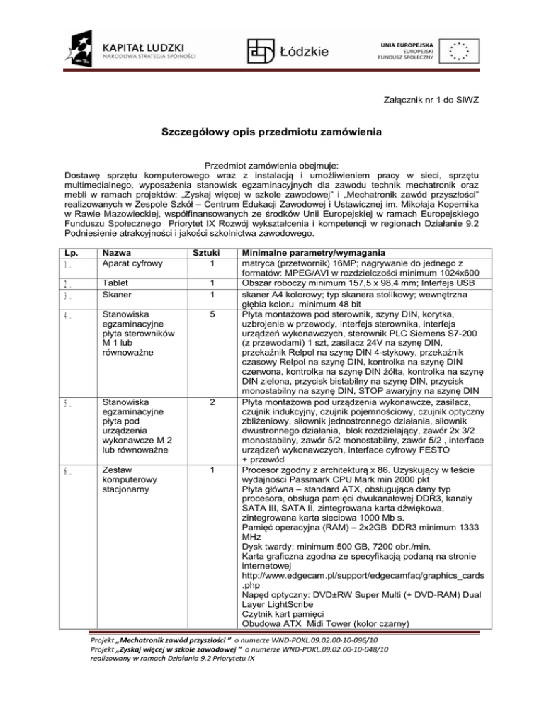 Za cznik nr 1 do SIWZ Szczegó owy opis przedmiotu zamówienia Przedmiot zamówienia obejmuje: Dostaw sprz tu komputerowego wraz z instalacj i umo liwieniem pracy w sieci, sprz tu multimedialnego, wyposa enia stanowisk egzaminacyjnych dla zawodu technik mechatronik oraz mebli w ramach projektów: „Zyskaj wi cej w szkole zawodowej” i „Mechatronik zawód przysz ci” realizowanych w Zespole Szkó – Centrum Edukacji Zawodowej i Ustawicznej im. Miko aja Kopernika w Rawie Mazowieckiej, wspó finansowanych ze rodków Unii Europejskiej w ramach Europejskiego Funduszu Spo ecznego Priorytet IX Rozwój wykszta cenia i kompetencji w regionach Dzia anie 9.2 Podniesienie atrakcyjno ci i jako ci szkolnictwa zawodowego. Lp. 1. Nazwa Aparat cyfrowy Sztuki 1 2. 3. Tablet Skaner 1 1 4. Stanowiska egzaminacyjne yta sterowników M 1 lub równowa ne 5 5. Stanowiska egzaminacyjne yta pod urz dzenia wykonawcze M 2 lub równowa ne 2 6. Zestaw komputerowy stacjonarny 1 Minimalne parametry/wymagania matryca (przetwornik) 16MP; nagrywanie do jednego z formatów: MPEG/AVI w rozdzielczo ci minimum 1024x600 Obszar roboczy minimum 157,5 x 98,4 mm; Interfejs USB skaner A4 kolorowy; typ skanera stolikowy; wewn trzna bia koloru minimum 48 bit yta monta owa pod sterownik, szyny DIN, korytka, uzbrojenie w przewody, interfejs sterownika, interfejs urz dze wykonawczych, sterownik PLC Siemens S7-200 (z przewodami) 1 szt, zasilacz 24V na szyn DIN, przeka nik Relpol na szyn DIN 4-stykowy, przeka nik czasowy Relpol na szyn DIN, kontrolka na szyn DIN czerwona, kontrolka na szyn DIN ta, kontrolka na szyn DIN zielona, przycisk bistabilny na szyn DIN, przycisk monostabilny na szyn DIN, STOP awaryjny na szyn DIN yta monta owa pod urz dzenia wykonawcze, zasilacz, czujnik indukcyjny, czujnik pojemno ciowy, czujnik optyczny zbli eniowy, si ownik jednostronnego dzia ania, si ownik dwustronnego dzia ania, blok rozdzielaj cy, zawór 2x 3/2 monostabilny, zawór 5/2 monostabilny, zawór 5/2 , interface urz dze wykonawczych, interface cyfrowy FESTO + przewód Procesor zgodny z architektur x 86. Uzyskuj cy w te cie wydajno ci Passmark CPU Mark min 2000 pkt yta g ówna – standard ATX, obs uguj ca dany typ procesora, obs uga pami ci dwukana owej DDR3, kana y SATA III, SATA II, zintegrowana karta d wi kowa, zintegrowana karta sieciowa 1000 Mb s. Pami operacyjna (RAM) – 2x2GB DDR3 minimum 1333 MHz Dysk twardy: minimum 500 GB, 7200 obr./min. Karta graficzna zgodna ze specyfikacj podan na stronie internetowej http://www.edgecam.pl/support/edgecamfaq/graphics_cards .php Nap d optyczny: DVD±RW Super Multi (+ DVD-RAM) Dual Layer LightScribe Czytnik kart pami ci Obudowa ATX Midi Tower (kolor czarny) Projekt „Mechatronik zawód przysz ci ” o numerze WND-POKL.09.02.00-10-096/10 Projekt „Zyskaj wi cej w szkole zawodowej ” o numerze WND-POKL.09.02.00-10-048/10 realizowany w ramach Dzia ania 9.2 Priorytetu IX Zasilacz minimum 400W zgodny ze standardem ATX12V 2.0 lub nowszym, umo liwiaj cy bezproblemow prac komputera tak e po pod czeniu dodatkowych urz dze , przez wbudowane w p yt g ówn porty i sloty, minimum 4 porty USB oraz porty s uchawek i mikrofonu z przodu obudowy, dodatkowy wentylator. Klawiatura USB w uk adzie QWERTY czarna Mysz optyczna min 800 dpi czarna Monitor minimum 21” (kolor czarny) uk ad 16:9 nominalna rozdzielczo matrycy minimum 1366 x 768, z g nikami 7. 8. 9. 10. 11. 12. 13. Oprogramowanie do komputera (Windows+Office) Zestaw komputerowy stacjonarny 1 Microsoft Windows Professional 7 32 bit OFFICE 2010 Standard EDU 9 Oprogramowanie do komputerów na 9 stanowisk Drukarka laserowa 1 Procesor zgodny z architektur x 86. Uzyskuj cy w te cie wydajno ci Passmark CPU Mark min 2000 pkt yta g ówna – standard ATX, obs uguj ca dany typ procesora, obs uga pami ci dwukana owej DDR3, kana y SATA III, SATA II, zintegrowana karta d wi kowa, zintegrowana karta sieciowa 1000 Mb s. Pami operacyjna (RAM) – 2x2GB DDR3 minimum 1333 MHz Dysk twardy: minimum 320 GB, 7200 obr./min. Karta graficzna zgodna ze specyfikacj podan na stronie internetowej http://www.edgecam.pl/support/edgecamfaq/graphics_c ards.php, Nap d optyczny: DVD±RW Super Multi (+ DVD-RAM) Dual Layer LightScribe, Czytnik kart pami ci, Obudowa ATX Midi Tower (kolor czarny). Zasilacz minimum 400W zgodny ze standardem ATX12V 2.0 lub nowszym, umo liwiaj cy bezproblemow prac komputera tak e po pod czeniu dodatkowych urz dze , przez wbudowane w p yt g ówn porty i sloty, minimum 4 porty USB oraz porty s uchawek i mikrofonu z przodu obudowy, dodatkowy wentylator. Klawiatura USB w uk adzie QWERTY czarna Mysz optyczna min 800 dpi czarna Monitor minimum 21” (kolor czarny) uk ad 16:9 nominalna rozdzielczo matrycy minimum 1366 x 768, z g nikami Microsoft Windows Professional 7 32 bit Oprogramowanie CAM - Edukacja (EdgeCAM) lub równowa ne Oprogramowanie CNC- Edukacja (ZERO-OSN) lub równowa ne Oprogramowanie PAP-Edukacja (FluidSIM pneumatyka) lub 1 1 Podstawowe funkcje urz dzenia: drukarka-kopiarka laserowa rozmiar no nika: A3 Licencja wielostanowiskowe minimum 15 stanowisk 1 Licencja wielostanowiskowe minimum 15 stanowisk 1 Licencja 10 stanowiskowa Projekt „Mechatronik zawód przysz ci ” o numerze WND-POKL.09.02.00-10-096/10 Projekt „Zyskaj wi cej w szkole zawodowej ” o numerze WND-POKL.09.02.00-10-048/10 realizowany w ramach Dzia ania 9.2 Priorytetu IX 14. równowa ne Stoliki jednoosobowe pod komputer 15. 15 Stoliki jednoosobowe pod komputer krzes a 49 Krzes a 16. biurko nauczyciela 2 biurko z szuflad i dwoma szafkami zamykane na klucz 17. szafa biurowa 2 szafa biurowa zamykana na klucz 18. Stoliki uczniowskie dwuosobowe 17 Stoliki uczniowskie dwuosobowe 19. Krzes o dla nauczyciela 1 Krzes o obrotowe Zamawiaj cy wymaga, aby sprz t i meble tworzy y spójn kolorystycznie ca . Projekt „Mechatronik zawód przysz ci ” o numerze WND-POKL.09.02.00-10-096/10 Projekt „Zyskaj wi cej w szkole zawodowej ” o numerze WND-POKL.09.02.00-10-048/10 realizowany w ramach Dzia ania 9