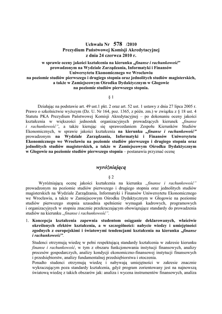 Uchwała Nr 578 /2010 Prezydium Państwowej Komisji Akredytacyjnej z dnia 24 czerwca 2010 r. w sprawie oceny jakości kształcenia na kierunku „finanse i rachunkowość” prowadzonym na Wydziale Zarządzania, Informatyki i Finansów Uniwersytetu Ekonomicznego we Wrocławiu na poziomie studiów pierwszego i drugiego stopnia oraz jednolitych studiów magisterskich, a takŜe w Zamiejscowym Ośrodku Dydaktycznym w Głogowie na poziomie studiów pierwszego stopnia. §1 Działając na podstawie art. 49 ust.1 pkt. 2 oraz art. 52 ust. 1 ustawy z dnia 27 lipca 2005 r. Prawo o szkolnictwie wyŜszym (Dz. U. Nr 164, poz. 1365, z późn. zm.) w związku z § 18 ust. 4 Statutu PKA Prezydium Państwowej Komisji Akredytacyjnej – po dokonaniu oceny jakości kształcenia w większości jednostek organizacyjnych prowadzących kierunek „finanse i rachunkowość”, a takŜe kierując się sprawozdaniem Zespołu Kierunków Studiów Ekonomicznych, w sprawie jakości kształcenia na kierunku „finanse i rachunkowość” prowadzonym na Wydziale Zarządzania, Informatyki i Finansów Uniwersytetu Ekonomicznego we Wrocławiu na poziomie studiów pierwszego i drugiego stopnia oraz jednolitych studiów magisterskich, a takŜe w Zamiejscowym Ośrodku Dydaktycznym w Głogowie na poziomie studiów pierwszego stopnia – postanawia przyznać ocenę wyróŜniającą §2 WyróŜniającą ocenę jakości kształcenia na kierunku „finanse i rachunkowość” prowadzonym na poziomie studiów pierwszego i drugiego stopnia oraz jednolitych studiów magisterskich na Wydziale Zarządzania, Informatyki i Finansów Uniwersytetu Ekonomicznego we Wrocławiu, a takŜe w Zamiejscowym Ośrodku Dydaktycznym w Głogowie na poziomie studiów pierwszego stopnia uzasadnia spełnienie wymagań kadrowych, programowych i organizacyjnych w stopniu znacznie przekraczającym obowiązujące standardy do prowadzenia studiów na kierunku „finanse i rachunkowość”. 1. Koncepcja kształcenia zapewnia studentom osiąganie deklarowanych, właściwie określonych efektów kształcenia, a w szczególności: nabycie wiedzy i umiejętności zgodnych z europejskimi i światowymi tendencjami kształcenia na kierunku „finanse i rachunkowość”. Studenci otrzymują wiedzę w pełni respektującą standardy kształcenia w zakresie kierunku finanse i rachunkowość, w tym z obszaru funkcjonowania instytucji finansowych, analizy procesów gospodarczych, analizy kondycji ekonomiczno-finansowej instytucji finansowych i przedsiębiorstw, analizy fundamentalnej przedsiębiorstwa i otoczenia. Ponadto studenci otrzymują wiedzę i nabywają umiejętności w zakresie znacznie wykraczającym poza standardy kształcenia, gdyŜ program zorientowany jest na najnowszą światową wiedzę z takich obszarów jak: analiza i wycena instrumentów finansowych, analiza 2 ryzyka, analiza efektywności inwestycji, zarządzanie ryzykiem w banku, zakładzie ubezpieczeń i przedsiębiorstwie, zarządzanie wartością przedsiębiorstwa, finanse gospodarstw domowych, standardy sprawozdawczości finansowej, analiza danych finansowych, w tym finansowych szeregów czasowych cen akcji, stóp procentowych, kursów walutowych, cen surowców i metali, cen nieruchomości. Wartość dodana programu w proces kształcenia na kierunku finanse i rachunkowość polega na właściwej równowadze w oferowaniu studentom z jednej strony wiedzy z zakresu zaawansowanych narzędzi matematycznych (analiza matematyczna, teoria prawdopodobieństwa, teoria procesów stochastycznych, ekonometria) oraz z drugiej strony o profilu finansowym jak np. (rynek finansowy, analiza ryzyka, finanse przedsiębiorstwa, zarządzanie portfelem inwestycji, sprawozdawczość finansowa, rachunkowość zarządcza) z jednoczesnym uwzględnieniem elementów behawioralnych. Absolwent kierunku jest bardzo dobrze przygotowany do pracy w prestiŜowych i wymagających kwalifikacji zawodach finansowych, takich jak: doradca inwestycyjny, analityk finansowy, zarządzający ryzykiem, osobisty doradca finansowy, audytor sprawozdania finansowego. Program kształcenia stwarza teŜ studentom moŜliwości do ubiegania się o znane na świecie certyfikaty z rachunkowości: CIMA (międzynarodowa kwalifikacja zawodowa z rachunkowości zarządczej), ACCA - The Association of Certified Chartered Accountants (międzynarodowa kwalifikacja zawodowa z finansów i audytu oraz z zarządzania ryzykiem) oraz PRM (Professional Risk Manager) i FRM(Financial Risk Manager). Ponadto program jednej ze specjalności oferuje wiedzę niezbędną do ubiegania się o licencje w trzech zawodach związanych z rynkiem nieruchomości, którymi są: rzeczoznawca majątkowy, pośrednik w obrocie nieruchomościami oraz zarządca nieruchomości. DuŜy ładunek wiedzy integrujący narzędzia statystyczno-ekonometryczne do oceny ryzyka przekazywany studentom sprawia, iŜ kierunek „finanse i rachunkowość” prowadzony na Wydziale Zarządzania, Informatyki i Finansów Uniwersytetu Ekonomicznego we Wrocławiu uwaŜany jest za niekwestionowanego lidera w kraju, umoŜliwiającego studentom nabycie wiedzy i umiejętności w zakresie rynków finansowych i zarządzania ryzykiem. 2. Proces kształcenia charakteryzuje wysoki stopień internacjonalizacji. Na Wydziale Zarządzania, Informatyki i Finansów stworzona została dla kierunku „finanse i rachunkowość” oferta kształcenia w języku angielskim. Odnosi się ona zarówno do studiów pierwszego, jak i drugiego stopnia. Są to unikalne programy w tym zakresie oferowane w Europie Środkowej. Na studiach pierwszego stopnia oferowany jest program Bachelor Studies in Finance w zakresie dwóch specjalności: Financial Management oraz Financial Markets. Natomiast na studiach drugiego stopnia program Master Studies in Finance. DuŜym wyróŜnieniem, jakie spotkało te programy jest nadanie statusu partnera przez CFA Institute, wiodącą światową organizację certyfikującą analityków finansowych i zarządzających