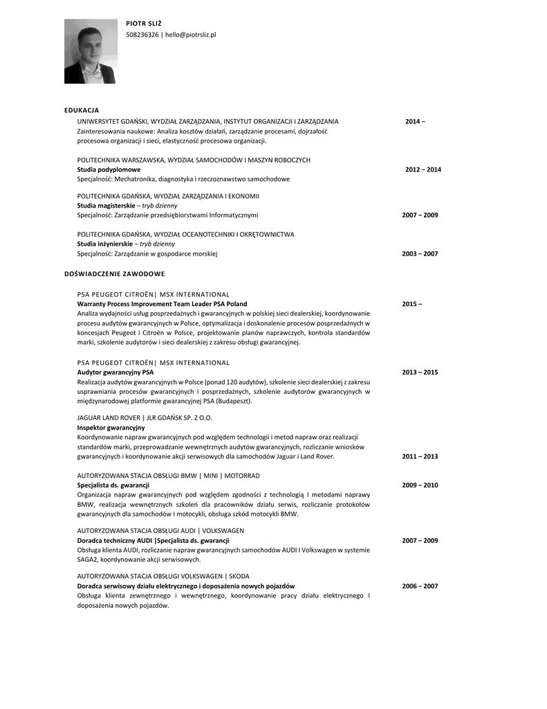 PIOTR SLIŻ 508236326 | [email protected] EDUKACJA UNIWERSYTET GDAŃSKI, WYDZIAŁ ZARZĄDZANIA, INSTYTUT ORGANIZACJI I ZARZĄDZANIA Zainteresowania naukowe: Analiza kosztów działań, zarządzanie procesami, dojrzałość procesowa organizacji i sieci, elastyczność procesowa organizacji. POLITECHNIKA WARSZAWSKA, WYDZIAŁ SAMOCHODÓW I MASZYN ROBOCZYCH Studia podyplomowe Specjalność: Mechatronika, diagnostyka i rzeczoznawstwo samochodowe 2014 − 2012 − 2014 POLITECHNIKA GDAŃSKA, WYDZIAŁ ZARZĄDZANIA I EKONOMII Studia magisterskie – tryb dzienny Specjalność: Zarządzanie przedsiębiorstwami Informatycznymi 2007 − 2009 POLITECHNIKA GDAŃSKA, WYDZIAŁ OCEANOTECHNIKI I OKRĘTOWNICTWA Studia inżynierskie – tryb dzienny Specjalność: Zarządzanie w gospodarce morskiej 2003 − 2007 DOŚWIADCZENIE ZAWODOWE PSA PEUGEOT CITROËN| MSX INTERNATIONAL Warranty Process Improvement Team Leader PSA Poland Analiza wydajności usług posprzedażnych i gwarancyjnych w polskiej sieci dealerskiej, koordynowanie procesu audytów gwarancyjnych w Polsce, optymalizacja i doskonalenie procesów posprzedażnych w koncesjach Peugeot i Citroën w Polsce, projektowanie planów naprawczych, kontrola standardów marki, szkolenie audytorów i sieci dealerskiej z zakresu obsługi gwarancyjnej. PSA PEUGEOT CITROËN| MSX INTERNATIONAL Audytor gwarancyjny PSA Realizacja audytów gwarancyjnych w Polsce (ponad 120 audytów), szkolenie sieci dealerskiej z zakresu usprawniania procesów gwarancyjnych i posprzedażnych, szkolenie audytorów gwarancyjnych w międzynarodowej platformie gwarancyjnej PSA (Budapeszt). JAGUAR LAND ROVER | JLR GDAŃSK SP. Z O.O. Inspektor gwarancyjny Koordynowanie napraw gwarancyjnych pod względem technologii i metod napraw oraz realizacji standardów marki, przeprowadzanie wewnętrznych audytów gwarancyjnych, rozliczanie wniosków gwarancyjnych i koordynowanie akcji serwisowych dla samochodów Jaguar i Land Rover. AUTORYZOWANA STACJA OBSŁUGI BMW | MINI | MOTORRAD Specjalista ds. gwarancji Organizacja napraw gwarancyjnych pod względem zgodności z technologią I metodami naprawy BMW, realizacja wewnętrznych szkoleń dla pracowników działu serwis, rozliczanie protokołów gwarancyjnych dla samochodów I motocykli, obsługa szkód motocykli BMW. AUTORYZOWANA STACJA OBSŁUGI AUDI | VOLKSWAGEN Doradca techniczny AUDI |Specjalista ds. gwarancji Obsługa klienta AUDI, rozliczanie napraw gwarancyjnych samochodów AUDI I Volkswagen w systemie SAGA2, koordynowanie akcji serwisowych. AUTORYZOWANA STACJA OBSŁUGI VOLKSWAGEN | SKODA Doradca serwisowy działu elektrycznego i doposażenia nowych pojazdów Obsługa klienta zewnętrznego i wewnętrznego, koordynowanie pracy działu elektrycznego I doposażenia nowych pojazdów. 2015 – 2013 – 2015 2011 – 2013 2009 − 2010 2007 − 2009 2006 − 2007 PIOTR SLIŻ PUBLIKACJE NAUKOWE I ROZDZIAŁY MONOGRAFII Rola dojrzałości multiprocesowej sieci w kształtowaniu relacji międzyorganizacyjnych – wyniki badań empirycznych THE ROLE OF MULTIPROCESS MATURITY IN ESTABLISHING INTER−ORGANIZATIONAL RELATIONS – REPORT OF EMPIRICAL STUDIES Elastyczność procesowa organizacji – wyniki badań empirycznych BUSINESS PROCESS FLEXIBILITY, REPORT OF EMPIRICAL RESEARCH Dojrzałość procesowa organizacji − wyniki badań empirycznych BUSINESS PROCESS MATURITY, REPORT OF EMPIRICAL RESEARCH JĘZYKI OBCE Język angielski – B1, Język angielski techniczny A2 Język niemiecki – C1 UMIEJĘTNOŚCI I DOŚWIADCZENIE Szkolenia i certyfikaty z obsługi technicznej, posprzedażnej i gwarancyjnej: SKODA, VOLKSWAGEN, AUDI, BMW, MINI, JAGUAR, LAND ROVER, PEUGEOT, CITROEN, DS. Certyfikat AUDATEX Biegła znajomość oprogramowania sektora motoryzacyjnego, analizy danych ustrukturyzowanych i pakietu MS Office. Prawo jazdy kat. B STRONA 2