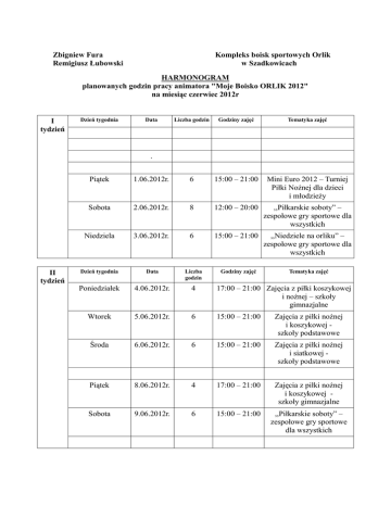 Zbigniew Fura Remigiusz Łubowski Kompleks boisk sportowych Orlik w Szadkowicach HARMONOGRAM planowanych godzin pracy animatora "Moje Boisko ORLIK 2012" na miesiąc czerwiec 2012r I tydzień Dzień tygodnia Data Liczba godzin Godziny zajęć Tematyka zajęć . II tydzień Piątek 1.06.2012r. 6 15:00 – 21:00 Mini Euro 2012 – Turniej Piłki Nożnej dla dzieci i młodzieży Sobota 2.06.2012r. 8 12:00 – 20:00 ,,Piłkarskie soboty” – zespołowe gry sportowe dla wszystkich Niedziela 3.06.2012r. 6 15:00 – 21:00 ,,Niedziele na orliku” – zespołowe gry sportowe dla wszystkich Dzień tygodnia Data Liczba godzin Poniedziałek 4.06.2012r. 4 17:00 – 21:00 Zajęcia z piłki koszykowej i nożnej – szkoły gimnazjalne Wtorek 5.06.2012r. 6 15:00 – 21:00 Zajęcia z piłki nożnej i koszykowej szkoły podstawowe Środa 6.06.2012r. 6 15:00 – 21:00 Zajęcia z piłki nożnej i siatkowej szkoły podstawowe Piątek 8.06.2012r. 4 17:00 – 21:00 Zajęcia z piłki nożnej i koszykowej szkoły gimnazjalne Sobota 9.06.2012r. 6 15:00 – 21:00 ,,Piłkarskie soboty” – zespołowe gry sportowe dla wszystkich Godziny zajęć Tematyka zajęć III tydzień IV tydzień Dzień tygodnia Data Liczba godzin Godziny zajęć Tematyka zajęć Poniedziałek 11.06.2012r. 6 15:00 – 21:00 Zajęcia z piłki koszykowej i nożnej – szkoły gimnazjalne Wtorek 12.06.2012r. 6 15:00 – 21:00 Zajęcia z piłki nożnej i koszykowej – szkoły podstawowe Środa 13.06.2012r. 6 15:00 – 21:00 Zajęcia sportowo – rekreacyjne dla młodzieży Czwartek 14.06.2012r. 6 14:00 – 20:00 Zajęcia z piłki nożnej i siatkowej – szkoły podstawowe Piątek 15.06.2012r. 4 17:00 – 21:00 Zajęcia z piłki nożnej i koszykowej szkoły gimnazjalne Sobota 16.06.2012r. 6 15:00 – 21:00 ,,Piłkarskie soboty” – zespołowe gry sportowe dla wszystkich Niedziela 17.06.2012r. 6 15:00 – 21:00 ,,Gminna Liga Piłki Nożnej – Sławno 2012 Dzień tygodnia Data Liczba godzin Godziny zajęć Tematyka zajęć Poniedziałek 18.06.2012r. 4 17:00 – 21:00 Zajęcia z piłki koszykowej i nożnej – szkoły gimnazjalne Wtorek 19.06.2012r. 6 15:00 – 21:00 Zajęcia z piłki nożnej i koszykowej – szkoły podstawowe Środa 20.06.2012r. 6 15:00 – 21:00 Zajęcia sportowo – rekreacyjne dla młodzieży Czwartek 21.06.2012r. 6 14:00 – 20:00 Zajęcia z piłki nożnej i siatkowej – szkoły podstawowe Piątek 22.06.2012r. 6 15:00 – 21:00 Zajęcia z piłki nożnej i koszykowej szkoły gimnazjalne Sobota 23.06.2012r. 6 15:00 – 21:00 ,,Piłkarskie soboty” – zespołowe gry sportowe dla wszystkich Niedziela 24.06.2012r. 6 15:00 – 21:00 ,,Niedziele na orliku” – zespołowe gry sportowe dla wszystkich V tydzień Dzień tygodnia Data Liczba godzin Godziny zajęć Tematyka zajęć Poniedziałek 25.06.2012r. 4 17:00 – 21:00 Zajęcia z piłki koszykowej i nożnej – szkoły gimnazjalne Wtorek 26.06.2012r. 6 15:00 – 21:00 Zajęcia z piłki nożnej i koszykowej – szkoły podstawowe Środa 27.06.2012r. 6 15:00 – 21:00 Zajęcia sportowo – rekreacyjne dla młodzieży Czwartek 28.06.2012r. 6 15:00 – 21:00 Zajęcia z piłki nożnej i siatkowej – szkoły podstawowe Piątek 29.06.2012r. 6 15:00 – 21:00 Zajęcia z piłki nożnej i koszykowej szkoły gimnazjalne Sobota 30.06.2012r. 6 15:00 – 21:00 ,,Piłkarskie soboty” – zespołowe gry sportowe dla wszystkich