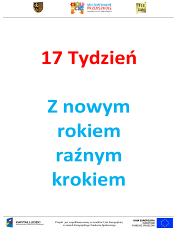 17 Tydzień Z nowym rokiem raźnym krokiem Projekt jest współfinansowany ze środków Unii Europejskiej w ramach Europejskiego Funduszu Społecznego XVII. TEMAT TYGODNIA: Z NOWYM ROKIEM RAŹNYM KROKIEM. Dzień tygodnia: 1 Temat: : Zegar tyka czas umyka Wiersz pt. Kto ważniejszy? S. Aleksandrzaka Pokłóciły się kiedyś wskazówki zegara. Jedna drugą na próżno przekonać się stara, że jedynie ona, ku innych rozpaczy, w całym budziku naprawdę coś znaczy. – Godzinę wskazuję – pierwsza się przechwala – a choć innym wskazówkom minąć się pozwalam, to jednak żadna z was mi nie pokaże drugiej takiej ważnej, jak ja, w tym zegarze. Wskazówkę od minut złość na to porwała: - Jak to? Czy naprawdę o tym zapomniałaś, że w ciągu godziny, choć sił ledwie starczy, ja przebiegnąć muszę dookoła tarczy? Sekundnik, obrażony, przestał nagle tykać i krzyknął, aż echo poszło od budzika: - Niesłychane rzeczy – coraz gniewniej wołał – ja przecież najszybciej biegam dookoła!... A wskazówki na to: - Patrzcie taki karzeł i chce najważniejszym być w całym zegarze! Zamiast cicho siedzieć, kłótnię rozpoczyna. Wtem... trach! – pękła nagle malutka sprężyna. Wskazówki stanęły. Żadna nie drgnie nawet, choć były takie ważne przed sekundą prawie. Miały teraz wszystkie bardzo głupie miny, gdyż nic nie znaczyły bez małej sprężyny. Piosenka pt. Zegary -muz. E. Pałasz, sł. M. Terlikowska U zegarmistrza gra muzyka Aż się zasłuchał cały dom. Bo sto zegarów na raz tyka A jeden bije bim bam bom. Cyk! Cyk! Cyk! Cyk! Cyk! Cyk! Bim bam bom Cyk! Cyk! Cyk! Cyk! Cyk! Cyk! Bim bam bom Zegar z kurantem przerwał drzemkę Aż stare części drgnęły w nim I oto zegar gra piosenkę Starą melodię: rym cym cym Cyk! Cyk! Cyk! Cyk! Cyk! Cyk! Rym cym cym Projekt jest współfinansowany ze środków Unii Europejskiej w ramach Europejskiego Funduszu Społecznego Dzień tygodnia: 2 Temat: Tydzień dzieci miał siedmioro Najważniejszy dzień – aut.U. Kowalska Tydzień z siedmiu dni się składa. Kiedy ważny dzień wypada? Każdy chce być najwspanialszy, więc o miejsce swoje walczy. Poniedziałek zaczął pierwszy: - Napisałem taki wierszyk. „Ze mną wstajesz wypoczęty, dzień zaczynasz uśmiechnięty”. Zaskoczony wtorek milczy, na wiersz ma apetyt wilczy, lecz wierszyka nie miał w głowie, myśli, myśli co tu powie... Środa wtenczas mu wskoczyła, bo skromnością nie grzeszyła, – Ze mną każdy rozkręcony, więc pracuje, jak szalony. Na to czwartek: – Czy widzicie? U mnie wszyscy pracowicie wymyślają, by przed piątkiem, zaplanować coś z rozsądkiem. Piątek słuchać już nie może, – Ze mną jedzie się nad morze! Po tygodniu ciężkiej pracy trzeba spędzić czas inaczej! Tu sobota się nie zgadza, ona raczej ZOO doradza. Tam zobaczyć można ptaki, gady, ryby, wielkie ssaki. Wreszcie rzekła coś niedziela: – To ja wszystkich rozweselam! Waszych zasług nie umniejszam, ale jestem najważniejsza! Każdy dzień się chwalić może, jeden pracą, drugi morzem. Z jednym siły nabieramy, którą w drugim zużywamy Projekt jest współfinansowany ze środków Unii Europejskiej w ramach Europejskiego Funduszu Społecznego Dzień tygodnia: 3 Temat: Dwunastu braci Miesiące – aut. B. Forma Patrzcie - Rok Nowy właśnie przybywa. Wszystkie miesiące do siebie wzywa. Styczeń ma zimę wozić saniami. Bałwana zaraz ulepi z nami. Luty zamrozi rzeki, jeziora, śniegu dosypie z wielkiego wora. Zaskoczy wszystkich przewrotny marzec. Śnieg z ciepłym wiatrem wymiesza w garze. Kwiecień rozsieje kwiaty i trawy a potem znajdzie czas na zabawy. Maj z bzu bukietem i konwaliami uczci Dzień Mamy z przedszkolakami. Czerwiec im rozda słodkie czereśnie w czerwcu wakacje nastaną wreszcie. Lipiec zaprosi wszystkich nad morze, popływa z dziećmi chętnie w jeziorze. Sierpień zatańczy z promykiem słońca, kiedy wakacje dobiegną końca. W sadach owoce pozbiera wrzesień, zanim odwiedzi świat długa jesień. Październik mgłami otuli pola bo taka właśnie jest jego rola. Listopad szronem pokryje trawę nie będzie czasu miał na zabawę. Grudzień choinkę przywiezie saniami i Nowy Roczek powita z nami. Dzień tygodnia: 4 Temat: Cztery siostry roku Kapryśna pogoda – B. Forma Siedzi natura i myśli sobie. Och ja tu zaraz porządek zrobię. Wnet pory roku do niej przygnały i różne aury zaplanowały. Właśnie jest wiosna, wietrzyk powiewa, słoneczko coraz mocnej przygrzewa. Projekt jest współfinansowany ze środków Unii Europejskiej w ramach Europejskiego Funduszu Społecznego Często śnieg z deszczem i grad popada, jednak dni ciepłych znaczna przewaga. Lato przychodzi zaraz po wiośnie. Wszyscy witają lato radośnie. Czyściutkie niebo, upały duże zachody słońca i groźne burze. Razem z jesienią ulewne deszcze. Mgły wczesnym rankiem, przymrozki pierwsze. Coraz mniej ciepła, smutno, ponuro, słońce ukryte ciągle za chmurą. A kiedy zima sroga przybędzie, lekki, puszysty śnieg sypać będzie. Siarczyste mrozy, śnieżne zamiecie, będą panować wtedy na świecie. Projekt jest współfinansowany ze środków Unii Europejskiej w ramach Europejskiego Funduszu Społecznego