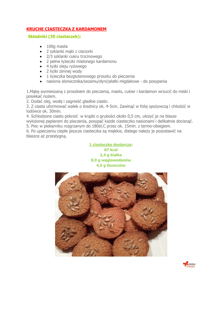 KRUCHE CIASTECZKA Z KARDAMONEM Składniki (30 ciasteczek): 100g masła 2 szklanki mąki z cieciorki 2/3 szklanki cukru trzcinowego 2 pełne łyżeczki mielonego kardamonu 4 łyżki oleju ryżowego 2 łyżki zimnej wody 1 łyżeczka bezglutenowego proszku do pieczenia nasiona słonecznika/sezamu/dyni/płatki migdałowe - do posypania 1.Mąkę wymieszaną z proszkiem do pieczenia, masło, cukier i kardamon wrzucić do miski i posiekać nożem. 2. Dodać olej, wodę i zagnieść gładkie ciasto. 3. Z ciasta uformować wałek o średnicy ok. 4-5cm. Zawinąć w folię spożywczą i chłodzić w lodówce ok. 30min. 4. Schłodzone ciasto pokroić w krążki o grubości około 0,5 cm, ułożyć je na blasze wyłożonej papierem do pieczenia, posypać każde ciasteczko nasionami i delikatnie docisnąć. 5. Piec w piekarniku rozgrzanym do 180st.C przez ok. 15min. z termo-obiegiem. 6. Po upieczeniu ciepłe jeszcze ciasteczka są miękkie, dlatego należy je pozostawić na blaszce aż przestygną. 1 ciasteczko dostarcza: 87 kcal 2,4 g białka 8,9 g węglowodanów 4,5 g tłuszczów