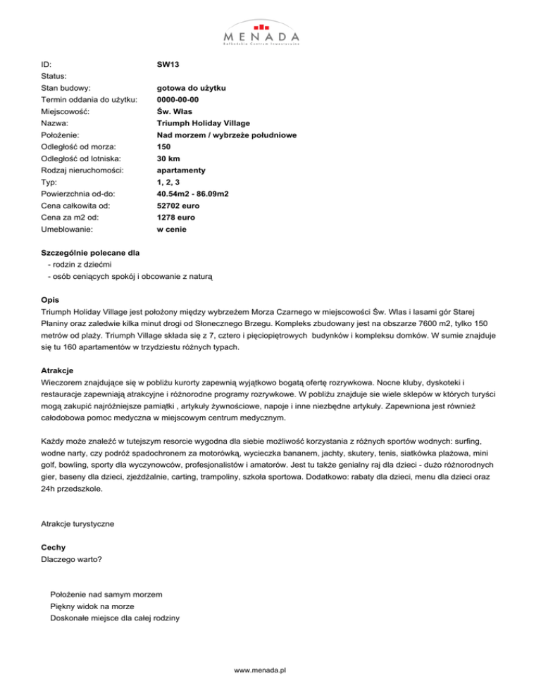 ID: SW13 Status: Stan budowy: gotowa do użytku Termin oddania do użytku: 0000-00-00 Miejscowość: Św. Włas Nazwa: Triumph Holiday Village Położenie: Nad morzem / wybrzeże południowe Odległość od morza: 150 Odległość od lotniska: 30 km Rodzaj nieruchomości: apartamenty Typ: 1, 2, 3 Powierzchnia od-do: 40.54m2 - 86.09m2 Cena całkowita od: 52702 euro Cena za m2 od: 1278 euro Umeblowanie: w cenie Szczególnie polecane dla - rodzin z dziećmi - osób ceniących spokój i obcowanie z naturą Opis Triumph Holiday Village jest położony między wybrzeżem Morza Czarnego w miejscowości Św. Wlas i lasami gór Starej Płaniny oraz zaledwie kilka minut drogi od Słonecznego Brzegu. Kompleks zbudowany jest na obszarze 7600 m2, tylko 150 metrów od plaży. Triumph Village składa się z 7, cztero i pięciopiętrowych budynków i kompleksu domków. W sumie znajduje się tu 160 apartamentów w trzydziestu różnych typach. Atrakcje Wieczorem znajdujące się w pobliżu kurorty zapewnią wyjątkowo bogatą ofertę rozrywkowa. Nocne kluby, dyskoteki i restauracje zapewniają atrakcyjne i różnorodne programy rozrywkowe. W pobliżu znajduje sie wiele sklepów w których turyści mogą zakupić najróżniejsze pamiątki , artykuły żywnościowe, napoje i inne niezbędne artykuły. Zapewniona jest również całodobowa pomoc medyczna w miejscowym centrum medycznym. Każdy może znaleźć w tutejszym resorcie wygodna dla siebie możliwość korzystania z różnych sportów wodnych: surfing, wodne narty, czy podróż spadochronem za motorówką, wycieczka bananem, jachty, skutery, tenis, siatkówka plażowa, mini golf, bowling, sporty dla wyczynowców, profesjonalistów i amatorów. Jest tu także genialny raj dla dzieci - dużo różnorodnych gier, baseny dla dzieci, zjeżdżalnie, carting, trampoliny, szkoła sportowa. Dodatkowo: rabaty dla dzieci, menu dla dzieci oraz 24h przedszkole. Atrakcje turystyczne Cechy Dlaczego warto? Położenie nad samym morzem Piękny widok na morze Doskonałe miejsce dla całej rodziny www.menada.pl Cechy: Centrum fitness i sauna Baseny Salon piękności Kawiarenka internetowa Mini-market Plac zabaw dla dzieci Miejsca zabaw (basen, stoły do tenisa itp.) Bar wodny Restauracja i Piano bar Parking Usługi Z nami nie musisz się martwić o utrzymanie domu w ciągu roku - Dla naszych Klientów zapewniamy utrzymanie nieruchomości, ochronę 24 h przez cały rok, oświetlenie, bezpieczeństwo elektryczne i wodne, naprawy, sprzątanie i czyszczenie części wspólnych, zieleni, czyszczenie apartamentu czy też płatności rachunków. Uzyskiwanie dodatkowych dochodów z ewentualnego wynajmu apartamentu - Zapewniamy bowiem organizację wynajmu apartamentu. Obsługa posprzedażowa Zasady płatności Plan zapłaty 1000 euro - depozyt rezerwacyjny 100% wartości płacone w ciągu trzech tygodni Koszty: Należy pamiętać, iż oprócz ceny za nieruchomość dochodzą koszty związane z opłatą notarialną (jest to około 3,5 - 4% wartości zakupu). www.menada.pl