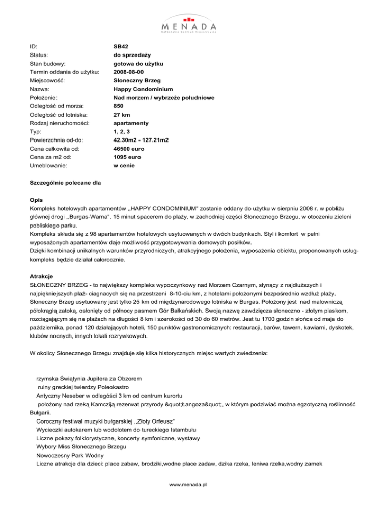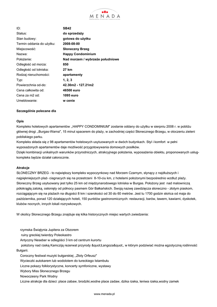 ID: SB42 Status: do sprzedaży Stan budowy: gotowa do użytku Termin oddania do użytku: 2008-08-00 Miejscowość: Słoneczny Brzeg Nazwa: Happy Condominium Położenie: Nad morzem / wybrzeże południowe Odległość od morza: 850 Odległość od lotniska: 27 km Rodzaj nieruchomości: apartamenty Typ: 1, 2, 3 Powierzchnia od-do: 42.30m2 - 127.21m2 Cena całkowita od: 46500 euro Cena za m2 od: 1095 euro Umeblowanie: w cenie Szczególnie polecane dla Opis Kompleks hotelowych apartamentów ,,HAPPY CONDOMINIUM" zostanie oddany do użytku w sierpniu 2008 r. w pobliżu głównej drogi ,,Burgas-Warna", 15 minut spacerem do plaży, w zachodniej części Słonecznego Brzegu, w otoczeniu zieleni pobliskiego parku. Kompleks składa się z 98 apartamentów hotelowych usytuowanych w dwóch budynkach. Styl i komfort w pełni wyposażonych apartamentów daje możliwość przygotowywania domowych posiłków. Dzięki kombinacji unikalnych warunków przyrodniczych, atrakcyjnego położenia, wyposażenia obiektu, proponowanych usługkompleks będzie działał całorocznie. Atrakcje SŁONECZNY BRZEG - to największy kompleks wypoczynkowy nad Morzem Czarnym, słynący z najdłuższych i najpiękniejszych plaż- ciagnacych się na przestrzeni 8-10-ciu km, z hotelami położonymi bezpośrednio wzdłuż plaży. Słoneczny Brzeg usytuowany jest tylko 25 km od międzynarodowego lotniska w Burgas. Położony jest nad malowniczą półokrągłą zatoką, osłonięty od północy pasmem Gór Bałkańskich. Swoją nazwę zawdzięcza słoneczno - złotym piaskom, rozciągającym się na plażach na długości 8 km i szerokości od 30 do 60 metrów. Jest tu 1700 godzin słońca od maja do października, ponad 120 działających hoteli, 150 punktów gastronomicznych: restauracji, barów, tawern, kawiarni, dyskotek, klubów nocnych, innych lokali rozrywkowych. W okolicy Słonecznego Brzegu znajduje się kilka historycznych miejsc wartych zwiedzenia: rzymska Świątynia Jupitera za Obzorem ruiny greckiej twierdzy Poleokastro Antyczny Neseber w odlegóści 3 km od centrum kurortu położony nad rzeką Kamcziją rezerwat przyrody "Łangoza", w którym podziwiać można egzotyczną roślinność Bułgarii. Coroczny festiwal muzyki bułgarskiej ,,Złoty Orfeusz" Wycieczki autokarem lub wodolotem do tureckiego Istambułu Liczne pokazy folklorystyczne, koncerty symfoniczne, wystawy Wybory Miss Słonecznego Brzegu Nowoczesny Park Wodny Liczne atrakcje dla dzieci: place zabaw, brodziki,wodne place zadaw, dzika rzeka, leniwa rzeka,wodny zamek www.menada.pl Dogodne połacznie komunikacyjne:autobusem lub statkiem do Burgas (35 km) i Warny (95 km) Atrakcje turystyczne Cechy Dlaczego warto? Całoroczna eksploatacja obiektu Dogodne położenie Luksusowe wyposażenie Bogata infrastruktura obiektu Cechy: Kompleks połączonych ze sobą basenów-kryty i otwarty wraz z jacuzzi Centrum SPA, sklep z pamiątkami, centrum urody, Restauracja oferująca bogatą, różnorodną kuchnię, parking, zielone tereny rekreacyjne, 24-godzinna ochrona, recepcja Usługi Nasza firma również dba o utrzymanie apartamentu w ciągu roku - Dla naszych Klientów zapewniamy utrzymanie nieruchomości, ochronę 24 h przez cały rok, oświetlenie, bezpieczeństwo elektryczne i wodne, naprawy, sprzątanie i czyszczenie części wspólnych, zieleni, czyszczenie apartamentu czy też płatności rachunków. Uzyskiwanie dodatkowych dochodów z ewentualnego wynajmu apartamentu - Zapewniamy bowiem również organizację wynajmu apartamentu. Obsługa posprzedażowa Zasady płatności Plan płatności: Depozyt: 1000 euro I wpłata: 40% - w ciągu dwóch tygodni od daty podpisania umowy przedwstępnej II wpłata: 60% - w ciągu dwóch miesięcy od daty podpisania umowy przedwstępnej Koszty: www.menada.pl Należy pamiętać, iż oprócz ceny za nieruchomość dochodzi koszt związany z opłatą notarialną u Notariusza (jest to maksymalnie 3,5 - 4% wartości zakupu). www.menada.pl
