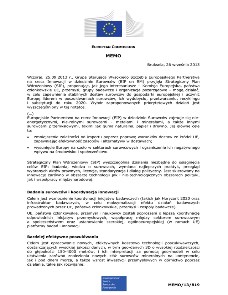 EUROPEAN COMMISSION MEMO Bruksela, 26 września 2013 Wczoraj, 25.09.2013 r., Grupa Sterująca Wysokiego Szczebla Europejskiego Partnerstwa na rzecz Innowacji w dziedzinie Surowców (EIP on RM) przyjęła Strategiczny Plan Wdrożeniowy (SIP), proponując, jak jego interesariusze – Komisja Europejska, państwa członkowskie UE, przemysł, grupy badawcze i organizacje pozarządowe - mogą działać, w celu zapewnienia stabilnych dostaw surowców do gospodarki europejskiej i uczynić Europę liderem w poszukiwaniach surowców, ich wydobyciu, przetwarzaniu, recyklingu i substytucji do roku 2020. Wybór zaproponowanych priorytetowych działań jest wyszczególniony w tej notatce. (…) Europejskie Partnerstwo na rzecz Innowacji (EIP) w dziedzinie Surowców zajmuje się nieenergetycznymi, nie-rolnymi surowcami - metalami i minerałami, a także innymi surowcami przemysłowymi, takimi jak guma naturalna, papier i drewno. Jej główne cele to: zmniejszenie zależności od importu poprzez poprawę warunków dostaw ze źródeł UE, zapewniając efektywność zasobów i alternatywy w dostawach; wysunięcie Europy na czoło w sektorach surowcowych i ograniczenie ich negatywnego wpływu na środowisko i społeczeństwo. Strategiczny Plan Wdrożeniowy (SIP) wyszczególnia działania niezbędne do osiągnięcia celów EIP: badania, wiedza o surowcach, wymiana najlepszych praktyk, przegląd wybranych aktów prawnych, licencje, standaryzacja i dialog polityczny. Jest skierowany na innowacje zarówno w obszarze technologii jak i nie-technologicznych obszarach polityki, jak i współpracy międzynarodowej. Badania surowców i koordynacja innowacji Celem jest wzmocnienie koordynacji inicjatyw badawczych (takich jak Horyzont 2020 oraz infrastruktur badawczych, w celu maksymalizacji efektu działań badawczych prowadzonych przez UE, państwa członkowskie, przemysł i zespoły badawcze). UE, państwa członkowskie, przemysł i naukowcy zostali poproszeni o lepszą koordynację odpowiednich inicjatyw przemysłowych, współpracę między sektorem surowcowym a społeczeństwem oraz ustanowienie szerokiej, ogólnoeuropejskiej (w ramach UE) platformy badań i innowacji. Bardziej efektywne poszukiwania Celem jest opracowanie nowych, efektywnych kosztowo technologii poszukiwawczych, dostarczających wysokiej jakości danych, w tym geo-danych 3D o wysokiej rozdzielczości do głębokości 150-4000 metrów, i ich interpretacji za pomocą geo-modeli w celu ułatwienia zarówno znalezienia nowych złóż surowców mineralnych na kontynencie, jak i pod dnem morza, a także wzrost inwestycji przemysłowych w górnictwo poprzez działania, takie jak rozwijanie: MEMO/13/819 nowych, wysoce efektywnych i opłacalnych technologii badawczych, takich jak techniki wiertnicze, wiercenie zintegrowane i technologie analityczne, badania jednootworowe i wielootworowe, geofizyczne 3D; nowych geo-modeli złóż surowców mineralnych interpretujących w użytecznej formie dane uzyskane ze zintegrowanych geologicznych, geofizycznych, geochemicznych i innych metod. Innowacyjne pozyskiwanie surowców Celem jest umożliwienie pozyskania minerałów i drewna w sposób społecznie akceptowalny, ekologicznie odpowiedzialny i ekonomicznie opłacalny przez opracowanie nowych rozwiązań technologicznych prowadzących do społecznej akceptacji wydobycia, co pozwoli Europie zająć miejsce w czołówce w dziedzinie technologii wydobywczych, takich jak: opracowanie wysoce zautomatyzowanych operacji wydobywczych w celu dotarcia do głębiej położonych złóż i w celu uniknięcia narażenia pracowników pod ziemią. rozwój alternatywnych technik ekstrakcji rud, takich jak ługowanie "in-situ", górnictwo roztworowe lub zastosowanie biotechnologii znacznie obniżających wytwarzanie odpadów górniczych i przeróbczych. Przetwarzanie i rafinacja surowców Celem jest opracowanie nowych, holistycznych koncepcji przetwarzania z wyższą techniczną, gospodarczą, energetyczną i środowiskową wydajnością i elastycznością, wszechstronnością i modułowością przetwarzania różnych surowców o niskiej jakości i/lub złożonych wsadów, takich jak rozwój: nowych elastycznych rozwiązań przetwarzania, aby zapewnić lepszą separację i wyższe wskaźniki odzysku; całościowe projektowanie przetwarzania metali; rozwiązania pełnego odzyskiwania materiału z wsadu z papierni; rozwiązania regeneracji metali technologicznych ze złożonych zużytych produktów oraz opakowań wielomateriałowych w celu zwiększenia poziomu recyklingu. zintegrowanego systemu metalurgicznego do Substytucja surowców Działania obejmują substytucję ciężkich pierwiastków ziem rzadkich (REE) w magnesach, i zastąpienie krytycznych surowców (CRM) w akumulatorach, katalizatorach, w materiałach fotowoltaicznych, takich jak ogniwa słoneczne, które poprawią konkurencyjność europejskiego przemysłu (zwłaszcza w sektorze energetycznym, chemicznym i motoryzacyjnym). Urządzenia elektroniczne: działania obejmują zastąpienie indu w przeźroczystych warstwach przewodzących: ekrany dotykowe, elastyczna elektronika, energia słoneczna i oświetlenie OLED (organiczna dioda emitująca światło używana do tworzenia wyświetlaczy cyfrowych na ekranach telewizorów, monitorów komputerowych, 2 przenośnych urządzeń, takich jak telefony komórkowe, kieszonkowe konsole do gier i PDA). Materiały w warunkach ekstremalnych: substytucja metali refrakcyjnych, zagadnienie, które okazało się bardzo trudne bez utraty wydajności. Działania obejmują substytucję CRM w super żaroodpornych stopach i twardych materiałach. Materiały w dużych ilościach: zastępowanie naturalnej gumy w oponach i CRM w nadstopach i stalach stopowych z rzadkimi elementami. Poprawa struktury i kontekstu dla surowców mineralnych UE: ułatwienia dostaw surowców do UE Celem sekcji nie-technologicznej jest ułatwienie dostaw surowców dla gospodarki i społeczeństwa UE, zmniejszenie zależ