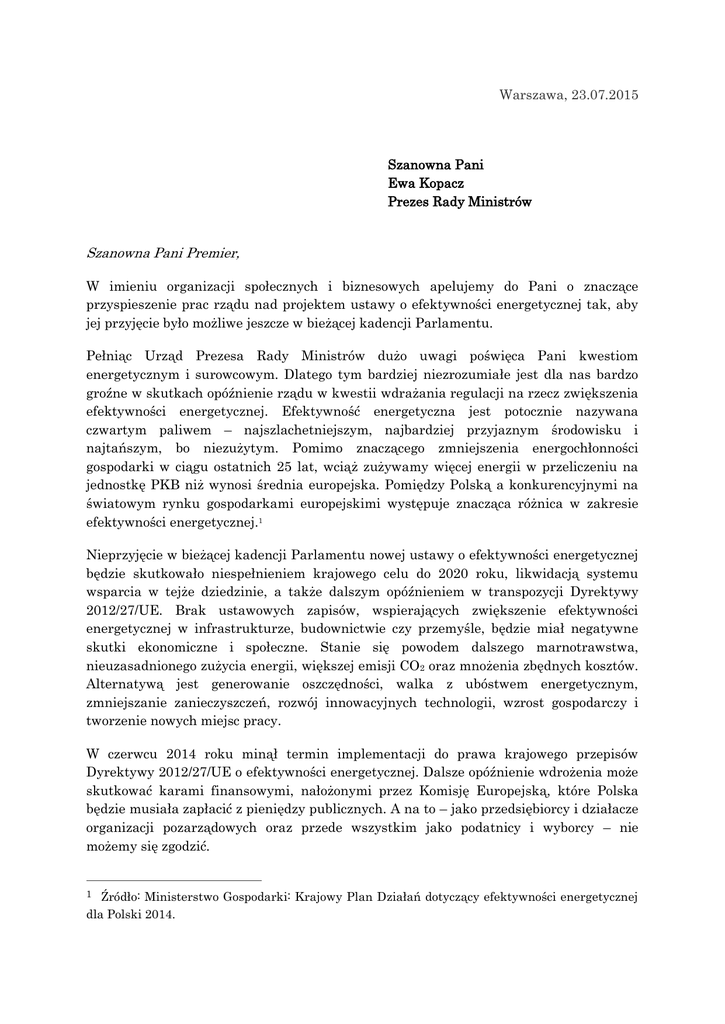 Warszawa, 23.07.2015 Szanowna Pani Ewa Kopacz Prezes Rady Ministrów Szanowna Pani Premier, W imieniu organizacji społecznych i biznesowych apelujemy do Pani o znaczące przyspieszenie prac rządu nad projektem ustawy o efektywności energetycznej tak, aby jej przyjęcie było możliwe jeszcze w bieżącej kadencji Parlamentu. Pełniąc Urząd Prezesa Rady Ministrów dużo uwagi poświęca Pani kwestiom energetycznym i surowcowym. Dlatego tym bardziej niezrozumiałe jest dla nas bardzo groźne w skutkach opóźnienie rządu w kwestii wdrażania regulacji na rzecz zwiększenia efektywności energetycznej. Efektywność energetyczna jest potocznie nazywana czwartym paliwem – najszlachetniejszym, najbardziej przyjaznym środowisku i najtańszym, bo niezużytym. Pomimo znaczącego zmniejszenia energochłonności gospodarki w ciągu ostatnich 25 lat, wciąż zużywamy więcej energii w przeliczeniu na jednostkę PKB niż wynosi średnia europejska. Pomiędzy Polską a konkurencyjnymi na światowym rynku gospodarkami europejskimi występuje znacząca różnica w zakresie efektywności energetycznej.1 Nieprzyjęcie w bieżącej kadencji Parlamentu nowej ustawy o efektywności energetycznej będzie skutkowało niespełnieniem krajowego celu do 2020 roku, likwidacją systemu wsparcia w tejże dziedzinie, a także dalszym opóźnieniem w transpozycji Dyrektywy 2012/27/UE. Brak ustawowych zapisów, wspierających zwiększenie efektywności energetycznej w infrastrukturze, budownictwie czy przemyśle, będzie miał negatywne skutki ekonomiczne i społeczne. Stanie się powodem dalszego marnotrawstwa, nieuzasadnionego zużycia energii, większej emisji CO2 oraz mnożenia zbędnych kosztów. Alternatywą jest generowanie oszczędności, walka z ubóstwem energetycznym, zmniejszanie zanieczyszczeń, rozwój innowacyjnych technologii, wzrost gospodarczy i tworzenie nowych miejsc pracy. W czerwcu 2014 roku minął termin implementacji do prawa krajowego przepisów Dyrektywy 2012/27/UE o efektywności energetycznej. Dalsze opóźnienie wdrożenia może skutkować karami finansowymi, nałożonymi przez Komisję Europejską, które Polska będzie musiała zapłacić z pieniędzy publicznych. A na to – jako przedsiębiorcy i działacze organizacji pozarządowych oraz przede wszystkim jako podatnicy i wyborcy – nie możemy się zgodzić. 1 Źródło: Ministerstwo Gospodarki: Krajowy Plan Działań dotyczący efektywności energetycznej dla Polski 2014. Co więcej, dyrektywa zobowiązuje nas do ograniczenia zużycia energii pierwotnej o 13,6 Mtoe w latach 2010-2020. Tymczasem obecna ustawa o efektywności energetycznej przestanie obowiązywać z końcem 2016 roku, a główny mechanizm oszczędzania energii, czyli system „białych certyfikatów”, będzie działać tylko do marca przyszłego roku. Dlatego z nadzieją przyjęliśmy skierowanie projektu nowej ustawy na posiedzenie Komitetu Stałego RM w dniu 11 czerwca br. Minął miesiąc od powołania zespołu roboczego do omówienia uwag, zgłoszonych do jej tekstu. Tymczasem, chociaż kadencja Parlamentu dobiega końca, to niestety nie widać postępu w pracach, który pozwoliłby na szybkie uchwalenie tego aktu prawnego. Szanowna Pani Premier, projekt ustawy o efektywności energetycznej jest gotowy. Z pewnością nie wszystkie proponowane zapisy są zadawalające, czemu dawaliśmy wyraz w ramach konsultacji publicznych. Jednak biorąc pod uwagę skutki nieprzyjęcia ustawy – ekonomiczne, społeczne oraz na szczeblu unijnym – wzywamy do szybkiego zakończenia prac i skierowania do Sejmu projektu, który będzie zawierał dobrze przemyślany system, stanowiący realną zachętę dla inwestycji w efektywność energetyczną. Do wiadomości: Pan Janusz Piechociński V-ce Prezes Rady Ministrów Minister Gospodarki Sygnatariusze listu: Koalicja Klimatyczna* Zbigniew Karaczun, ekspert ASM – Centrum Badań i Analiz Rynku Sp. z o.o. Małgorzata Walczak-Gomuła, prezes Krajowa Agencja Poszanowania Energii Zbigniew Szpak, prezes Narodowa Agencja Poszanowania Energii S.A. Andrzej Wiszniewski, prezes Związek Pracodawców Polskie Szkło Jan Świątek, prezes Polski Związek Producentów i Przetwórców Izolacji Poliuretanowych PUR i PIR "SIPUR" Maciej Kubanek, sekretarz generalny Platforma Efektywności Energetycznej w Budynkach Katarzyna Chwalbińska-Kusek, przewodnicząca Andrzej Rajkiewicz, przewodniczący Stowarzyszenie na rzecz efektywności energetycznej i rozwoju odnawialnych źródeł energii "HELIOS" Michał Hodana, V-ce prezes Polskie Stowarzyszenie Budownictwa Ekologicznego (PLGBC) Rafał Schurma, prezydent Federacja Pracodawców Polski Zachodniej Władysław Szurek, przewodniczący Stowarzyszenie Producentów Wełny Mineralnej: Szklanej i Skalnej MIWO Henryk Kwapisz, sekretarz zarządu Instytut Spraw Obywatelskich Rafał Górski, prezes Krajowy Związek Zawodowy „Budowlani” Zbigniew Janowski, przewodniczący Stowarzyszenie Gmin Przyjaznych Energii Odnawialnej Lech Kuliński, przewodniczący Fundacja Strefa Zieleni Ewa Sufin-Jacquemart, prezes Zachodniopomorski Oddział Stowarzyszenia Producentów Żywności Metodami Ekologicznymi EKOLAND Edyta Jaroszewska-Nowak, przewodnicząca Stowarzyszenie Dom Drewniany Wojciech Nitka, prezes Stowarzyszenie Wielkopolski Dom Pasywny Bartosz Królczyk, prezes Stowarzyszenie Niesiołowice-Węsiory Kamienne Kręgi Hieronim Więcek, prezes Konfederacja Budownictwa i Nieruchomości Michał Staszewski, prezes * Koalicja Klimatyczna jest porozumieniem 23 organizacji pozarządowych: Fundacja Aeris Futuro, Fundacja ClientEarth Poland, Fundacja Efektywnego Wykorzystania Energii, Fundacja Ekologiczna Arka, Fundacja Ekologiczna Ziemi Legnickiej Zielona Akcja, Fundacja EkoRozwoju FER, Fundacja GAP Polska, Fundacja Greenpeace Polska, Fundacja Na Rzecz Zrównoważonego Rozwoju, Instytut na rzecz Ekorozwoju, Liga Ochrony Przyrody, Polski Klub Ekologiczny Okręg Dolnośląski, Polski Klub Ekologiczny Okręg Górnośląs