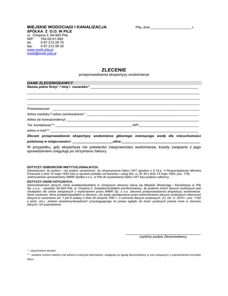 MIEJSKIE WODOCIĄGI I KANALIZACJA Piła, dnia _____________________ r. SPÓŁKA Z O.O. W PILE ul. Chopina 2, 64-920 Piła NIP: 764-02-01-952 tel. 0 67 212 29 74 fax: 0 67 212 59 30 www.mwik.pila.pl [email protected] ZLECENIE przeprowadzenia ekspertyzy wodomierza DANE ZLECENIODAWCY Nazwa pełna firmy* / imię i nazwisko*: ________________________________________________________ __________________________________________________________________________________________ __________________________________________________________________________________________ __________________________________________________________________________________________ Przedstawiciel: _____________________________________________________________________________ Adres siedziby*/ adres zamieszkania* : __________________________________________________________ Adres do korespondencji: _____________________________________________________________________ Tel. kontaktowy**: ________________________________________NIP:_______________________________ adres e-mail**: _____________________________________________________________________________ Zlecam przeprowadzenie ekspertyzy wodomierza głównego mierzącego wodę dla nieruchomości położonej w miejscowości: _____________________ulica:_________________________________________ W przypadku, gdy ekspertyza nie potwierdzi niesprawności wodomierza, koszty związane z jego sprawdzeniem ureguluję po otrzymaniu faktury. DOTYCZY ODBIORCÓW INSTYTUCJONALNYCH: Oświadczam, że jestem / nie jestem uprawniony* do otrzymywania faktur VAT zgodnie z § 19 p. 4 Rozporządzenia Ministra Finansów z dnia 12 maja 1993 roku w sprawie podatku od towarów i usług (Dz. U. Nr 39 z dnia 15 maja 1993, poz. 176). Jednocześnie upoważniamy MWiK Spółka z o.o. w Pile do wystawiania faktur VAT bez podpisu odbiorcy. DOTYCZY OSÓB FIZYCZNYCH: Administratorem danych, które podałam/podałem w niniejszym zleceniu staną się Miejskie Wodociągi i Kanalizacja w Pile Sp. z o.o. - siedziba: 64-920 Piła, ul. Chopina 2. Zostałam/zostałem poinformowany, że podanie moich danych osobowych jest niezbędne dla celów związanych z wykonaniem przez MWiK Sp. z o.o. zlecenia przeprowadzenia ekspertyzy wodomierza. Dane osobowe, które podałam/podałem w zleceniu, nie będą udostępniane przez administratora danych osobowych odbiorcom danych w rozumieniu art. 7 pkt 6 ustawy z dnia 29 sierpnia 1997 r. o ochronie danych osobowych (t.j. Dz. U. 2014 r. poz. 1182 z późn. zm.). Jestem świadomy/świadoma* przysługującego mi prawa wglądu do treści podanych przeze mnie w zleceniu danych i ich poprawiania. ________________________________ czytelny podpis Zleceniodawcy * - niepotrzebne skreślić ** - podanie numeru telefonu lub adresu e-mail jest dobrowolne, następuje za zgodą zleceniodawcy w celu związanym z usprawnieniem kontaktu Stron.