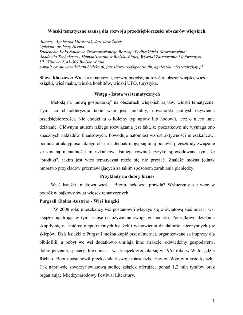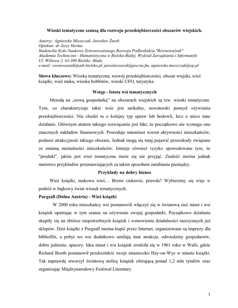 Wioski tematyczne szansą dla rozwoju przedsiębiorczości obszarów wiejskich. Autorzy: Agnieszka Mieszczak, Jarosław Żurek Opiekun: dr Jerzy Herma Studenckie Koło Naukowe Zrównoważonego Rozwoju Podbeskidzia "Równoważnik" Akademia Techniczno - Humanistyczna w Bielsku-Białej, Wydział Zarządzania i Informatyki Ul. Willowa 2, 43-309 Bielsko -Biała e-mail: [email protected], [email protected], [email protected] Słowa kluczowe: Wioska tematyczna, rozwój przedsiębiorczości, obszar wiejski, wieś książki, wieś maku, wioska hobbitów, wioski UFO, turystyka. Wstęp - Istota wsi tematycznych Metodą na „nową gospodarkę” na obszarach wiejskich są tzw. wioski tematyczne. Tym, co charakteryzuje takie wsie jest unikalny, nowatorski pomysł ożywienia przedsiębiorczości. Nie chodzi tu o kolejny typ upraw lub hodowli, lecz o nieco inne działanie. Głównym atutem takiego rozwiązania jest fakt, że początkowo nie wymaga ono znacznych nakładów finansowych. Powoduje natomiast wzrost aktywności mieszkańców, podnosi atrakcyjność takiego obszaru. Jednak mogą się tutaj pojawić przeszkody związane ze zmianą mentalności mieszkańców. Istnieje również ryzyko spowodowane tym, że "produkt", jakim jest wieś tematyczna może się nie przyjąć. Znaleźć można jednak mnóstwo przykładów przemawiających za takim sposobem zarabiania pieniędzy. Przykłady na dobry biznes Wieś książki, makowa wieś… Brzmi ciekawie, prawda? Wybierzmy się więc w podróż w bajkowy świat wiosek tematycznych. Purgsall (Dolna Austria) - Wieś książki W 2000 roku mieszkańcy wsi postanowili włączyć się w światową sieć miast i wsi książek upatrując w tym szanse na ożywienie swojej gospodarki. Początkowo działania skupiły się na zbiórce niepotrzebnych książek i wznowieniu działalności nieczynnych już sklepów. Dziś książki z Purgsall można kupić przez Internet, organizowane są imprezy dla bibliofilii, a pobyt we wsi dodatkowo umilają inne atrakcje, odwiedziny gospodarstw, dobre jedzenie, spacery. Idea miast i wsi książek zrodziła się w 1961 roku w Walii, gdzie Richard Booth postanowił przekształcić swoje miasteczko Hay-on-Wye w miasto książki. Tak naprawdę stworzył światową stolicę książek oferującą ponad 1,2 mln tytułów oraz organizując Międzynarodowy Festiwal Literatury. 1 Armschlag (Dolna Austria) - Wieś maku Jeszcze niedawno wieś bez perspektyw, 35 domostw, 80 mieszkańców. Dziś odwiedza ją 40 tysięcy turystów rocznie. Odtwarzane od 1985 roku uprawy maku stały się źródłem idei Johanna Neuwiesingera, który pomyślał "Stwórzmy makową wieś" i nie miał tu na myśli pozyskiwania opium. Przybyszów przyciągają drewniane atrapy makówek, szyldy z wizerunkami kwiatów maku. Liczne pensjonaty ozdabiane są malowidłami, obrusami, zasłonami, wszystko w "makowej" stylistyce. Ale to nie wszystko, jest i coś dla podniebienia, sandacz w panierce makowej, kluski z makiem, makowy omlet z serem ziołowym, ciasta, torty, likier czekoladowo- makowy i wiele innych. Najwięcej gości przyjeżdża tu w czerwcu i lipcu, gdy kwitną maki oraz w trzecią sobotę września, kiedy to odbywa się makowy odpust. Na odpuście kupić można wspomniane już wyroby kulinarne, ale i makowe produkty sprzedawane pod marką "Mohn amour" ("mohn" z niem. mak), w tym: oleje, kosmetyki (mydła, płyny do kąpieli), wódki, miody, czekolady i same makówki używane przez Niemców i Austriaków do wykonywania ozdób adwentowych. Mieszkańcy nadal inwestują w promocje swojej miejscowości, w 2004 przystąpiono do budowy Ogrodu maków, który dostarcza zarówno doznań estetycznych jak i wiedzy o odmianach maku. Na polskim podwórku też może się udać! Sierakowo Sławieńskie - Wioska hobbitów Wymyślono ją podczas prac nad aktualizacją strategii rozwoju gminy Sianów w woj. zachodniopomorskim w 1999 roku. Zauważono wtedy, że swym wyglądem przypomina Shire, krainę hobbitów z powieści J. R. R. Tolkiena. Wprowadzenie zmian było początkowo trudne – mieszkańcy podchodzili do planu sceptycznie i ciężko było ich przekonać. Pierwsze atrakcje zatem były przygotowywane przez osoby z zewnątrz we współpracy z mieszkańcami wsi, w tym studenci z Politechniki Poznańskiej w ramach wakacyjnych praktyk. Była to m.in. gra fabularna „Tam i z powrotem” oraz „Jarmark hobbitów”. Dwa lata później dzięki nabytej wiedzy mieszkańcy mogli zacząć prowadzić samodzielną działalność. Obecnie w polskim „Hobbitonie” natrafić można na kramy kryte strzechą, warsztaty rzemieślnicze, wieżę widokową, a sami mieszkańcy odgrywają różne role, w tym hobbitów, rycerzy, strażników i elfów. W 2004 roku Sierakowo otrzymało 2 prestiżową "Europejską Nagrodę Odnowy Wsi", promując się tym samym w różnych instytucjach europejskich. Wylotowo, Emilcin - Wioski UFO Jeżeli pragniemy poczuć się jak w znanym filmie „Znaki” M. Night Shyamalan’a powinniśmy odwiedzić Wylotowo, wieś w gminie Mogilno na Kujawach. To tutaj znajdziemy tajemnicze kręgi w zbożu, które są pozostałością po wizytach „obcych”. Miejsce to oprócz gości z poza Ziemi odwiedzają także licznie przedstawiciele różnych stacji telewizyjnych - jak choćby niemiecka RTL, brytyjska BBC, rosyjska NTV. Wieś staje się z dnia na dzień coraz lepiej znana, a co za tym idzie, przyciąga do siebie turystów. Powstał pomysł wybudowania w Wylatowie centrum ufologicznego, którego promocją już teraz zajmują się przedstawiciele gminy Mogilno. Przykład Wylotowa zainspirował Emilcin, wieś w gminie Opole Lubelskie, do postawienia pomnika UFO. Ma to związek z Janem Wolskim, mieszkańcem tej wsi, który to spotkał tam w 1978 roku przybyszów z kosmosu. Tak też doszło do wzajemnej współpracy pomiędzy obiema gminami, której owocem jest propagowanie wiedzy o UFO. Krok po kroku do sukcesu: etapy tworzenia wsi tematycznych. Jak słusznie stwierdza