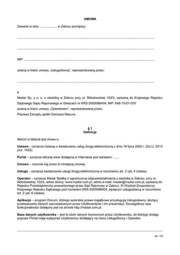UMOWA Zawarta w dniu …................ w Zabrzu pomiędzy: ............................................................................................................................................................ ............................................................................................................................................................ NIP: .................................................................................................................................................... zwaną w treści umowy „Usługobiorcą”, reprezentowaną przez: ............................................................................................................................................................ a Madar Sp. z o. o. z siedzibą w Zabrzu przy ul. Skłodowskiej 12d/3, wpisaną do Krajowego Rejestru Sądowego Sądu Rejonowego w Gliwicach nr KRS 0000088404, NIP: 648-10-07-070 zwaną w treści umowy „Operatorem”, reprezentowaną przez: Prezesa Zarządu spółki Dariusza Mazura. §1 Definicje Ilekroć w tekście jest mowa o: Ustawa – oznacza Ustawę o świadczeniu usług drogą elektroniczną z dnia 18 lipca 2002 r. (Dz.U. 2013 poz. 1422). Portal – oznacza witrynę www dostępną w Internecie pod adresem: …... Umowa – rozumie się przez to niniejszą umowę. Usługa – oznacza świadczenie usługi drogą elektroniczną w rozumieniu art. 2 ust. 4 Ustawy. Operator – oznacza Madar Spółkę z ograniczoną odpowiedzialnością z siedzibą w Zabrzu, przy ul. Skłodowskiej 12d/3, adres strony: www.madar.com.pl, adres e-mail: [email protected], wpisaną do Rejestru Przedsiębiorców prowadzonego przez Sąd Rejonowy w Zabrzu, XI Wydział Gospodarczy Krajowego Rejestru Sądowego pod numerem KRS 0000088404, będącym usługodawcą w rozumieniu art. 2 ust. 6 Ustawy. Aplikacja – program Docum, którego autorskie prawa majątkowe przysługują Usługodawcy, służący przetwarzaniu danych wprowadzanych przez Użytkowników i ich prezentacji. Szczegółowy opis funkcjonalności dostępny jest na stronie http://madar.com.pl. Baza danych użytkownika – jest to zbiór danych tworzonych przez Użytkownika, do którego dostęp poprzez Portal mają wyłącznie Użytkownicy działający na rzecz Usługobiorcy i Operator. str. 1/5 Użytkownik – oznacza każdą osobę lub urządzenie, korzystające z usługi świadczonej drogą elektroniczną, działającą w imieniu Usługobiorcy. Konto użytkownika – zdefiniowany użytkownik w programie w zakresie: loginu i hasła, uprawnień w zakresie dostępu do opcji programu, prawa do modyfikacji, dopisywania i funkcji administracyjnych. Regulamin – oznacza regulamin świadczenia usług drogą elektroniczną „Docum”, dostępnym pod adresem http:/madar.com.pl/legal/RegulaminDocum.pdf. §2 Zakres usług świadczonych elektronicznie przez Operatora 2.1. Przedmiotem Umowy jest świadczenie Usługi polegające na udostępnianiu przez Operatora Aplikacji, umożliwienie autoryzacji, przekazu danych oraz przechowywanie przekazanych i przetworzonych danych, zgodnie z Regulaminem usługi. 2.2. Usługodawca nie gwarantuje spełnienia oczekiwań Usługobiorcy w zastosowaniu Aplikacji w prowadzonej przez niego działalności. W interesie Usługobiorcy leży uprzednie zapoznanie się z możliwościami i sposobem funkcjonowania Aplikacji w wersji demonstracyjnej. Usługodawca zastrzega, że Aplikacja jest udostępniana Usługobiorcy „as it is”, czyli taką, jaka jest. Dostosowanie Aplikacji do konkretnych potrzeb Usługobiorcy jest dokonywane na podstawie oddzielnej umowy. 2.3. Na dane Konto użytkownika może być zalogowany jednocześnie tylko jeden Użytkownik. §3 Odpłatność za wykonane usługi elektroniczne 3.1. Za założoną Bazę danych użytkownika pobierana jest opłata za każdy miesiąc, w wysokości zależnej od wybranego pakietu: 3.1.1. pakiet trzech Kont użytkownika – 50 zł netto miesięcznie, 3.1.2. pakiet pięciu Kont użytkownika – 60 zł netto miesięcznie, 3.1.3. pakiet dziesięciu Kont użytkownika – 100 zł netto miesięcznie. 3.2. Usługobiorca ma prawo aktywować większą ilość dowolnych pakietów Kont użytkownika wówczas miesięczna opłata stanowi sumę opłat wszystkich aktywowanych pakietów. 3.3. Odpłatność na rzecz Operatora, o której mowa § 3 ust. 3.1. podlega fakturowaniu do 10-tego każdego miesiąca, zgodnie z ilością Kont użytkowników występujących w programie w dniu wystawienia faktury, z terminem wymagalności 7 (siedem) dni od daty wystawienia faktury. 3.4. Operator zastrzega sobie prawo wystawiania faktur elektronicznych. 3.5. Strony oświadczają, że są podatnikami podatku od towarów i usług: 3.6. Po upływie dwóch lat od daty zawarcia Umowy Usługobiorca w przypadku rozwiązania Umowy może nabyć licencję na Aplikację w cenie upgrade (cenie aktualizacji), zgodnie cennikiem obowiązującym w dniu nabycia. 3.7. Dodatkowe usługi, w szczególności udostępnianie archiwizacji na innym nośniku, wprowadzanie i modyfikacja danych na zlecenie klienta mogą być dodatkowo płatne. Operator każdorazowo uprzedzi Usługobiorcę o zakwalifikowaniu usługi jako płatnej. §4 Warunki rozwiązania umowy str. 2/5 4. 1. Umowę niniejszą zawarto na czas nieokreślony. 4.2. Operator zastrzega sobie prawo do rozwiązania Umowy w trybie natychmiastowym, jeżeli Użytkownik: 4.2.1. Swoimi działaniami narusza bezpieczeństwo danych znajdujących się w Portalu lub podejmuje nieuprawnioną próbę dostępu do Portalu. 4.2.2. Dokonuje czynności niezgodnych z prawem, w zakresie związanym z udostępnianą Usługą. 4.2.3. Działa na szkodę operatora lub innych Użytkowników Portalu. 4.2.4. Wykorzystuje Portal do rozpowszechniania treści obraźliwych i pornograficznych lub treści o charakterze bezprawnym. 4.3. Rozwiązanie Umowy jest równoznaczne z usunięciem Bazy danych użytkownika w Portalu oraz skasowaniem danych Usługobiorcy. 4.4. Umowa może by