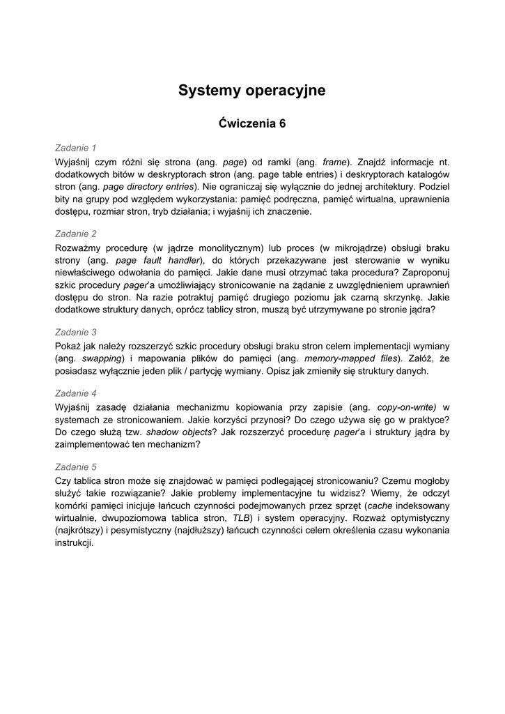Systemy operacyjne Ćwiczenia 6 Zadanie 1 Wyjaśnij czym różni się strona (ang. page) od ramki (ang. frame). Znajdź informacje nt. dodatkowych bitów w deskryptorach stron (ang. page table entries) i deskryptorach katalogów stron (ang. page directory entries). Nie ograniczaj się wyłącznie do jednej architektury. Podziel bity na grupy pod względem wykorzystania: pamięć podręczna, pamięć wirtualna, uprawnienia dostępu, rozmiar stron, tryb działania; i wyjaśnij ich znaczenie. Zadanie 2 Rozważmy procedurę (w jądrze monolitycznym) lub proces (w mikrojądrze) obsługi braku strony (ang. page fault handler), do których przekazywane jest sterowanie w wyniku niewłaściwego odwołania do pamięci. Jakie dane musi otrzymać taka procedura? Zaproponuj szkic procedury pager’a umożliwiający stronicowanie na żądanie z uwzględnieniem uprawnień dostępu do stron. Na razie potraktuj pamięć drugiego poziomu jak czarną skrzynkę. Jakie dodatkowe struktury danych, oprócz tablicy stron, muszą być utrzymywane po stronie jądra? Zadanie 3 Pokaż jak należy rozszerzyć szkic procedury obsługi braku stron celem implementacji wymiany (ang. swapping) i mapowania plików do pamięci (ang. memory-mapped files). Załóż, że posiadasz wyłącznie jeden plik / partycję wymiany. Opisz jak zmieniły się struktury danych. Zadanie 4 Wyjaśnij zasadę działania mechanizmu kopiowania przy zapisie (ang. copy-on-write) w systemach ze stronicowaniem. Jakie korzyści przynosi? Do czego używa się go w praktyce? Do czego służą tzw. shadow objects? Jak rozszerzyć procedurę pager’a i struktury jądra by zaimplementować ten mechanizm? Zadanie 5 Czy tablica stron może się znajdować w pamięci podlegającej stronicowaniu? Czemu mogłoby służyć takie rozwiązanie? Jakie problemy implementacyjne tu widzisz? Wiemy, że odczyt komórki pamięci inicjuje łańcuch czynności podejmowanych przez sprzęt (cache indeksowany wirtualnie, dwupoziomowa tablica stron, TLB) i system operacyjny. Rozważ optymistyczny (najkrótszy) i pesymistyczny (najdłuższy) łańcuch czynności celem określenia czasu wykonania instrukcji. Zadanie 6 Rozważmy cztery rodzaje polityki związane z zarządzaniem pamięcią wirtualną. Wyjaśnij kiedy mają zastosowanie polityka ładowania (ang. fetch), przydziału miejsca (ang. placement), zastępowania (ang. replacement), usuwania (ang. cleaning)? Poznaliśmy już stronicowanie na żądanie. Czym różni się od niego stronicowanie wstępne (ang. prepaging) i kiedy ma sens? Zadanie 7 O zasadzie lokalności czasowej i przestrzennej mówiliśmy już w odniesieniu do pamięci podręcznej. Wykaż, że zasada ta ma również wpływ na działanie stronicowania z pamięcią wirtualną. Wyjaśnij pojęcia: zbiór roboczy (ang. working set) i zestaw rezydentny (ang. resident set). Co zasada lokalności odwołań mówi o tym, jak zbiory te zmieniają się w czasie działania procesu? Znajdź i opisz wykres zależności braków stron (ang. page fault) od rozmiaru ramki dla typowego programu. Przy założeniu, że ilość dostępnych stron rośnie odwrotnie proporcjonalnie do ich wielkości, czemu w systemach z bardzo małymi ramkami występuje (statystycznie) mniej braków stron niż w systemach z ramkami o średniej wielkości? Zadanie 8 Rozważmy system ze stałym przydziałem zbioru rezydentnego. Mamy pamięć fizyczną składającą się z 4 ramek oraz pamięć wirtualną złożoną z 8 stron. Jedyny wykonujący się proces generuje następujący ciąg dostępów do stron: 7, 0, 1, 2, 0, 3, 0, 4, 2, 3, 0, 3, 2. Pokaż, jak w tym systemie działają następujące algorytmy zastępowania ramek: FIFO, LRU, CLOCK. Który z nich generuje najmniej braków stron? Załóż, że zastąpienie ramki zachodzi dopiero w momencie zapełnienia całej pamięci fizycznej. Zadanie 9 Rozważmy buforowanie stron - tj. jeśli strony zostały oznaczone do zastąpienia w wyniku stosowania konkretnej strategii (np. FIFO), to nie są usuwane od razu, ale trzyma się je przez jakiś czas w pamięci operacyjnej. Wymień zalety tego rozwiązania w kontekście lokalności i zarządzania zbiorem roboczym, oraz polityki usuwania stron. Jak z buforowania stron może skorzystać algorytm zarządzający zbiorem rezydentnym zmiennego rozmiaru, działający w obrębie całego systemu? Do czego służy blokowanie stron w pamięci operacyjnej? Zadanie 10 Rozważmy system ze stronicowaniem na żądanie, w którym stopień wieloprogramowości wynosi 4 (programy). W pewnym momencie czasu w systemie zbadano procent wykorzystania procesora i dyskowej pamięci wirtualnej. Dla każdego z poniższych pomiarów odpowiedz, czy należy zwiększyć / zmniejszyć stopień wieloprogramowości i czy zastowanie stronicowania nie przyczyniło się do spadku wydajności systemu: ● CPU: 13%, IO: 97%, ● CPU: 87%, IO: 3%, ● CPU: 13%, IO: 3%. Wyjaśnij pojęcie szamotania (ang. trashing). Wymień kilka możliwych zachowań systemu operacyjnego celem obniżenia stopnia wieloprogramowości po wykryciu tego zjawiska?