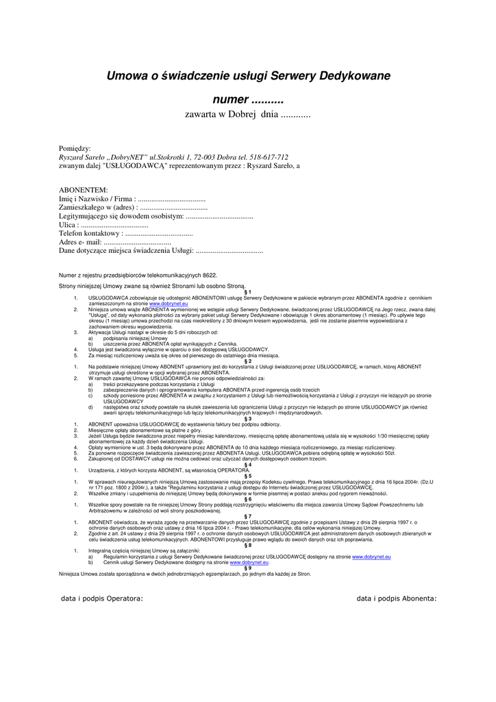 Umowa o świadczenie usługi Serwery Dedykowane numer .......... zawarta w Dobrej dnia ............ Pomiędzy: Ryszard Sareło „DobryNET” ul.Stokrotki 1, 72-003 Dobra tel. 518-617-712 zwanym dalej "USŁUGODAWCĄ" reprezentowanym przez : Ryszard Sareło, a ABONENTEM: Imię i Nazwisko / Firma : .................................... Zamieszkałego w (adres) : .................................... Legitymującego się dowodem osobistym: .................................... Ulica : .................................... Telefon kontaktowy : .................................... Adres e- mail: .................................... Dane dotyczące miejsca świadczenia Usługi: .................................... Numer z rejestru przedsiębiorców telekomunikacyjnych 8622. Strony niniejszej Umowy zwane są również Stronami lub osobno Stroną. §1 USŁUGODAWCA zobowiązuje się udostępnić ABONENTOWI usługę Serwery Dedykowane w pakiecie wybranym przez ABONENTA zgodnie z cennikiem zamieszczonym na stronie www.dobrynet.eu 2. Niniejsza umowa wiąże ABONENTA wymienionej we wstępie usługi Serwery Dedykowane, świadczonej przez USŁUGODAWCĘ na Jego rzecz, zwana dalej "Usługą", od daty wykonania płatności za wybrany pakiet usługi Serwery Dedykowane i obowiązuje 1 okres abonamentowy (1 miesiąc). Po upływie tego okresu (1 miesiąc) umowa przechodzi na czas nieokreślony z 30 dniowym kresem wypowiedzenia, jeśli nie zostanie pisemnie wypowiedziana z zachowaniem okresu wypowiedzenia. 3. Aktywacja Usługi nastąpi w okresie do 5 dni roboczych od: a) podpisania niniejszej Umowy b) uiszczenia przez ABONENTA opłat wynikających z Cennika. 4. Usługa jest świadczona wyłącznie w oparciu o sieć dostępową USŁUGODAWCY. 5. Za miesiąc rozliczeniowy uważa się okres od pierwszego do ostatniego dnia miesiąca. §2 1. Na podstawie niniejszej Umowy ABONENT uprawniony jest do korzystania z Usługi świadczonej przez USŁUGODAWCĘ, w ramach, której ABONENT otrzymuje usługi określone w opcji wybranej przez ABONENTA. 2. W ramach zawartej Umowy USŁUGODAWCA nie ponosi odpowiedzialności za: a) treści przekazywane podczas korzystania z Usługi b) zabezpieczenie danych i oprogramowania komputera ABONENTA przed ingerencją osób trzecich c) szkody poniesione przez ABONENTA w związku z korzystaniem z Usługi lub niemożliwością korzystania z Usługi z przyczyn nie leżących po stronie USŁUGODAWCY d) następstwa oraz szkody powstałe na skutek zawieszenia lub ograniczenia Usługi z przyczyn nie leżących po stronie USŁUGODAWCY jak również awarii sprzętu telekomunikacyjnego lub łączy telekomunikacyjnych krajowych i międzynarodowych. §3 1. ABONENT upoważnia USŁUGODAWCĘ do wystawienia faktury bez podpisu odbiorcy. 2. Miesięczne opłaty abonamentowe są płatne z góry. 3. Jeżeli Usługa będzie świadczona przez niepełny miesiąc kalendarzowy, miesięczną opłatę abonamentową ustala się w wysokości 1/30 miesięcznej opłaty abonamentowej za każdy dzień świadczenia Usługi. 4. Opłaty wymienione w ust. 3 będą dokonywane przez ABONENTA do 10 dnia każdego miesiąca rozliczeniowego, za miesiąc rozliczeniowy. 5. Za ponowne rozpoczęcie świadczenia zawieszonej przez ABONENTA Usługi, USŁUGODAWCA pobiera odrębną opłatę w wysokości 50zł. 6. Zakupionej od DOSTAWCY usługi nie można cedować oraz użyczać danych dostępowych osobom trzecim. §4 1. Urządzenia, z których korzysta ABONENT, są własnością OPERATORA. §5 1. W sprawach nieuregulowanych niniejszą Umową zastosowanie mają przepisy Kodeksu cywilnego, Prawa telekomunikacyjnego z dnia 16 lipca 2004r. (Dz.U nr 171 poz. 1800 z 2004r.), a także "Regulaminu korzystania z usługi dostępu do Internetu świadczonej przez USŁUGODAWCĘ. 2. Wszelkie zmiany i uzupełnienia do niniejszej Umowy będą dokonywane w formie pisemnej w postaci aneksu pod rygorem nieważności. §6 1. Wszelkie spory powstałe na tle niniejszej Umowy Strony poddają rozstrzygnięciu właściwemu dla miejsca zawarcia Umowy Sądowi Powszechnemu lub Arbitrażowemu w zależności od woli strony poszkodowanej. §7 1. ABONENT oświadcza, że wyraża zgodę na przetwarzanie danych przez USŁUGODAWCĘ zgodnie z przepisami Ustawy z dnia 29 sierpnia 1997 r. o ochronie danych osobowych oraz ustawy z dnia 16 lipca 2004 r. - Prawo telekomunikacyjne, dla celów wykonania niniejszej Umowy. 2. Zgodnie z art. 24 ustawy z dnia 29 sierpnia 1997 r. o ochronie danych osobowych USŁUGODAWCA jest administratorem danych osobowych zbieranych w celu świadczenia usług telekomunikacyjnych. ABONENTOWI przysługuje prawo wglądu do swoich danych oraz ich poprawiania. §8 1. Integralną częścią niniejszej Umowy są załączniki: a) Regulamin korzystania z usługi Serwery Dedykowane świadczonej przez USŁUGODAWCĘ dostępny na stronie www.dobrynet.eu b) Cennik usługi Serwery Dedykowane dostępny na stronie www.dobrynet.eu §9 Niniejsza Umowa została sporządzona w dwóch jednobrzmiących egzemplarzach, po jednym dla każdej ze Stron. 1. data i podpis Operatora: data i podpis Abonenta: