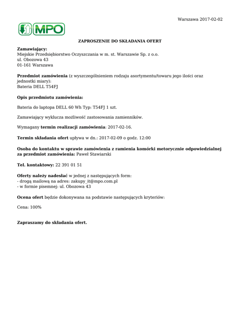 Warszawa 2017-02-02 ZAPROSZENIE DO SKŁADANIA OFERT Zamawiający: Miejskie Przedsiębiorstwo Oczyszczania w m. st. Warszawie Sp. z o.o. ul. Obozowa 43 01-161 Warszawa Przedmiot zamówienia (z wyszczególnieniem rodzaju asortymentu/towaru jego ilości oraz jednostki miary): Bateria DELL T54FJ Opis przedmiotu zamówienia: Bateria do laptopa DELL 60 Wh Typ: T54FJ 1 szt. Zamawiający wyklucza możliwość zastosowania zamienników. Wymagany termin realizacji zamówienia: 2017-02-16. Termin składania ofert upływa w dn.: 2017-02-09 o godz. 12:00 Osoba do kontaktu w sprawie zamówienia z ramienia komórki metorycznie odpowiedzialnej za przedmiot zamówienia: Paweł Stawiarski Tel. kontaktowy: 22 391 01 51 Oferty należy nadesłać w jednej z następujących form: - drogą mailową na adres: [email protected] - w formie pisemnej: ul. Obozowa 43 Ocena ofert będzie dokonywana na podstawie następujących kryteriów: Cena: 100% Zapraszamy do składania ofert.