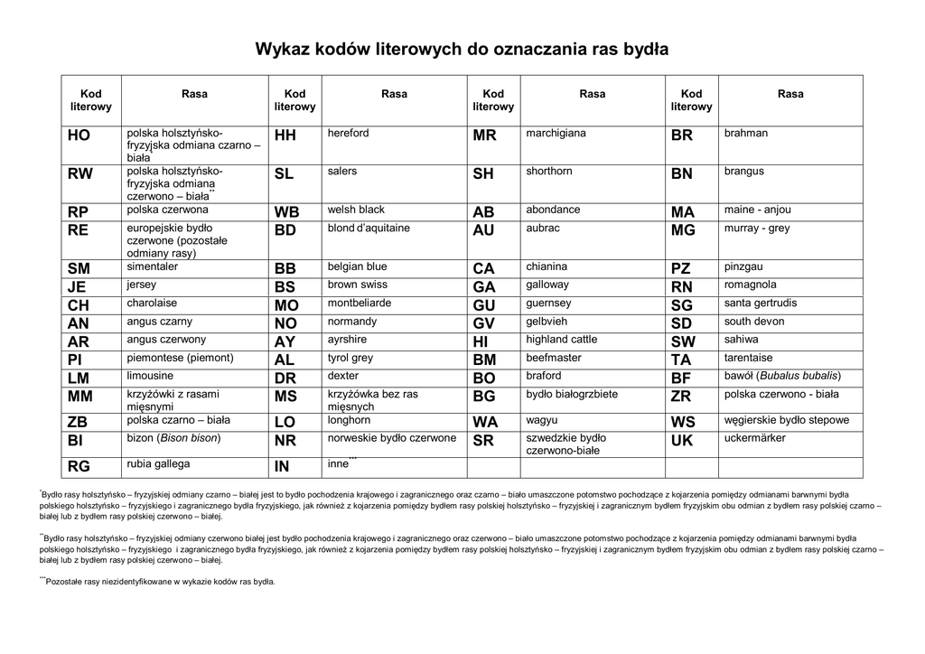 Wykaz kodów literowych do oznaczania ras bydła Kod literowy HO RW RP RE SM JE CH AN AR PI LM MM ZB BI RG Rasa polska holsztyńskofryzyjska odmiana czarno – biała* polska holsztyńskofryzyjska odmiana ** czerwono – biała polska czerwona europejskie bydło czerwone (pozostałe odmiany rasy) simentaler jersey charolaise angus czarny angus czerwony piemontese (piemont) limousine krzyżówki z rasami mięsnymi polska czarno – biała Kod literowy Rasa Kod literowy Rasa Kod literowy Rasa HH hereford MR marchigiana BR brahman SL salers SH shorthorn BN brangus WB BD welsh black AB AU abondance MA MG maine - anjou BB BS MO NO AY AL DR MS belgian blue CA GA GU GV HI BM BO BG chianina PZ RN SG SD SW TA BF ZR pinzgau WA SR wagyu WS UK węgierskie bydło stepowe bizon (Bison bison) LO NR rubia gallega IN blond d’aquitaine brown swiss montbeliarde normandy ayrshire tyrol grey dexter krzyżówka bez ras mięsnych longhorn norweskie bydło czerwone aubrac galloway guernsey gelbvieh highland cattle beefmaster braford bydło białogrzbiete szwedzkie bydło czerwono-białe murray - grey romagnola santa gertrudis south devon sahiwa tarentaise bawół (Bubalus bubalis) polska czerwono - biała uckermärker inne*** * Bydło rasy holsztyńsko – fryzyjskiej odmiany czarno – białej jest to bydło pochodzenia krajowego i zagranicznego oraz czarno – biało umaszczone potomstwo pochodzące z kojarzenia pomiędzy odmianami barwnymi bydła polskiego holsztyńsko – fryzyjskiego i zagranicznego bydła fryzyjskiego, jak również z kojarzenia pomiędzy bydłem rasy polskiej holsztyńsko – fryzyjskiej i zagranicznym bydłem fryzyjskim obu odmian z bydłem rasy polskiej czarno – białej lub z bydłem rasy polskiej czerwono – białej. ** Bydło rasy holsztyńsko – fryzyjskiej odmiany czerwono białej jest bydło pochodzenia krajowego i zagranicznego oraz czerwono – biało umaszczone potomstwo pochodzące z kojarzenia pomiędzy odmianami barwnymi bydła polskiego holsztyńsko – fryzyjskiego i zagranicznego bydła fryzyjskiego, jak również z kojarzenia pomiędzy bydłem rasy polskiej holsztyńsko – fryzyjskiej i zagranicznym bydłem fryzyjskim obu odmian z bydłem rasy polskiej czarno – białej lub z bydłem rasy polskiej czerwono – białej. *** Pozostałe rasy niezidentyfikowane w wykazie kodów ras bydła.