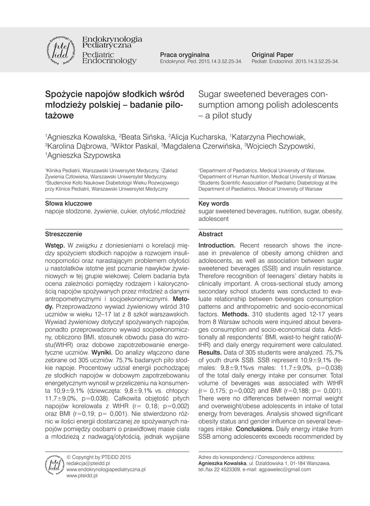 Praca oryginalna Endokrynol. Ped. 2015.14.3.52.25-34. Spożycie napojów słodkich wśród młodzieży polskiej – badanie pilotażowe Original Paper Pediatr. Endocrinol. 2015.14.3.52.25-34. Sugar sweetened beverages consumption among polish adolescents – a pilot study Agnieszka Kowalska, 2Beata Sińska, 2Alicja Kucharska, 1Katarzyna Piechowiak, 3 Karolina Dąbrowa, 3Wiktor Paskal, 3Magdalena Czerwińska, 3Wojciech Szypowski, 1 Agnieszka Szypowska 1 Klinika Pediatrii, Warszawski Uniwersytet Medyczny, 2Zakład Żywienia Człowieka, Warszawski Uniwersytet Medyczny, 3 Studenckie Koło Naukowe Diabetologii Wieku Rozwojowego przy Klinice Pediatrii, Warszawski Uniwersytet Medyczny 1 Słowa kluczowe napoje słodzone, żywienie, cukier, otyłość,młodzież Key words sugar sweetened beverages, nutrition, sugar, obesity, adolescent Streszczenie Abstract Wstęp. W związku z doniesieniami o korelacji między spożyciem słodkich napojów a rozwojem insulinooporności oraz narastającym problemem otyłości u nastolatków istotne jest poznanie nawyków żywieniowych w tej grupie wiekowej. Celem badania była ocena zależności pomiędzy rodzajem i kalorycznością napojów spożywanych przez młodzież a danymi antropometrycznymi i socjoekonomicznymi. Metody. Przeprowadzono wywiad żywieniowy wśród 310 uczniów w wieku 12–17 lat z 8 szkół warszawskich. Wywiad żywieniowy dotyczył spożywanych napojów, ponadto przeprowadzono wywiad socjoekonomiczny, obliczono BMI, stosunek obwodu pasa do wzrostu(WtHR) oraz dobowe zapotrzebowanie energetyczne uczniów. Wyniki. Do analizy włączono dane zebrane od 305 uczniów. 75,7% badanych piło słodkie napoje. Procentowy udział energii pochodzącej ze słodkich napojów w dobowym zapotrzebowaniu energetycznym wynosił w przeliczeniu na konsumenta 10,9±9,1% (dziewczęta: 9,8±9,1% vs. chłopcy: 11,7±9,0%, p=0,038). Całkowita objętość pitych napojów korelowała z WtHR (r= 0,18; p=0,002) oraz BMI (r=0,19; p= 0,001). Nie stwierdzono różnic w ilości energii dostarczanej ze spożywanych napojów pomiędzy osobami o prawidłowej masie ciała a młodzieżą z nadwagą/otyłością, jednak wypijane Introduction. Recent research shows the increase in prevalence of obesity among children and adolescents, as well as association between sugar sweetened beverages (SSB) and insulin resistance. Therefore recognition of teenagers’ dietary habits is clinically important. A cross-sectional study among secondary school students was conducted to evaluate relationship between beverages consumption patterns and anthropometric and socio-economical factors. Methods. 310 students aged 12-17 years from 8 Warsaw schools were inquired about beverages consumption and socio-economical data. Additionally all respondents’ BMI, waist-to height ratio(WtHR) and daily energy requirement were calculated. Results. Data of 305 students were analyzed. 75,7% of youth drunk SSB. SSB represent 10,9±9,1% (females: 9,8±9,1%vs males: 11,7±9,0%, p=0,038) of the total daily energy intake per consumer. Total volume of beverages was associated with WtHR (r= 0,175; p=0,002) and BMI (r=0,188; p= 0,001). There were no differences between normal weight and overweight/obese adolescents in intake of total energy from beverages. Analysis showed significant obesity status and gender influence on several beverages intake. Conclusions. Daily energy intake from SSB among adolescents exceeds recommended by 1 © Copyright by PTEiDD 2015 [email protected] www.endokrynologiapediatryczna.pl www.pteidd.pl Department of Paediatrics, Medical University of Warsaw, Department of Human Nutrition, Medical University of Warsaw, 3 Students Scientific Association of Paediatric Diabetology at the Department of Paediatrics, Medical University of Warsaw 2 Adres do korespondencji / Correspondence address: Agnieszka Kowalska, ul. Działdowska 1, 01-184 Warszawa, tel./fax 22 4523309, e-mail: [email protected] objętości niektórych grup napojów różniły się istotnie w zależności od płci lub kategorii wagowej. Wnioski. Spożycie przez młodzież cukru w słodkich napojach przekracza zalecane przez WHO dobowe spożycie energii pochodzącej z cukrów łatwo przyswajalnych. Duży odsetek dzieci pijących słodkie napoje sugeruje konieczność podjęcia działań edukacyjnych oraz dalszych badań. WHO energy intake from free sugars. A significant number of SSB consumers suggest the necessity of more profound studies. Moreover, education in healthy diet is required. Pediatr. Endocrinol. 2015.14.3.52.25-34. © Copyright by PTEiDD 2015 Endokrynol. Ped. 2015.14.3.52.25-34. © Copyright by PTEiDD 2015 Wstęp W ciągu ostatnich lat obserwowany jest wzrost występowania otyłości wśród dzieci i nastolatków [1,2]. Wśród przyczyn wymieniane są jakość i wartość energetyczna spożywanych pokarmów, nawyki żywieniowe oraz szeroko pojęty styl życia [3]. W porównaniu z dziećmi o prawidłowej masie ciała dzieci otyłe są zagrożone większym ryzykiem pozostania otyłymi w ciągu życia [4]. Związek pomiędzy spożyciem słodkich napojów a rozwojem cukrzycy [5], nadwagi i otyłości[6] oraz chorób układu krążenia [7] jest dobrze udokumentowany u dorosłych. W przypadku dzieci i młodzieży w metaanalizie kohortowych badań prospektywnych opisywano związek pomiędzy przyrostem masy ciała a spożyciem słodkich napojów [6]. Mimo iż słodkie napoje mają dość niską gęstość energetyczną, istnieje tendencja do zastępowania dodawanej do napojów sacharozy syropem wysokofruktozowym, ponadto soki i napoje owocowe zawierają stosunkowo dużo naturalnej fruktozy [8]. Metabolizm fruktozy bardziej sprzyja lipogenezie w porównaniu z glukozą [9], jej nadmierne spożycie jest wymieniane wśród czynników ryzyka rozwoju m.in niealkoholowego stłuszczenia wątroby, chorób układu krążenia [10] i zespołu metabolicznego [11]. W najnowszych rekomendacjach WHO dotyczących spożycia cukru zalecane jest, a