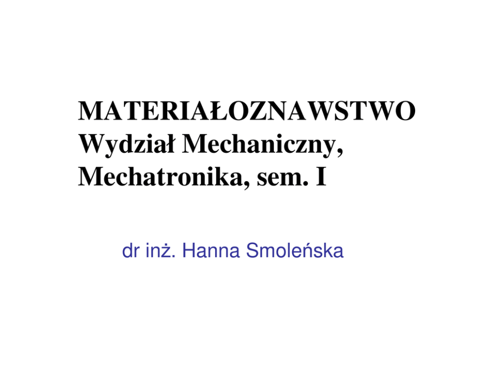 MATERIAŁOZNAWSTWO Wydział Mechaniczny, Mechatronika, sem. I dr inż. Hanna Smoleńska Charakterystyka ciał stałych • Materia i jej składniki • Główne grupy materiałów inżynierskich • Dobór materiałów Materia i jej składniki Materia zbudowana jest z cząstek elementarnych, liczba których obecnie wynosi ponad czterysta. Cząstki elementarne dzieli się na, różniące się masą, ładunkiem oraz liczbami kwantowymi: • Kwarki - są cząstkami elementarnymi istniejącymi wyłącznie w grupach po dwa (mezony) lub po trzy (bariony) i spajanymi przez oddziaływania silne przekazywane przez kwanty energii zwane gluonami, • Leptony - mogą istnieć samodzielnie. Najbardziej znane cząstek materii to atomy, składające się z: • Elektronów o ładunku elektrycznym ujemnym (należących do leptonów), • Protonów o ładunku elektrycznym dodatnim (składających się z kwarków), • Neutronów - elektrycznie obojętnych (także składający się z trzech kwarków takich samych, jak w elektronie, ale w innych proporcjach). Elementy struktury ciała stałego: Budowa atomu Wiązania między atomami (dlaczego metale przewodzą prąd a ceramika nie?) Układ atomów w przestrzeni (dlaczego diament jest twardy a grafit nie?) Mikrostruktura, tj. elementy struktury o widoczne przy użyciu mikroskopu świetlnego Makrostruktura, tj. tj. elementy struktury widoczne nieuzbrojonym okiem lub przy użyciu urządzeń dających powiększenie do około 40 x BUDOWA ATOMU •Atomy składają się z jądra i rozmieszczonych wokół niego elektronów. Jądro złożone jest z protonów i neutronów, zwanych łącznie nukleonami. •Liczba protonów w jądrze równa jest liczbie elektronów i określana jest jako liczba atomowa. •Elektrony znajdujące się na ostatniej powłoce elektronowej noszą nazwę elektronów walencyjnych lub elektronów wartościowości. Uproszczony model budowy atomu sodu Elektron walencyjny Jądro •Pierwiastek chemiczny stanowi zbiór atomów jednakowych ładunkach jąder (liczbie atomowej). o •Liczba nukleonów w jądrze definiowana jest jako liczba masowa. •Odmiany pierwiastków chemicznych różniących się liczbą masową nazywamy izotopami. •Pierwiastki chemiczne są mieszaniną izotopów, w związku z czym ich masa atomowa nie jest liczbą całkowitą. •Masa atomowa pierwiastka chemicznego określana jest jako stosunek średniej masy atomu danego pierwiastka, obliczonej z uwzględnieniem istnienia izotopów, do masy 1/12 atomu izotopu węgla o liczbie masowej równej 12. Liczba izotopów jest niekiedy znaczna, przykładowo uran posiada 5 izotopów, a mangan – 4. •Pierwiastki chemiczne uporządkowane wg wzrastającej liczby atomowej tworzą układ okresowy. •Układ podzielony jest na 16 kolumn pionowych, zwanych grupami oraz 7 poziomych okresów. •Pierwiastki chemiczne należące do tej samej grupy posiadają podobną strukturę podpowłok na ostatniej powłoce, co decyduje o zbliżonych własnościach tych pierwiastków. •Pierwiastki znajdujące się w prawej kolumnie, w grupie 0 to gazy szlachetne. Mają całkowicie zapełnione ostatnie powłoki elektronowe przez 8 elektronów, co powoduje ich obojętność chemiczną. •Pierwiastki grupy I A to metale alkaliczne, zaś grupy II A – metale ziem alkalicznych. Ich atomy zawierają 1 lub 2 elektrony, które są oddawane w przypadku łączenia się z innymi pierwiastkami. 1 2 3 B 4 5 6 7 •Pierwiastki grup III B do VIII B oraz grup I B i II B okresów od 4 do 6 nazywane są metalami przejściowymi. •W okresie 6 znajdują się pierwiastki metali ziem rzadkich, zwane lantanowcami, w okresie 7 znajdują się aktynowce. •Pierwiastki grup III A, IV A i V A mogą wchodząc w reakcje chemiczne zarówno przyłączać, jak i oddawać elektrony. •Pierwiastki grup VI A i VIIA, zwane niemetalami (metaloidami), należą do pierwiastków elektroujemnych, łatwo przyłączających elektrony. Wiązania pomiędzy atomami Dwa czynniki wpływają na właściwości materiałów • Siły które utrzymują atomy razem – siły międzyatomowe (wiązania) • Sposób ułożenia atomów w przestrzeni Atomy utrzymywane są w określonych położeniach względem siebie pod działaniem sił przyciągania i odpychania. Siły te są największe dla materii w stanie stałym. Siły przyciągania są skutkiem wzajemnego oddziaływania zewnętrznych elektronów, a siły odpychania powstają między jednoimiennie naładowanymi jądrami (rdzeniami) atomów. Siły oddziaływania między atomami Energia potencjalna pary atomów Rodzaje wiązań pomiędzy atomami • Wiązania pierwotne (silne, rozrywają się, topią, w temperaturze 1000 – 5000K) Jonowe Kowalencyjne Metaliczne • Wiązania wtórne (słabe, rozrywają się, topią, w temperaturze 100 – 500K) Van der Vaalsa wodorowe W ceramikach i metalach atomy są utrzymywane jedynie przez wiązania pierwotne dlatego mają one wysokie własności mechaniczne Wiązanie jonowe występuje wtedy, gdy elektrony walencyjne jednego pierwiastka przyłączane są do drugiego pierwiastka, tworząc trwały układ oktetowy. Siły elektrostatycznego przyciągania występują między różnoimiennie naładowanymi jonami, a siły odpychania – między jądrami atomów. Ponieważ siły kulombowskie działają we wszystkich kierunkach jednakowo, oba jony mogą zajmować względem siebie dowolne położenia. Wiązanie jest więc bezkierunkowe. Materiały o wiązaniu jonowym słabo przewodzą prąd oraz nie są podatne do odkształceń plastycznych. •Wiązania kowalencyjne - tworzone są przez pary elektronów pochodzące od obu atomów. •Siły przyciągania powstają w wyniku utworzenia wspólnej pary elektronów. •Pomiędzy jądrami atomów występują siły odpychania. •Pary elektronów należące jednocześnie do obu rdzeni tworzą mocne wiązanie, dlatego ciała o wiązaniach atomowych mają wysoką wytrzymałość i wysoką temperaturę topnienia. •Kierunek wiązan