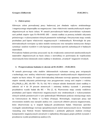 Grzegorz Ziółkowski 15.02.2013 r. 1. Zakres pracy Głównym celem prowadzonej pracy badawczej jest zbadanie wpływu strukturalnego i magnetycznego nieporządku na magnetyczne i inne właściwości nanokrystalicznych stopów objętościowych na bazie żelaza. W ramach prowadzonych badań przewidziano wykonanie serii próbek stopów typu Fe-Nb-B-RE (RE – ziemia rzadka) za pomocą techniki odsysania próżniowego z wykorzystaniem różnych parametrów technologii. Otrzymywane stopy zostały przebadane pod kątem właściwości magnetycznych i strukturalnych. Równolegle do prac doświadczalnych rozwijane są także modele teoretyczne oraz narzędzia numeryczne służące symulacji i analizie wyników w celu lepszego zrozumienia zjawisk zachodzących w badanych materiałach. Prowadzone badania powinny przyczynić się do zwiększenia zastosowań nanokrystalicznych materiałów objętościowych na bazie żelaza o niewielkiej (w porównaniu do współcześnie stosowanych) ilości domieszki ziemi rzadkiej w dziedzinie „twardych” magnesów trwałych. 2. Przeprowadzone badania (w okresie od 01.10.2011 – 15.02.2013) W ramach pierwszego roku studiów doktoranckich wykonano szereg prac związanych z technologią oraz analizą właściwości magnetycznych nanokrystalicznych objętościowych stopów na bazie żelaza. W części doświadczalnej dokonano rozwoju aparatury wytwarzania stopów metodą odsysania próżniowego oraz przygotowano szereg serii stopów z rodziny (Fe80Nb6B14)1-xREx dla RE= Tb, Er, Gd, Nd o różnym udziale domieszki ziemi rzadkiej w zakresie od 4 do 20 procent atomowych i zmiennej średnicy (rysunek 1 prezentuje przykładowe wyniki badań dla RE = Tb) [2, 4]. Wytworzone stopy zostały wnikliwie przebadane pod kątem właściwości magnetycznych oraz strukturalnych z wykorzystaniem różnych technik pomiarowych w tym spektroskopii Mössbauera podczas miesięcznego stażu na Uniwersytecie du Maine w Le Mans (Francja). Równolegle, rozpoczęto pracę nad stworzeniem modelu oraz narzędzi analizy tzw. czasowych efektów procesu magnesowania, które obserwowane są w stopach będących przedmiotem badań. Omawiane zjawisko wymagało samodzielnego rozwoju specjalistycznych metod numerycznych (m.in. Simulated Annealing oraz Particle Swarm Optimization) i posłużyło głębszym studiom ewolucji komponentów magnetycznych zawartych w najbardziej obiecującej grupie próbek (rysunek 2 przedstawia wyniki przykładowej analizy) [3]. oraz Rysunek 2. Rozkłady czasów relaksacji namagnesowanie nasycenia Ms dla rodziny magnetycznej dla rodziny stopów typu stopów typu (Fe80Nb6B14)1-xTbx uzyskanych (Fe80Nb6B14)1-xTbx uzyskane algorytmem metodą odsysania próżniowego [4]. Symulowanego Wyżarzania [3]. Rysunek 1. Pole koercji Hc W szczególności, w bieżącym (trzecim) semestrze podjęto następujące prace: 1. Kontynuowano badania wpływu średnicy formy odlewniczej na własności najbardziej obiecującej grupy stopów (Fe80Nb6B14)1-xTbx. Przygotowano szereg nowych próbek o średnicach d= 0.5mm, 1mm, 1.5mm, 2mm oraz x = 0.1, 0.11, 0.12. Na bazie uzyskanych wyników, przygotowano publikację do druku. 2. Podjęto przygotowana do dokładniejszych badań strukturalnych oraz właściwości mechanicznych otrzymywanych stopów z udziałem mikroskopów typu AFM, MFM oraz mikroskopu Kerra. 3. Przygotowano szereg nowych stopów typu (Fe80Nb6B14)1-xPtx dla x = 0.15, 0.3, 0.4 z wykorzystaniem form odlewniczych o średnicach d= 0.5mm, 1mm, 1.5mm, 2mm. Otrzymane próbki zostały przebadane pod kątem właściwości magnetycznych za pomocą Magnetometru SQUID. 4. Rozpoczęto prace nad przygotowaniem modelu teoretycznego oraz specjalistycznego oprogramowania w celach symulacji i lepszego zrozumienia procesów magnesowania zachodzących w wytwarzanych stopach. 5. Przygotowano dwie nowe publikacje będące w trakcie recenzji [5, 6]. 3. Publikacje własnych wyników badań w omawianej tematyce [1] A.Chrobak, G.Haneczok, G. Chełkowska, A. Kassiba, G. Ziółkowski, „Numerical analysis of superparamagnetic clusters” Phys. Stat. Sol.(a) 208, No. 11, 2692–2698 (2011) (okładka). [2] G.Ziółkowski, N.Randrianantoandro, A.Chrobak, J.Klimontko, M.Kądziołka-Gaweł, G.Haneczok, Influence of transition and rare earth elements on magnetic properties of Fe-Nb-B-M (M=Ni, Ag, Gd, Tb) bulk nanocrystalline alloys. Acta Physica Polonica A, No. 5-6, Vol. 121 (2012). [3] G. Ziółkowski, A. Chrobak, N.Randrianantoandro, G. Chełkowska, Numerical analysis of time dependent effects in bulk nanocrystalline hard magnets. Solid State Phenomena 194 (2012) 62-66. [4] Chrobak, G. Ziołkowski, N. Randrianantoandro, J.Klimontko, G. Haneczok. Phase structure and magnetic properties of Fe–Nb–B–Tb type of bulk. Journal of Alloys and Compounds 537 (2012) 154–158. Obecnie w trakcje recenzji: [5] „G. Ziółkowski, A. Chrobak, J. Klimontko. Phase structure and magnetic properties of Fe-Nb-B-Nd type of bulk nanocrystalline alloys. Solid State Phenomena” [6] “A. Chrobak, J. Klimontko, M. Kubisztal, G. Haneczok, G. Ziółkowski, A. Kachel. Effect of ball milling on structure and magnetic properties of Fe-Mb-B-Tb bulk nanocrystalline alloys. Solid State Phenomena, Trans Tech Publications”. Ponadto, wyniki badań prezentowano na konferencjach: The European Conference: Physics of Magnetism 2011, 27.06-01.07.2011 Poznań, Polska. Synthesis of hybrid organic-inorganic nanoparticles for innovative nanostructured composites, 28.02-02.03.2011 Neapol, Włochy. SCTE2012 18th International Conference on Solid Compounds of Transition Elements. 31.03-05.04.2012. Lizbona, Portugalia. Conference on Applied Crystallography, 02-06.09.2012 Targanice, Polska I ogólnopolska konferencja studentów i doktorantów pt. „Pomiędzy naukami – zjazd fizyków i chemików”, 05.10.2012, Chorzów, Polska (wystąpienie ustne).