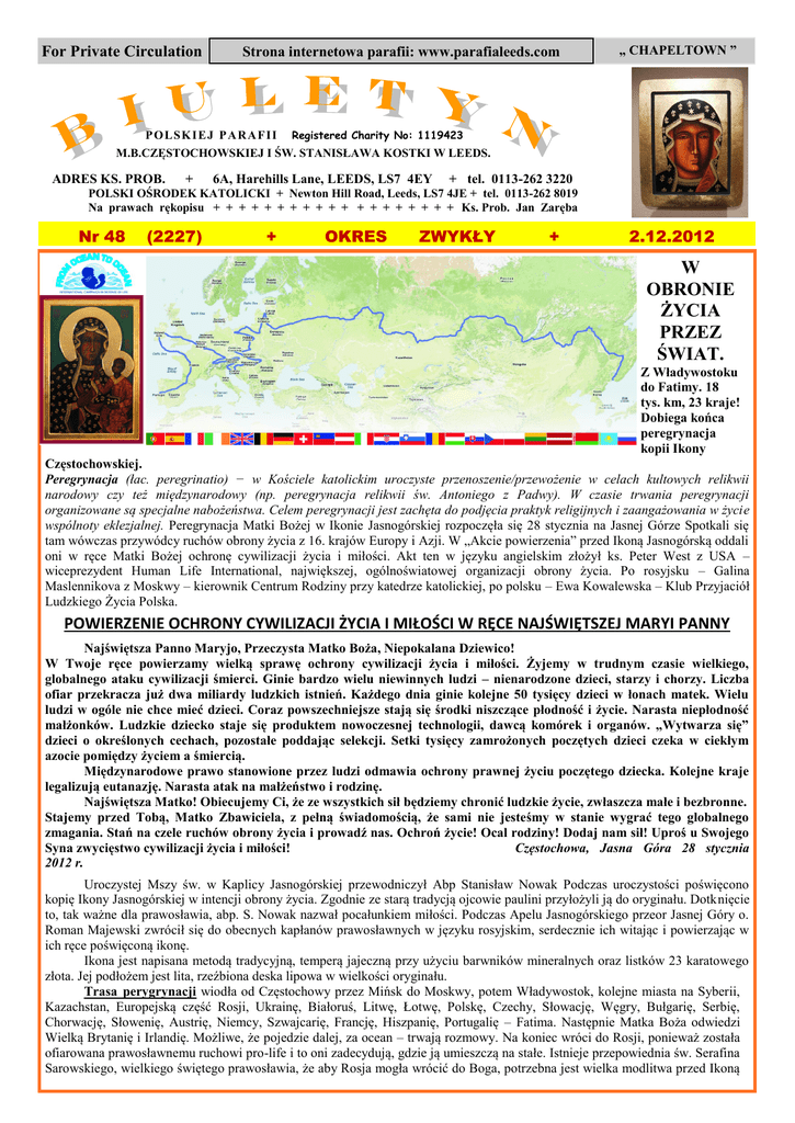 For Private Circulation Strona internetowa parafii: www.parafialeeds.com „ CHAPELTOWN ” P O L SK I E J P A R A F I I Registered Charity No: 1119423 M.B.CZĘSTOCHOWSKIEJ I ŚW. STANISŁAWA KOSTKI W LEEDS. ADRES KS. PROB. + 6A, Harehills Lane, LEEDS, LS7 4EY + tel. 0113-262 3220 POLSKI OŚRODEK KATOLICKI + Newton Hill Road, Leeds, LS7 4JE + tel. 0113-262 8019 Na prawach rękopisu + + + + + + + + + + + + + + + + + + + Ks. Prob. Jan Zaręba Nr 48 (2227) + OKRES ZWYKŁY + 2.12.2012 W OBRONIE ŻYCIA PRZEZ ŚWIAT. Z Władywostoku do Fatimy. 18 tys. km, 23 kraje! Dobiega końca peregrynacja kopii Ikony Częstochowskiej. Peregrynacja (łac. peregrinatio) − w Kościele katolickim uroczyste przenoszenie/przewożenie w celach kultowych relikwii narodowy czy też międzynarodowy (np. peregrynacja relikwii św. Antoniego z Padwy). W czasie trwania peregrynacji organizowane są specjalne nabożeństwa. Celem peregrynacji jest zachęta do podjęcia praktyk religijnych i zaangażowania w życie wspólnoty eklezjalnej. Peregrynacja Matki Bożej w Ikonie Jasnogórskiej rozpoczęła się 28 stycznia na Jasnej Górze Spotkali się tam wówczas przywódcy ruchów obrony życia z 16. krajów Europy i Azji. W „Akcie powierzenia” przed Ikoną Jasnogórską oddali oni w ręce Matki Bożej ochronę cywilizacji życia i miłości. Akt ten w języku angielskim złożył ks. Peter West z USA – wiceprezydent Human Life International, największej, ogólnoświatowej organizacji obrony życia. Po rosyjsku – Galina Maslennikova z Moskwy – kierownik Centrum Rodziny przy katedrze katolickiej, po polsku – Ewa Kowalewska – Klub Przyjaciół Ludzkiego Życia Polska. POWIERZENIE OCHRONY CYWILIZACJI ŻYCIA I MIŁOŚCI W RĘCE NAJŚWIĘTSZEJ MARYI PANNY Najświętsza Panno Maryjo, Przeczysta Matko Boża, Niepokalana Dziewico! W Twoje ręce powierzamy wielką sprawę ochrony cywilizacji życia i miłości. Żyjemy w trudnym czasie wielkiego, globalnego ataku cywilizacji śmierci. Ginie bardzo wielu niewinnych ludzi – nienarodzone dzieci, starzy i chorzy. Liczba ofiar przekracza już dwa miliardy ludzkich istnień. Każdego dnia ginie kolejne 50 tysięcy dzieci w łonach matek. Wielu ludzi w ogóle nie chce mieć dzieci. Coraz powszechniejsze stają się środki niszczące płodność i życie. Narasta niepłodność małżonków. Ludzkie dziecko staje się produktem nowoczesnej technologii, dawcą komórek i organów. „Wytwarza się” dzieci o określonych cechach, pozostałe poddając selekcji. Setki tysięcy zamrożonych poczętych dzieci czeka w ciekłym azocie pomiędzy życiem a śmiercią. Międzynarodowe prawo stanowione przez ludzi odmawia ochrony prawnej życiu poczętego dziecka. Kolejne kraje legalizują eutanazję. Narasta atak na małżeństwo i rodzinę. Najświętsza Matko! Obiecujemy Ci, że ze wszystkich sił będziemy chronić ludzkie życie, zwłaszcza małe i bezbronne. Stajemy przed Tobą, Matko Zbawiciela, z pełną świadomością, że sami nie jesteśmy w stanie wygrać tego globalnego zmagania. Stań na czele ruchów obrony życia i prowadź nas. Ochroń życie! Ocal rodziny! Dodaj nam sił! Uproś u Swojego Syna zwycięstwo cywilizacji życia i miłości! Częstochowa, Jasna Góra 28 stycznia 2012 r. Uroczystej Mszy św. w Kaplicy Jasnogórskiej przewodniczył Abp Stanisław Nowak Podczas uroczystości poświęcono kopię Ikony Jasnogórskiej w intencji obrony życia. Zgodnie ze starą tradycją ojcowie paulini przyłożyli ją do oryginału. Dotknięcie to, tak ważne dla prawosławia, abp. S. Nowak nazwał pocałunkiem miłości. Podczas Apelu Jasnogórskiego przeor Jasnej Góry o. Roman Majewski zwrócił się do obecnych kapłanów prawosławnych w języku rosyjskim, serdecznie ich witając i powierzając w ich ręce poświęconą ikonę. Ikona jest napisana metodą tradycyjną, temperą jajeczną przy użyciu barwników mineralnych oraz listków 23 karatowego złota. Jej podłożem jest lita, rzeźbiona deska lipowa w wielkości oryginału. Trasa perygrynacji wiodła od Częstochowy przez Mińsk do Moskwy, potem Władywostok, kolejne miasta na Syberii, Kazachstan, Europejską część Rosji, Ukrainę, Białoruś, Litwę, Łotwę, Polskę, Czechy, Słowację, Węgry, Bułgarię, Serbię, Chorwację, Słowenię, Austrię, Niemcy, Szwajcarię, Francję, Hiszpanię, Portugalię – Fatima. Następnie Matka Boża odwiedzi Wielką Brytanię i Irlandię. Możliwe, że pojedzie dalej, za ocean – trwają rozmowy. Na koniec wróci do Rosji, ponieważ została ofiarowana prawosławnemu ruchowi pro-life i to oni zadecydują, gdzie ją umieszczą na stałe. Istnieje przepowiednia św. Serafina Sarowskiego, wielkiego świętego prawosławia, że aby Rosja mogła wrócić do Boga, potrzebna jest wielka modlitwa przed Ikoną PORZĄDEK MSZY ŚWIĘTYCH I NABOŻEŃSTW NIEDZIELA, 2 GRUDNIA 2012; 1 ADWENTU; 9:30 – Za śp. męża + Władysława Piejko - dar intencji od żony Magdaleny z rodziną 11:00 – Do Bożej Opatrzności z prośbą o Błogosławieństwo Boże i zdrowie dla Członków Koła Żywego Różańca oraz za zmarłych członków Koła - int. własna KŻR Harrogate 15:30 – ADWENTOWA GODZINA ŚWIĘTA POLSKIEJ SZKOŁ i okazja do spowiedzi Harrogate 16:30 – Za śp. brata + Damiana Rarak w 2. rocz. śmierci - dar int. od siostry z mężem Leeds 19:00 – Za śp. siostrę + Marię Kiliańską-Sierant i ojca + Mieczysława Kiliańskiego, oraz teściów + Janinę i + Tadeusza Kolasińskich PONIEDZIAŁEK, 3 GRUDNIA 2012; Wspomnienie św. Franciszka Ksawerego; 10:00 – Za śp. męża + Konstantego, rodziców + Jana i + Walentynę, oraz + Józefa i + Annę, oraz ++ rodzeństwo z obu stron - dar intencji od p. Elżbiety Druś WTOREK, 4 GRUDNIA 2012; Wspomnienie św. Barbary, męcz.; 10:00 – Za śp. + Barbarę Liebig w dniu urodzin - dar intencji od męża z dziećmi ŚRODA, 5 GRUDNIA 2012; Dzień powszedni; 11:00 – Za śp. męża + Bolesława Sowińskiego - dar intencji od żony z