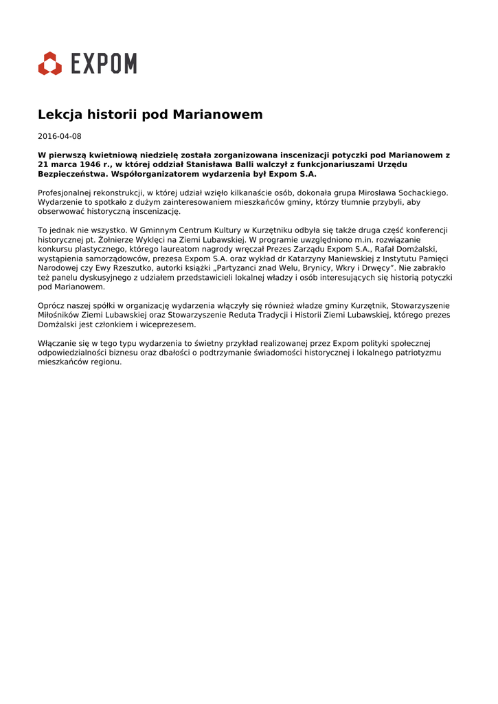 Lekcja historii pod Marianowem 2016-04-08 W pierwszą kwietniową niedzielę została zorganizowana inscenizacji potyczki pod Marianowem z 21 marca 1946 r., w której oddział Stanisława Balli walczył z funkcjonariuszami Urzędu Bezpieczeństwa. Współorganizatorem wydarzenia był Expom S.A. Profesjonalnej rekonstrukcji, w której udział wzięło kilkanaście osób, dokonała grupa Mirosława Sochackiego. Wydarzenie to spotkało z dużym zainteresowaniem mieszkańców gminy, którzy tłumnie przybyli, aby obserwować historyczną inscenizację. To jednak nie wszystko. W Gminnym Centrum Kultury w Kurzętniku odbyła się także druga część konferencji historycznej pt. Żołnierze Wyklęci na Ziemi Lubawskiej. W programie uwzględniono m.in. rozwiązanie konkursu plastycznego, którego laureatom nagrody wręczał Prezes Zarządu Expom S.A., Rafał Domżalski, wystąpienia samorządowców, prezesa Expom S.A. oraz wykład dr Katarzyny Maniewskiej z Instytutu Pamięci Narodowej czy Ewy Rzeszutko, autorki książki „Partyzanci znad Welu, Brynicy, Wkry i Drwęcy”. Nie zabrakło też panelu dyskusyjnego z udziałem przedstawicieli lokalnej władzy i osób interesujących się historią potyczki pod Marianowem. Oprócz naszej spółki w organizację wydarzenia włączyły się również władze gminy Kurzętnik, Stowarzyszenie Miłośników Ziemi Lubawskiej oraz Stowarzyszenie Reduta Tradycji i Historii Ziemi Lubawskiej, którego prezes Domżalski jest członkiem i wiceprezesem. Włączanie się w tego typu wydarzenia to świetny przykład realizowanej przez Expom polityki społecznej odpowiedzialności biznesu oraz dbałości o podtrzymanie świadomości historycznej i lokalnego patriotyzmu mieszkańców regionu. Powered by TCPDF (www.tcpdf.org)