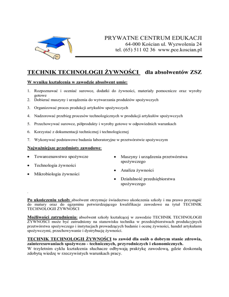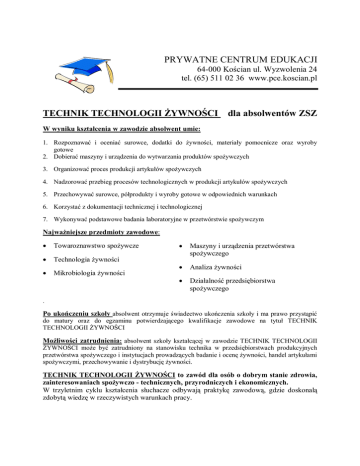 PRYWATNE CENTRUM EDUKACJI 64-000 Kościan ul. Wyzwolenia 24 tel. (65) 511 02 36 www.pce.koscian.pl TECHNIK TECHNOLOGII ŻYWNOŚCI dla absolwentów ZSZ W wyniku kształcenia w zawodzie absolwent umie: 1. Rozpoznawać i oceniać surowce, dodatki do żywności, materiały pomocnicze oraz wyroby gotowe 2. Dobierać maszyny i urządzenia do wytwarzania produktów spożywczych 3. Organizować proces produkcji artykułów spożywczych 4. Nadzorować przebieg procesów technologicznych w produkcji artykułów spożywczych 5. Przechowywać surowce, półprodukty i wyroby gotowe w odpowiednich warunkach 6. Korzystać z dokumentacji technicznej i technologicznej 7. Wykonywać podstawowe badania laboratoryjne w przetwórstwie spożywczym Najważniejsze przedmioty zawodowe: Towaroznawstwo spożywcze Technologia żywności Mikrobiologia żywności Maszyny i urządzenia przetwórstwa spożywczego Analiza żywności Działalność przedsiębiorstwa spożywczego . Po ukończeniu szkoły absolwent otrzymuje świadectwo ukończenia szkoły i ma prawo przystąpić do matury oraz do egzaminu potwierdzającego kwalifikacje zawodowe na tytuł TECHNIK TECHNOLOGII ŻYWNOŚCI Możliwości zatrudnienia: absolwent szkoły kształcącej w zawodzie TECHNIK TECHNOLOGII ŻYWNOŚCI może być zatrudniony na stanowisku technika w przedsiębiorstwach produkcyjnych przetwórstwa spożywczego i instytucjach prowadzących badanie i ocenę żywności, handel artykułami spożywczymi, przechowywanie i dystrybucję żywności. TECHNIK TECHNOLOGII ŻYWNOŚCI to zawód dla osób o dobrym stanie zdrowia, zainteresowaniach spożywczo - technicznych, przyrodniczych i ekonomicznych. W trzyletnim cyklu kształcenia słuchacze odbywają praktykę zawodową, gdzie doskonalą zdobytą wiedzę w rzeczywistych warunkach pracy.