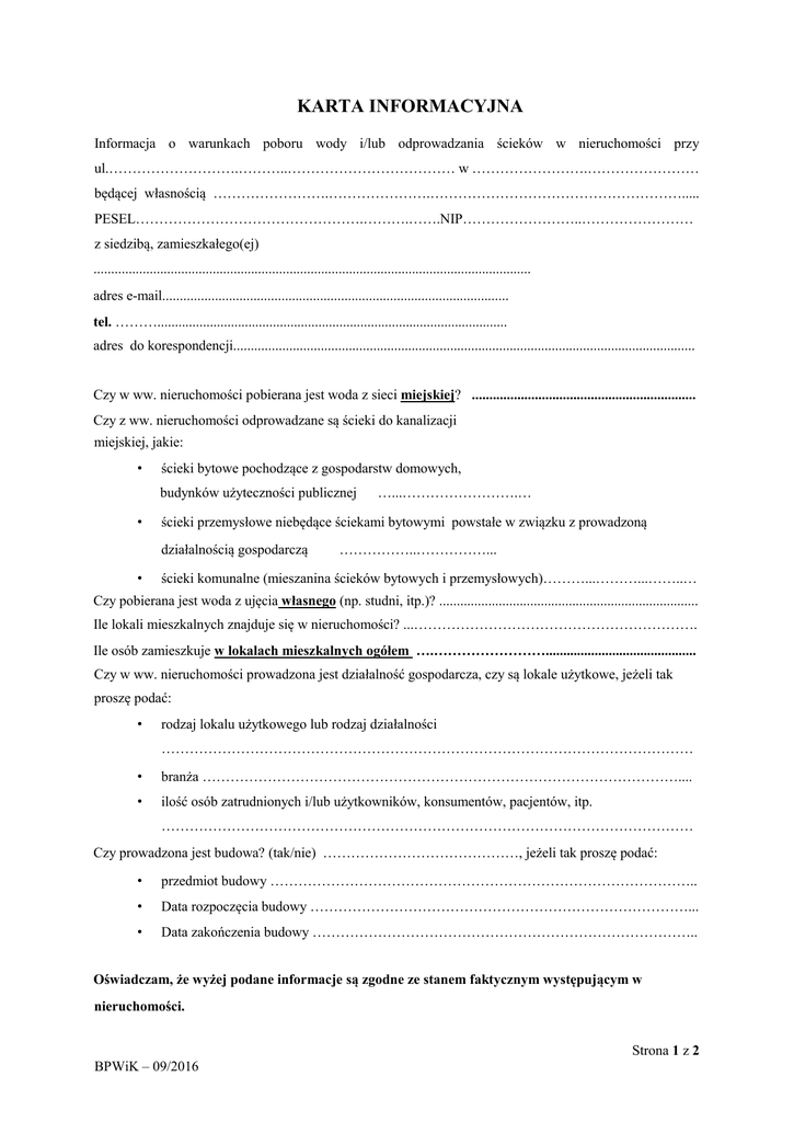 KARTA INFORMACYJNA Informacja o warunkach poboru wody i/lub odprowadzania ścieków w nieruchomości przy ul.……………………….………..……………………………… w …………………….…………………… będącej własnością …………………….………………….………………………………………………..... PESEL………………………………………….……….…….NIP……………………..…………………… z siedzibą, zamieszkałego(ej) ............................................................................................................................. adres e-mail................................................................................................... tel. ……….................................................................................................... adres do korespondencji.................................................................................................................................... Czy w ww. nieruchomości pobierana jest woda z sieci miejskiej? ................................................................ Czy z ww. nieruchomości odprowadzane są ścieki do kanalizacji miejskiej, jakie: • ścieki bytowe pochodzące z gospodarstw domowych, budynków użyteczności publicznej • ścieki przemysłowe niebędące ściekami bytowymi powstałe w związku z prowadzoną działalnością gospodarczą • …...…………………….… ……………..……………... ścieki komunalne (mieszanina ścieków bytowych i przemysłowych)………...………...……..… Czy pobierana jest woda z ujęcia własnego (np. studni, itp.)? .......................................................................... Ile lokali mieszkalnych znajduje się w nieruchomości? ...……………………………………………………. Ile osób zamieszkuje w lokalach mieszkalnych ogółem ….……………………........................................... Czy w ww. nieruchomości prowadzona jest działalność gospodarcza, czy są lokale użytkowe, jeżeli tak proszę podać: • rodzaj lokalu użytkowego lub rodzaj działalności …………………………………………………………………………………………………… • branża ………………………………………………………………………………………….... • ilość osób zatrudnionych i/lub użytkowników, konsumentów, pacjentów, itp. …………………………………………………………………………………………………… Czy prowadzona jest budowa? (tak/nie) ……………………………………, jeżeli tak proszę podać: • przedmiot budowy ……………………………………………………………………………….. • Data rozpoczęcia budowy ………………………………………………………………………... • Data zakończenia budowy ……………………………………………………………………….. Oświadczam, że wyżej podane informacje są zgodne ze stanem faktycznym występującym w nieruchomości. Strona 1 z 2 BPWiK – 09/2016 Wyrażam zgodę na przesyłanie dokumentów zawierających dane osobowe przesyłką pocztową. BPWiK Sp. z o.o. nie ponosi odpowiedzialności za utracone tą drogą dane osobowe. Wyrażam zgodę na gromadzenie i przetwarzanie danych osobowych dla potrzeb wykonania niniejszego wniosku (zgodnie z ustawą z dnia 1997.08.29 o ochronie danych osobowych Dz.U. Nr 1333 poz. 883). ................................................. Data …………..……………………………………….. Pieczęć i czytelne podpisy Odbiorcy Usług Do czasu zainstalowania wodomierza głównego podstawą ustalenia ilości pobieranej wody są przepisy art. 27 ustawy z dnia 07.06.2001 r. o zbiorowym zaopatrzeniu w wodę i zbiorowym odprowadzaniu ścieków (Dz. U. z 2006 r. Nr 123, poz. 858 z późn. zm.) i - rozporządzenia Ministra Infrastruktury z dnia 14 stycznia 2002 r. w sprawie określenia przeciętnych norm zużycia wody (Dz. U. Nr 8, poz. 70) UWAGA! Uprzejmie informujemy, iż w przypadku zmiany ilości osób zamieszkałych lub innych zmian wpływających na ilość odprowadzanych ścieków z nieruchomości, dla której świadczona jest usługa odprowadzania ścieków, Odbiorca Usług powinien niezwłocznie dostarczyć do BPWiK Sp. z o.o. z siedzibą w Brwinowie wypełnione i podpisane przez Odbiorcę Usług 2 egz. Karty informacyjnej, zawierającego aktualne informacje dot. warunków odprowadzania ścieków z danej nieruchomości. Strona 2 z 2 BPWiK – 09/2016
