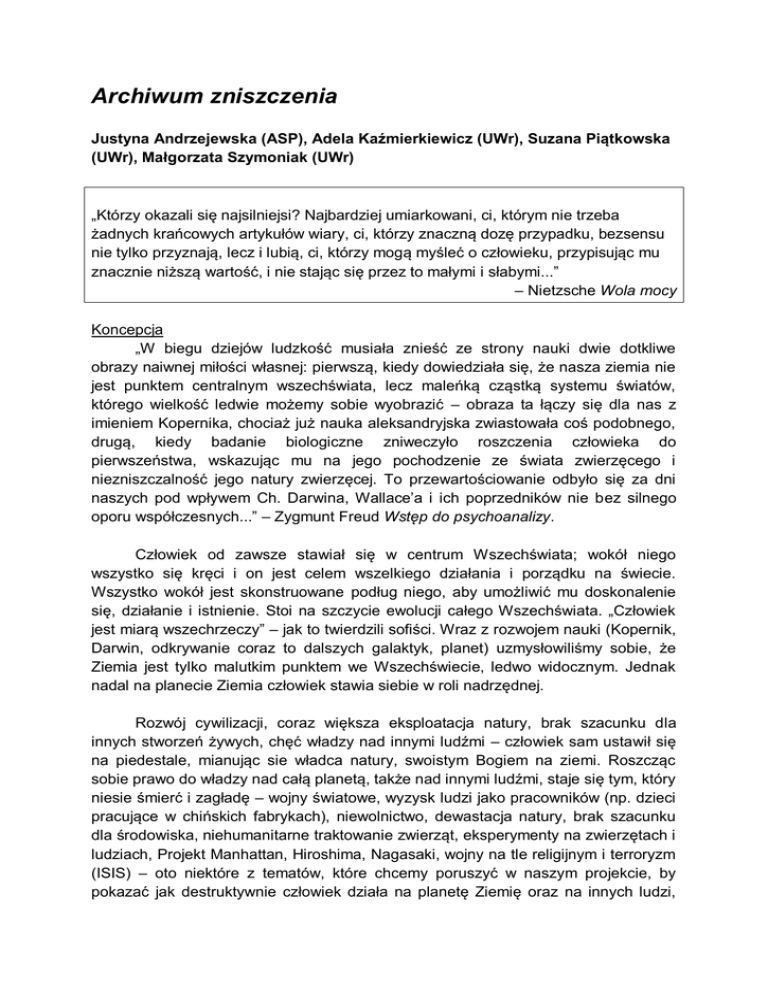 Archiwum zniszczenia Justyna Andrzejewska (ASP), Adela Kaźmierkiewicz (UWr), Suzana Piątkowska (UWr), Małgorzata Szymoniak (UWr) „Którzy okazali się najsilniejsi? Najbardziej umiarkowani, ci, którym nie trzeba żadnych krańcowych artykułów wiary, ci, którzy znaczną dozę przypadku, bezsensu nie tylko przyznają, lecz i lubią, ci, którzy mogą myśleć o człowieku, przypisując mu znacznie niższą wartość, i nie stając się przez to małymi i słabymi...” – Nietzsche Wola mocy Koncepcja „W biegu dziejów ludzkość musiała znieść ze strony nauki dwie dotkliwe obrazy naiwnej miłości własnej: pierwszą, kiedy dowiedziała się, że nasza ziemia nie jest punktem centralnym wszechświata, lecz maleńką cząstką systemu światów, którego wielkość ledwie możemy sobie wyobrazić – obraza ta łączy się dla nas z imieniem Kopernika, chociaż już nauka aleksandryjska zwiastowała coś podobnego, drugą, kiedy badanie biologiczne zniweczyło roszczenia człowieka do pierwszeństwa, wskazując mu na jego pochodzenie ze świata zwierzęcego i niezniszczalność jego natury zwierzęcej. To przewartościowanie odbyło się za dni naszych pod wpływem Ch. Darwina, Wallace’a i ich poprzedników nie bez silnego oporu współczesnych...” – Zygmunt Freud Wstęp do psychoanalizy. Człowiek od zawsze stawiał się w centrum Wszechświata; wokół niego wszystko się kręci i on jest celem wszelkiego działania i porządku na świecie. Wszystko wokół jest skonstruowane podług niego, aby umożliwić mu doskonalenie się, działanie i istnienie. Stoi na szczycie ewolucji całego Wszechświata. „Człowiek jest miarą wszechrzeczy” – jak to twierdzili sofiści. Wraz z rozwojem nauki (Kopernik, Darwin, odkrywanie coraz to dalszych galaktyk, planet) uzmysłowiliśmy sobie, że Ziemia jest tylko malutkim punktem we Wszechświecie, ledwo widocznym. Jednak nadal na planecie Ziemia człowiek stawia siebie w roli nadrzędnej. Rozwój cywilizacji, coraz większa eksploatacja natury, brak szacunku dla innych stworzeń żywych, chęć władzy nad innymi ludźmi – człowiek sam ustawił się na piedestale, mianując sie władca natury, swoistym Bogiem na ziemi. Roszcząc sobie prawo do władzy nad całą planetą, także nad innymi ludźmi, staje się tym, który niesie śmierć i zagładę – wojny światowe, wyzysk ludzi jako pracowników (np. dzieci pracujące w chińskich fabrykach), niewolnictwo, dewastacja natury, brak szacunku dla środowiska, niehumanitarne traktowanie zwierząt, eksperymenty na zwierzętach i ludziach, Projekt Manhattan, Hiroshima, Nagasaki, wojny na tle religijnym i terroryzm (ISIS) – oto niektóre z tematów, które chcemy poruszyć w naszym projekcie, by pokazać jak destruktywnie człowiek działa na planetę Ziemię oraz na innych ludzi, dla których powinien być przyjacielem, nie wrogiem. „Którzy okazali się najsilniejsi? Najbardziej umiarkowani, ci, którym nie trzeba żadnych krańcowych artykułów wiary, ci, którzy znaczną dozę przypadku, bezsensu nie tylko przyznają, lecz i lubią, ci, którzy mogą myśleć o człowieku, przypisując mu znacznie niższą wartość, i nie stając się przez to małymi i słabymi...” – Fryderyk Nietzsche Wola mocy. Niewątpliwie człowiek osiągnął wysokim stopień ewolucji – chociażby samoświadomość i wysoka inteligencja, które wyróżniają nas spośród zwierząt i roślin. Swoje umiejętności, swoją siłę często źle wykorzystujemy. Moglibyśmy ulepszać rzeczywistość – a zamiast tego, równocześnie z naszym gatunkowym rozwojem, niszczymy świat i go dewastujemy. Poprzez naszą ścianę Archiwum zniszczenia chcemy pokazać pychę, która rządzi ludzką naturą. Nasza instalacja jest swoistą satyrą z tzw. „ścianki celebrytów”, na której tle fotografują się i wdzięczą piękne gwiazdy. Tło takich ścianek to najczęściej loga firm i korporacji, za którymi kryje się wyzysk oraz cierpienie ludzkie, instytucji, które w negatywny sposób oddziałują na świat. Proces Gdy pełne zapału zabierałyśmy się do realizacji naszego projektu, nie sądziłyśmy, że po drodze napotkamy tyle problemów, z którymi „kulturoznawcza” część z nas nigdy się nie stykała. Pierwsze projekty naszej ściany były niewypałem i nigdy nie wszyły poza obręb szkiców z kartki. Dużo czasu zajęło nam dokładne wypracowanie tego, co konkretnie chcemy ukazać w naszym projekcie, a jeszcze więcej, jak to przedstawić. Ostatecznie zdecydowałyśmy się na najprostsze i najbardziej klarowne, naszym zdaniem, rozwiązanie. W trakcie realizacji napotkałyśmy wiele problemów natury technicznej. Początkowo zakupiłyśmy płyty do stworzenia czystej, białej ściany, której zmontowanie zabrało nam wiele godzin. Następnie zajęłyśmy się obróbką oraz układem graficznym zdjęć. Po wielu godzinach poszukiwań i oglądania drastycznych zdjęć, wybrałyśmy te, które najbardziej odzwierciedlały naszą wizję. Zastanawiałyśmy się nad wielkością zdjęć, ich rozmieszczeniem oraz kolorami dominującymi – zależało nam, żeby przypominały logo umieszczone na ściance fotograficznej. Po wybraniu najlepszego rozmiaru, materiału i metody wydrukowania elementów zdecydowałyśmy się na zaprezentowany format. Napisy zostały wydrukowane w formie naklejek, a zdjęcia na brystolu „akademia”. Przy pomocy rzutnika zdołałyśmy prosto i symetrycznie rozmieścić i przykleić elementy na ściance. Musiałyśmy także precyzyjnie zamalować śrubki oraz szczelinę, która była widoczna na ścianie. Po tym zostało nam już tylko kupno czerwonego dywanu o odpowiednim rozmiarze, kolorze i wykonanego z odpowiedniego materiału. !SCREAM! Archiwum traumatyzacji Julia Bortnik (UWr), Natalia Olejnik (ASP), Daria Wziątek (UWr) !SCREAM! to transformacja ludzkiej postaci i tożsamości poprzez traumatyzację i uosobienie martwej materii. Jest przetworzeniem motywu 