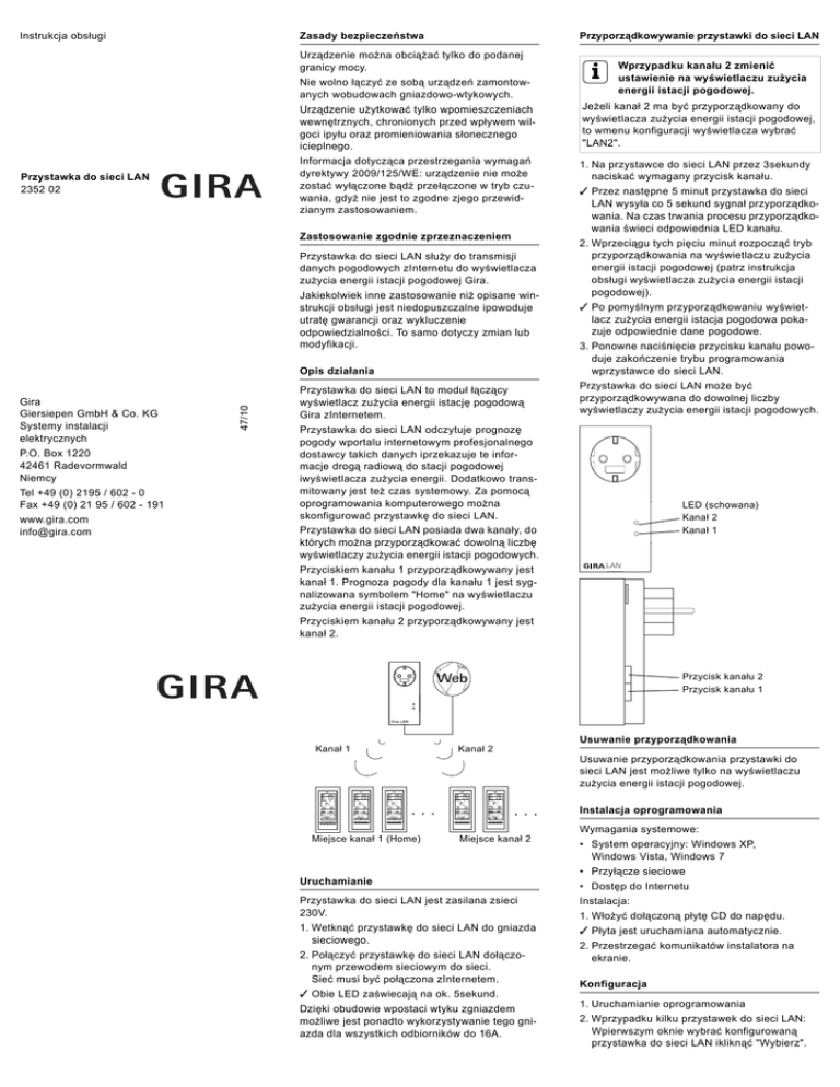Instrukcja obsługi Zasady bezpieczeństwa Przyporządkowywanie przystawki do sieci LAN Urządzenie można obciążać tylko do podanej granicy mocy. Nie wolno łączyć ze sobą urządzeń zamontowanych wobudowach gniazdowo-wtykowych. Przystawka do sieci LAN 2352 02 Jeżeli kanał 2 ma być przyporządkowany do wyświetlacza zużycia energii istacji pogodowej, to wmenu konfiguracji wyświetlacza wybrać "LAN2". Informacja dotycząca przestrzegania wymagań dyrektywy 2009/125/WE: urządzenie nie może zostać wyłączone bądź przełączone w tryb czuwania, gdyż nie jest to zgodne zjego przewidzianym zastosowaniem. 1. Na przystawce do sieci LAN przez 3sekundy naciskać wymagany przycisk kanału. Przystawka do sieci LAN służy do transmisji danych pogodowych zInternetu do wyświetlacza zużycia energii istacji pogodowej Gira. Tel +49 (0) 2195 / 602 - 0 Fax +49 (0) 21 95 / 602 - 191 www.gira.com [email protected] 47/10 Jakiekolwiek inne zastosowanie niż opisane winstrukcji obsługi jest niedopuszczalne ipowoduje utratę gwarancji oraz wykluczenie odpowiedzialności. To samo dotyczy zmian lub modyfikacji. P.O. Box 1220 42461 Radevormwald Niemcy Wprzypadku kanału 2 zmienić ustawienie na wyświetlaczu zużycia energii istacji pogodowej. Urządzenie użytkować tylko wpomieszczeniach wewnętrznych, chronionych przed wpływem wilgoci ipyłu oraz promieniowania słonecznego icieplnego. Zastosowanie zgodnie zprzeznaczeniem Gira Giersiepen GmbH & Co. KG Systemy instalacji elektrycznych i ✓ Przez następne 5 minut przystawka do sieci LAN wysyła co 5 sekund sygnał przyporządkowania. Na czas trwania procesu przyporządkowania świeci odpowiednia LED kanału. 2. Wprzeciągu tych pięciu minut rozpocząć tryb przyporządkowania na wyświetlaczu zużycia energii istacji pogodowej (patrz instrukcja obsługi wyświetlacza zużycia energii istacji pogodowej). ✓ Po pomyślnym przyporządkowaniu wyświetlacz zużycia energii istacja pogodowa pokazuje odpowiednie dane pogodowe. Opis działania 3. Ponowne naciśnięcie przycisku kanału powoduje zakończenie trybu programowania wprzystawce do sieci LAN. Przystawka do sieci LAN to moduł łączący wyświetlacz zużycia energii istację pogodową Gira zInternetem. Przystawka do sieci LAN może być przyporządkowywana do dowolnej liczby wyświetlaczy zużycia energii istacji pogodowych. Przystawka do sieci LAN odczytuje prognozę pogody wportalu internetowym profesjonalnego dostawcy takich danych iprzekazuje te informacje drogą radiową do stacji pogodowej iwyświetlacza zużycia energii. Dodatkowo transmitowany jest też czas systemowy. Za pomocą oprogramowania komputerowego można skonfigurować przystawkę do sieci LAN. LED (schowana) Kanał 2 Kanał 1 Przystawka do sieci LAN posiada dwa kanały, do których można przyporządkować dowolną liczbę wyświetlaczy zużycia energii istacji pogodowych. Przyciskiem kanału 1 przyporządkowywany jest kanał 1. Prognoza pogody dla kanału 1 jest sygnalizowana symbolem "Home" na wyświetlaczu zużycia energii istacji pogodowej. LAN Przyciskiem kanału 2 przyporządkowywany jest kanał 2. Web Kanał 1 Przycisk kanału 2 Przycisk kanału 1 Usuwanie przyporządkowania Kanał 2 ... Miejsce kanał 1 (Home) Usuwanie przyporządkowania przystawki do sieci LAN jest możliwe tylko na wyświetlaczu zużycia energii istacji pogodowej. ... Miejsce kanał 2 Uruchamianie Instalacja oprogramowania Wymagania systemowe: • System operacyjny: Windows XP, Windows Vista, Windows 7 • Przyłącze sieciowe • Dostęp do Internetu Przystawka do sieci LAN jest zasilana zsieci 230V. Instalacja: 1. Wetknąć przystawkę do sieci LAN do gniazda sieciowego. ✓ Płyta jest uruchamiana automatycznie. 2. Połączyć przystawkę do sieci LAN dołączonym przewodem sieciowym do sieci. Sieć musi być połączona zInternetem. ✓ Obie LED zaświecają na ok. 5sekund. Dzięki obudowie wpostaci wtyku zgniazdem możliwe jest ponadto wykorzystywanie tego gniazda dla wszystkich odbiorników do 16A. 1. Włożyć dołączoną płytę CD do napędu. 2. Przestrzegać komunikatów instalatora na ekranie. Konfiguracja 1. Uruchamianie oprogramowania 2. Wprzypadku kilku przystawek do sieci LAN: Wpierwszym oknie wybrać konfigurowaną przystawka do sieci LAN ikliknąć "Wybierz". Jeżeli wsieci występuje tylko jedna przystawka do sieci LAN, to wybór jest pomijany ikomputer automatycznie znajduje dostępną przystawkę do sieci LAN. Struktura menu • temperatura iprędkość wiatru Nadawanie izakłócenia radiowe • temperatura iwilgotność powietrza Przystawka do sieci LAN co 2 do 3 minut wysyła dane do wyświetlacza zużycia energii istacji pogodowej. 4. Wybrać strefę czasową, wktórej znajduje się lokalizacja. 5. Po zakończeniu ustawień kliknąć "Zastosuj", aby przesłać ustawienia kanału do przystawki do sieci LAN. Ustawienia sieci Wmenu "Ustawienia sieci" można skonfigurować sieć. Klikając pole "Użyj DHCP" można włączyć lub wyłączyć DHCP. Standardowo opcja "DHCP" jest aktywna. Jeżeli przystawka do sieci LAN nie otrzyma wprzeciągu 10 sekund przyporządkowania adresu IP, to używa następujących parametrów sieciowych: adres IP: maska podsieci: bramka: pierwotny serwer DNS: wtórny serwer DNS: 192.168.1.50 255.255.255.0 192.168.1.1 192.168.1.1 192.168.1.1 Aktualizacja oprogramowania producenta Plik • Zmienianie przystawki do sieci LAN: jeśli dostępnych jest kilka przystawek do sieci LAN, to możliwe jest przełączanie do wymaganej przystawki. • Zakończ: powoduje zakończenie programu. Ustawienia • Ustawienia sieci: pozwala na konfigurację sieci • Język: wybór języka interfejsu oprogramowania • Aktualizacja oprogramowania producenta: pozwala na aktualizację oprogramowania producenta • Przywracanie ustawień fabrycznych: pozwala na zresetowanie przystawki do sieci LAN Pomoc • Pomoc: wyświetla instrukcję obsługi • Info: pokazuje informacje oprogramie Miejsce – kanał 1 (Home) / kanał
