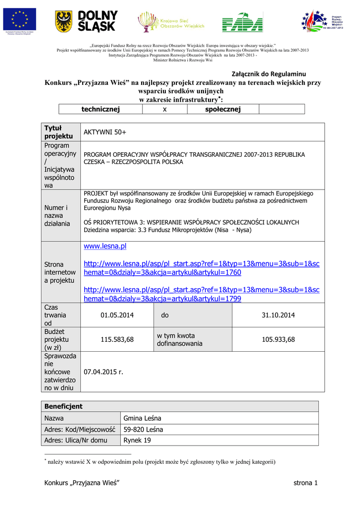 „Europejski Fundusz Rolny na rzecz Rozwoju Obszarów Wiejskich: Europa inwestująca w obszary wiejskie.” Projekt współfinansowany ze środków Unii Europejskiej w ramach Pomocy Technicznej Programu Rozwoju Obszarów Wiejskich na lata 2007-2013 Instytucja Zarządzająca Programem Rozwoju Obszarów Wiejskich na lata 2007-2013 Minister Rolnictwa i Rozwoju Wsi Załącznik do Regulaminu Konkurs „Przyjazna Wieś” na najlepszy projekt zrealizowany na terenach wiejskich przy wsparciu środków unijnych w zakresie infrastruktury: technicznej społecznej x Tytuł projektu Program operacyjny / Inicjatywa wspólnoto wa Numer i nazwa działania AKTYWNI 50+ PROGRAM OPERACYJNY WSPÓŁPRACY TRANSGRANICZNEJ 2007-2013 REPUBLIKA CZESKA – RZECZPOSPOLITA POLSKA PROJEKT był współfinansowany ze środków Unii Europejskiej w ramach Europejskiego Funduszu Rozwoju Regionalnego oraz środków budżetu państwa za pośrednictwem Euroregionu Nysa OŚ PRIORYTETOWA 3: WSPIERANIE WSPÓŁPRACY SPOŁECZNOŚCI LOKALNYCH Dziedzina wsparcia: 3.3 Fundusz Mikroprojektów (Nisa - Nysa) www.lesna.pl Strona internetow a projektu http://www.lesna.pl/asp/pl_start.asp?ref=1&typ=13&menu=3&sub=1&sc hemat=0&dzialy=3&akcja=artykul&artykul=1760 http://www.lesna.pl/asp/pl_start.asp?ref=1&typ=13&menu=3&sub=1&sc hemat=0&dzialy=3&akcja=artykul&artykul=1799 Czas trwania od Budżet projektu (w zł) Sprawozda nie końcowe zatwierdzo no w dniu 01.05.2014 115.583,68 do w tym kwota dofinansowania 31.10.2014 105.933,68 07.04.2015 r. Beneficjent Nazwa Gmina Leśna Adres: Kod/Miejscowość 59-820 Leśna Adres: Ulica/Nr domu Rynek 19 należy wstawić X w odpowiednim polu (projekt może być zgłoszony tylko w jednej kategorii) Konkurs „Przyjazna Wieś” strona 1 „Europejski Fundusz Rolny na rzecz Rozwoju Obszarów Wiejskich: Europa inwestująca w obszary wiejskie.” Projekt współfinansowany ze środków Unii Europejskiej w ramach Pomocy Technicznej Programu Rozwoju Obszarów Wiejskich na lata 2007-2013 Instytucja Zarządzająca Programem Rozwoju Obszarów Wiejskich na lata 2007-2013 Minister Rolnictwa i Rozwoju Wsi Osoba uprawniona do reprezentacji beneficjenta Imię Nazwisko Mirosław Markiewicz Stanowisko/Funkcja Burmistrz Telefon 75 72 11 239 Osoba do kontaktu Imię Nazwisko Bogusława Sidor Stanowisko/Funkcja Inspektor ds. środków unijnych Telefon 75 72 11 239 wew. 32 E-mail [email protected] Adres do korespondencji Adres: Kod/Miejscowość 59-820 Leśna Adres: Ulica/Nr domu Rynek 19 Cel Projektu Celem projektu było przeciwdziałanie społecznemu wykluczeniu osób starszych oraz walka ze stereotypowym wizerunkiem nieaktywnego seniora, poprzez organizowanie działań sportowo - edukacyjnych skierowanych do środowiska osób starszych. Dotychczasowa współpraca transgraniczna skupiała się głównie na podejmowaniu działań, gdzie grupę docelową stanowili przeważnie osoby młode i w średnim wieku. Tym razem wspólnie z zaprzyjaźniona gminą czeską, z udziałem środków EWT Czechy - Polska, postanowiliśmy stworzyć projekt, którego głównym adresatem będzie starsze pokolenie pogranicza polsko - czeskiego. Projekt polegał przede wszystkim na wzajemnym poznaniu się SENIORÓW, wymianie doświadczeń poprzez uczestnictwo we wspólnych inicjatywach. Działania zrealizowane w ramach projektu Projekt obejmował działania infrastrukturalne – budowę siłowni zewnętrznej, postawienie ławek przystankowych oraz szereg działań "miękkich” polegających na przeprowadzeniu warsztatów tematycznych wśród 30 Seniorów z Polski oraz 10 z Czech. Beneficjenci uczestniczyli w kursach decoupagu, kosmetologii, układania kwiatów, nauki gry w szachy, zdrowego odżywiania. Ponadto każdy z nich otrzymał kijki do uprawiania nordic – walking oraz przeszedł specjalistyczny trening stanowiący wstęp do uprawiania tego sportu. Część grupy wzięła nawet udział w organizowanym w październiku tego roku ogólnopolskim półmaratonie leśniańskim, co świadczy o zainicjowaniu w ramach naszego projektu nowego, zdrowego trendu wśród „starszej młodzieży”. Zdecydowana większość grupy zaczęła regularne treningi, zachęcając tym samym innych do naśladowania. W ramach projektu aktywni Seniorzy zwiedzili Konkurs „Przyjazna Wieś” strona 2 „Europejski Fundusz Rolny na rzecz Rozwoju Obszarów Wiejskich: Europa inwestująca w obszary wiejskie.” Projekt współfinansowany ze środków Unii Europejskiej w ramach Pomocy Technicznej Programu Rozwoju Obszarów Wiejskich na lata 2007-2013 Instytucja Zarządzająca Programem Rozwoju Obszarów Wiejskich na lata 2007-2013 Minister Rolnictwa i Rozwoju Wsi również Zamek Czocha oraz Zamek w czeskim Frydlancie, a także ZOO w Libercu. Każde ze spotkań cieszyło się niemalże stu procentową frekwencją. Gminie, jako realizatorowi, zależało aby każde ze spotkań przebiegało profesjonalnie, dlatego do przeprowadzenia warsztatów zatrudniono fachową kadrę dydaktyczną. Każdemu z uczestników poświęcono potrzebny czas i zainteresowanie. Na każdym spotkaniu zapewniono smaczny catering oraz tłumacza. Cieszył nas fakt, jak wiele radości sprawił ten projekt. Seniorzy zaczęli zapraszać się nawzajem, chcieli pokazać najpiękniejsze zakątki swoich miejscowości. Kilkakrotnie, zorganizowali wieczorki taneczne, które również cieszyły się bardzo dużym zainteresowaniem. Dzięki realizacji projektu udało nam się osiągnąć cel główny, jakim była aktywizacja społeczna – sprawienie, by seniorzy wyszli z domów i spotkali się ze sobą w miejscu publicznym. Chcieliśmy stworzyć przyjazną przestrzeń, która umożliwiła im nawiązywanie nowych kontaktów oraz otworzyła ich na innych ludzi. Kolejnym ważnym elementem jest rozbudzanie w nich chęci do dzielenia się swoją wiedzą, pasją z innymi. Konkurs „Przyjazna Wieś” strona 3