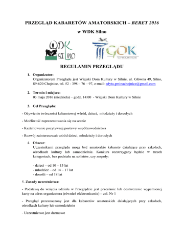 PRZEGLĄD KABARETÓW AMATORSKICH – BERET 2016 w WDK Silno REGULAMIN PRZEGLĄDU 1. Organizator: Organizatorem Przeglądu jest Wiejski Dom Kultury w Silnie, ul. Główna 49, Silno, 89-620 Chojnice, tel. 52 - 398 – 76 – 97, e-mail: [email protected] 2. Termin i miejsce: 03 maja 2016 (niedziela) – godz. 14:00 - Wiejski Dom Kultury w Silnie 3. Cel Przeglądu: - Ożywienie twórczości kabaretowej wśród, dzieci, młodzieży i dorosłych - Możliwość zaprezentowania się na scenie - Kształtowanie pozytywnej postawy współzawodnictwa - Rozwój zainteresowań wśród dzieci, młodzieży i dorosłych 4. Obszar: Uczestnikami przeglądu mogą być amatorskie kabarety działające przy szkołach, ośrodkach kultury lub samodzielnie. Konkurs rozstrzygany będzie w trzech kategoriach, bez podziału na solistów, czy zespoły: - dzieci – od 10 – 13 lat - młodzież – od 14 – 17 lat - dorośli – od 18 lat 5. Zasady uczestnictwa: - Podstawą do wzięcia udziału w Przeglądzie jest przesłanie lub dostarczenie wypełnionej karty na adres organizatora (również elektronicznie) – zał. Nr 1 - Przegląd przeznaczony jest dla kabaretów amatorskich działających przy szkołach, ośrodkach kultury lub samodzielnie - Uczestnictwo jest darmowe - Organizator dopuszcza możliwość przedstawienia skeczów nagradzanych wcześniej na innych przeglądach - Prezentacja nie powinna być dłuższa, niż 15 minut + 5 minut przygotowań na scenie. W przypadku dłuższych prezentacji należy zgłosić ten fakt organizatorowi. Organizator zastrzega sobie prawo dopuszczenia takiego przedstawienia do konkursu - Organizator zastrzega sobie prawo do przerwania występu, jeżeli trwa on dłużej niż 15 minut, a nie zostało to wcześniej zgłoszone - Prezentacja nie może zawierać treści wulgarnych ani obraźliwych - O kolejności występów decyduje organizator - Prezentacje mają charakter otwarty dla publiczności - Kolejność występów zostanie ogłoszona pod koniec kwietnia na stronie GOK Chojnice, oraz na Facebooku WDK Silno - Organizator zapewnia obsługę techniczną w podstawowe sprzęty nagłośnieniowe (mikrofony, głośniki) oraz garderobę - Uczestnicy występują na scenie, znajdującej się w WDK Silno - Ilość miejsc ograniczona – decyduje kolejność zgłoszeń - W przypadku małego zainteresowania, organizator zastrzega sobie prawo do odwołania przeglądu - Zgłoszenie do udziału w Przeglądzie jest równoznaczne z zaakceptowaniem regulaminu, oraz wyrażeniem zgody na publikację wizerunku oraz danych kabaretu w celach promocyjnych i dokumentacyjnych, na potrzeby WDK Silno oraz GOK Chojnice - Dojazd uczestników odbywa się na ich koszt własny 6. Kryteria oceny: - Prezentacje oceniać będzie Jury powołane przez organizatora - Ocenie podlega: - treść dostosowana do wieku i poziomu uczestników - umiejętności aktorskie - kontakt z widzem - scenografia oraz kostiumy - Po obejrzeniu Przeglądu Jury dokona podliczenia głosów - O podziale nagród oraz przyznaniu ewentualnych wyróżnień decyduje Jury - Werdykt Jury jest ostateczny - Rozdanie nagród nastąpi w dniu Przeglądu, po jego zakończeniu i ogłoszeniu werdyktu Zał. Nr 1 do regulaminu Przeglądu Kabaretów Amatorskich „Beret 2016” w Wiejskim Domu Kultury w Silnie Przegląd Kabaretów Amatorskich BERET 2016 Nazwa Kabaretu Liczba uczestników Kategoria wiekowa Czas trwania występu Czas przygotowania do występu na scenie Kontakt, telefon, adres email Ilość potrzebnych mikrofonów Informacje o artyście/ kabarecie. Krótki opis Tytuł skeczu Autor skeczu