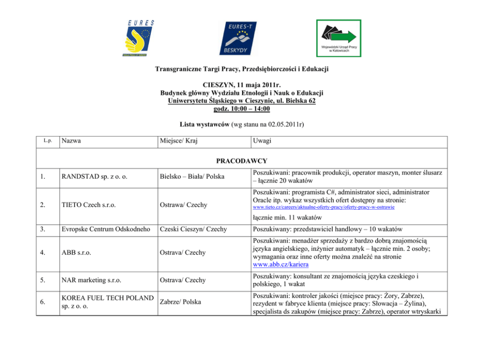 Transgraniczne Targi Pracy, Przedsiębiorczości i Edukacji CIESZYN, 11 maja 2011r. Budynek główny Wydziału Etnologii i Nauk o Edukacji Uniwersytetu Śląskiego w Cieszynie, ul. Bielska 62 godz. 10:00 – 14:00 Lista wystawców (wg stanu na 02.05.2011r) L.p. Nazwa Miejsce/ Kraj Uwagi PRACODAWCY 1. 2. RANDSTAD sp. z o. o. TIETO Czech s.r.o. Bielsko – Biała/ Polska Ostrawa/ Czechy Poszukiwani: pracownik produkcji, operator maszyn, monter ślusarz – łącznie 20 wakatów Poszukiwani: programista C#, administrator sieci, administrator Oracle itp. wykaz wszystkich ofert dostępny na stronie: www.tieto.cz/careers/aktualne-oferty-pracy/oferty-pracy-w-ostrawie łącznie min. 11 wakatów 3. Evropske Centrum Odskodneho Czeski Cieszyn/ Czechy Poszukiwany: przedstawiciel handlowy – 10 wakatów 4. ABB s.r.o. Ostrava/ Czechy Poszukiwani: menadżer sprzedaży z bardzo dobrą znajomością języka angielskiego, inżynier automatyk – łącznie min. 2 osoby; wymagania oraz inne oferty można znaleźć na stronie www.abb.cz/kariera 5. NAR marketing s.r.o. Ostrava/ Czechy Poszukiwany: konsultant ze znajomością języka czeskiego i polskiego, 1 wakat 6. KOREA FUEL TECH POLAND Zabrze/ Polska sp. z o. o. Poszukiwani: kontroler jakości (miejsce pracy: Żory, Zabrze), rezydent w fabryce klienta (miejsce pracy: Słowacja – Żylina), specjalista ds zakupów (miejsce pracy: Zabrze), operator wtryskarki (miejsce pracy: Zabrze), łącznie 7 wakatów 7. ADECCO POLAND Bielsko – Biała/ Polska Poszukiwani pracownicy na stanowiska produkcyjne, specjalistyczne i menedżerskie do różnych branż 8. HUISMAN KONSTRUKCE s.r.o. Sviadnov/ Czechy Poszukiwani m. in.: ślusarze, spawacze, operatorzy CNC, monterzy, hydraulicy, elektrycy, łącznie ok. 50 wakatów 9. MEGA Service Centrum sp. z o. o. Katowice/ Polska brak danych 10. Advanced World Transport a.s. Ostrava/ Czechy Poszukiwani: maszyniści kolejowi, dyrektor handlowy ze znajomością języka angielskiego, łącznie 7 wakatów 11. DEMA MIX MARKETING Szarsza/ Polska Poszukiwani: konsultant ds. promocji, konsultant ds. marketingu sieciowego (łącznie 10 wakatów) 12. MANPOWER Polska sp. z o. o. Bielsko – Biała/ Polska Poszukiwani: elektromonterzy, ślusarze, operatorzy maszyn (min. 3 wakaty) 13. FHU COMFORT Zebrzydowice/ Polska Poszukiwani: fryzjerka, kosmetyczka (łącznie 2 wakaty) 14. m&m creation group s.r.o Ostrava/ Czechy Poszukiwany: koordynator logistyki ze znajomością języka czeskiego i polskiego 15. Fabryka Automatyki „FACH“ S.A Cieszyn/ Polska Poszukiwani: technolog – konstruktor, specjalista ds. zakupów, kierownik działu sprzedaży i marketingu (łącznie 4 wakaty) 16. Profesja IT Tomasz Kuliś Opole/ Polska Poszukiwany: programista PHP (1 wakat) Warszawa/ Polska Poszukiwani: konsultant ds. monitorowania systemów, administrator systemów Windows, administrator systemów Unix, programista PHP, HR reasercher z wykształceniem kierunkowym i dobrą znajomością języków obcych - angielski, francuski, niemiecki, (łącznie 10 wakatów) 17. Cyclad Sp. z o. o. UCZELNIE WYŻSZE 18. Wyższa Szkoła Administracji Bielsko – Biała/ Polska Największa niepubliczna uczelnia na Podbeskidziu (wg raportu magazynu „Perspektywy” za 2010r. ), prowadzi: - 2- letnie studia magisterskie (uzupełniające) na kierunkach: stosunki międzynarodowe, pedagogika, - 3 – letnie studia licencjackie na kierunkach: stosunki międzynarodowe, pedagogika, fizjoterapia, administracja, kulturoznawstwo, - studia podyplomowe. Jedna z największych uczelni w Polsce i 19. Uniwersytet Śląski Katowice/ Sosnowiec/ Chorzów/ Rybnik/ Cieszyn 20. Państwowa Wyższa Szkoła Zawodowa Nysa/ Polska 21. Wyższa Szkoła Finansów i Prawa Bielsko – Biała/ Polska Europie. Uniwersytet Śląski tworzy 12 wydziałów oraz jednostki ogólnouczelniane, na których kształci się blisko 40 tys. studentów i doktorantów z kraju i zagranicy. Uczelnia zapewnia kandydatom możliwość wyboru spośród 45 kierunków i blisko 130 specjalności na studiach: licencjackich, inżynierskich, magisterskich, doktoranckich i podyplomowych. Uniwersytet Śląski w Katowicach to także: .ponad 40 lat pracy naukowej i dydaktycznej; .5 miast uniwersyteckich: Katowice, Sosnowiec, Chorzów, Rybnik i Cieszyn; .unikatowe kierunki i specjalności; .nowoczesne zaplecze naukowo-badawcze; .aktywna współpraca międzynarodowa; .ponad 200 kół naukowych i sekcji sportowych; .10 akademików w trzech miastach; .Biuro Wsparcia Studenta, Biuro Karier, Biuro ds. Osób Niepełnosprawnych, Dział Studenckich Spraw Socjalnych, Rzecznik Praw Studenta oraz Uczelniana Rada Samorządu Studenckiego. PWSZ w Nysie powstała w roku 2001. Obecnie kształci na kierunkach: architektura i urbanistyka, konserwacja i ochrona zabytków, bezpieczeństwo wewnętrzne, dietetyka, dziennikarstwo i komunikacja społeczna, filologia angielska, filologia germańska, język biznesu angielski, finanse i rachunkowość, historia, informatyka, jazz i muzyka estradowa, kosmetologia, pielęgniarstwo, ratownictwo medyczne, zarządzanie i inżynieria produkcji, zdrowie publiczne. Studia podyplomowe: zabezpieczenie społeczne; system i instrumentarium Orffa w muzyce estradowej; nauczyciel języka niemieckiego jako języka mniejszości narodowej. Dawna Wyższa Szkoła Bankowości i Finansów. Prowadzi w systemie stacjonarnym i niestacjonarnym studia I stopnia z zakresu bezpieczeństwa wewnętrznego, informatyki, politologii, I i II stopnia z finansów, rachunkowości oraz jednolite studia magisterskie na kierunku prawo. 22. 23. Akademia Techniczno – Humanistyczna Wyższa Szkoła Biznesu Bielsko – Biała/ Polska Dąbrowa Górnicza/ Polska Akademia Techniczno-Humanistyczna, dawna filia Politechniki Łódzkiej w Bielsku-Białej jest największą uczelnią techniczną i humanistyczną działającą na terenie Śląska Cieszyńskiego, Żywiecczyzny i Zachodniej Małopolski. Od 30 lat kształcą się w niej kadry inżynierskie dla przemysłu: