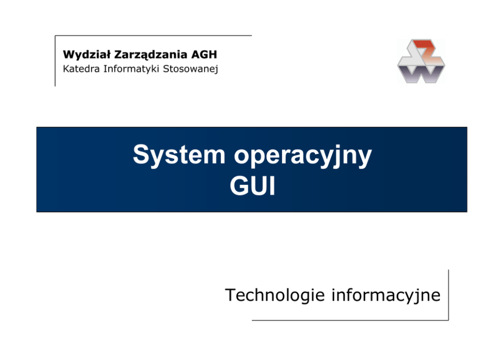 Wydział Zarządzania AGH Katedra Informatyki Stosowanej System operacyjny GUI Technologie informacyjne Co to jest system operacyjny? Systemy operacyjne dla komputerów osobistych Graficzny interfejs uŜytkownika Windows jako przykład GUI Technologie informacyjne Systemy operacyjne i GUI 2 System operacyjny Jest zestawem programów umoŜliwiających zarządzanie komputerem oraz danymi w pamięci operacyjnej i zewnętrznej. wykonywanie poleceń (programów), instalowanie i obsługa urządzeń zewnętrznych (pośredniczenie między sprzętem a programami i uŜytkownikiem), zarządzanie zbiorami programów i danych, zarządzanie pamięcią operacyjną. Technologie informacyjne Podstawowymi funkcjami SO są: 3 Podstawowe cechy SO przetwarzanie wsadowe zadania (zlecenia uŜytkownika) czekają w kolejce na przetworzenie: jedno z nich jest przetwarzane, przy czym zadanie, którego przetwarzanie zostało raz zainicjowane musi być przetwarzane do końca, wieloprogramowość jest to sposób wykorzystania komputera, pozwalający wykonywać więcej niŜ jeden program w taki sposób, Ŝe Ŝaden z nich nie musi być zakończony, zanim jakiś inny zostanie rozpoczęty lub wznowiony (pojęcia związane: podział czasu i podział pamięci), Technologie informacyjne 4 Podstawowe cechy SO wielodostęp bezpośrednie wykorzystanie komputera przez co najmniej dwóch uŜytkowników jednocześnie (pozornie jednocześnie) w taki sposób, Ŝe Ŝaden z nich nie musi być świadomy postępowania pozostałych uŜytkowników, pamięć wirtualna mechanizm wykorzystania pamięci zewnętrznej polegający na przetrzymywaniu w niej części programu i wczytywaniu go do pamięci operacyjnej w razie potrzeby, co umoŜliwia wykonywanie programu o rozmiarze większym niŜ dostępna pamięć operacyjna. Technologie informacyjne 5 Podstawowe cechy SO program sekwencja instrukcji zapisana w pliku dyskowym zamieniająca się w instancję programu (proces) w momencie załadowania do pamięci operacyjnej komputera, proces (zadanie) to kaŜda uruchomiona aplikacja; obejmuje on kod programu, prywatną przestrzeń adresową oraz przynajmniej jeden wątek, wątek składnik procesu (strumień rozkazów), który jest wykonywany (unit of execution); wątek korzysta z zasobów oraz przestrzeni adresowej procesu, do którego naleŜy. Technologie informacyjne 6 Podstawowe cechy SO Zarządzanie procesami jest podstawowym zadaniem SO i obejmuje: alokowanie zasobów do procesów, organizację wymiany danych między procesami, ochrona zasobów procesów przed niepoŜądanym wpływem innych procesów, KaŜdy proces znajduje się w jednym, spośród kilku moŜliwych, stanów np. gotowy, działający, zablokowany, zatrzymany. SO przechowuje podstawowe informacje o tych stanach oraz uŜywanych zasobach (ang. track – ślad) i zarządza przechodzeniem między nimi. Technologie informacyjne synchronizację współpracy procesów. 7 Podstawowe cechy SO wielowątkowość polega na dzieleniu czasu pracy procesora na krótkie okresy (rzędu milisekund) i przydzielaniu ich poszczególnym wątkom. Kiedy czas przeznaczony dla danego wątku mija, kontekst (stan) jego pracy jest zapamiętywany, a jego miejsce zajmuje kontekst następnego wątku (o najwyŜszym priorytecie spośród wątków będących w stanie gotowości). Przełączanie pomiędzy wątkami realizują tzw. schedulery. Źródło: old.wb.pb.edu.pl/Materialy/KOS/Andraka%20Dariusz/pinfo7b.pdf Technologie informacyjne oznacza zdolność SO do obsługi wielu wątków w ramach jednego procesu. Np. kaŜde okno folderu Eksploratora Windows stanowi odrębny wątek. Gdy uŜytkownik rozpocznie kopiowanie czy przenoszenie plików z jednego okna do drugiego, operacja ta jest obsługiwana przez okno docelowe. W tym czasie, nie czekając na zakończenie kopiowania, moŜemy w innym oknie wykonywać inne czynności. 8 Podstawowe cechy SO jednoprogramowe, jednodostępne, wieloprogramowe, jednodostępne, wieloprogramowe, wielodostępne, jednoprogramowe, wielodostępne. Technologie informacyjne Klasyfikacja SO z punktu widzenia moŜliwości jednoczesnej realizacji wielu programów i pracy wielu uŜytkowników w tym samym czasie: 9 jednoprogramowe i jednodostępne DOS (Disk Operating System): MS-DOS, PC-DOS, itp., UNIX, LINUX - uniwersalny system operacyjny pozwalający na wielodostęp i wieloprogramowość, Windows, OS/2, MAC OS, itp. - systemy zorientowane graficznie, w których opcje dostępne dla uŜytkownika są zawarte w liście (menu) bądź reprezentowane przez odpowiednio dobrane piktogramy; systemy wieloprogramowe, jedno- lub wielodostępne. Google Chrome OS – oparty na Ubuntu, OS ma być szybki i lekki uruchamiać się w przeciągu kilku sekund; interfejs ma nie przytłaczać uŜytkownika. Technologie informacyjne SO dla komputerów osobistych 10 Technologie informacyjne Od Windows 1.0 do Windows XP Źródło: old.wb.pb.edu.pl/Materialy/KOS/Andraka%20Dariusz/pinfo7b.pdf 11 Dzięki nazwom, zbiory stanowią dla systemu operacyjnego oddzielne, rozróŜnialne obiekty. Plik - zbiór danych powiązanych ze sobą. Dokument - efekt pracy uŜytkownika zapisany przez program uŜytkowy w postaci pliku. Nazwa składa się z 1-255 dowolnych znaków (moŜna uŜywać spacji i polskich liter). NAZWA PRAWIDLOWA.ROZ Trójznakowe rozszerzenie identyfikowania typu pliku. nazwy zazwyczaj słuŜy do Technologie informacyjne SO - nazwy zbiorów (plików) 12 SO - katalogi (foldery) W celu ułatwienia zarządzania zbiorami w pamięci masowej zbiory zorganizowane są w struktury zwane katalogami (directory). Katalog (folder) jest zbiorem plików zgrupowanych pod wspólną nazwą. Elementem kaŜdego katalogu moŜe być katalog rzędu niŜszego tzw. podkatalog (subdirectory). Na kaŜdym dysku znajduje się katalog główny (root directory), który moŜe zawierać róŜne pliki i podkatalogi. Główną zaletą takiej organizacji jest hierarchizacja plików zgodna z celami uŜytkownika. Ponadto, kaŜdy katalog jest odizolowany od 