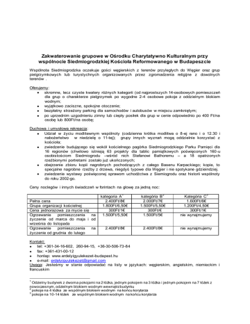Zakwaterowanie grupowe w Ośrodku Charytatywno Kulturalnym przy wspólnocie Siedmiogrodzkiej Kościoła Reformowanego w Budapeszcie Wspólnota Siedmiogrodzka oczekuje gości węgierskich z terenów przyległych do Węgier oraz grup pielgrzymkowych lub turystychnych organizowanych przez zgromadzenia religijne z dowolnych terenów . Oferujemy: skromne, lecz czyste kwatery różnych kategorii (od najprostszych 14-osobowych pomieszczeń dla grup o charakterze pielgrzymek po wygodne 2-4 osobowe pokoje z oddzielnym blokiem wodnym; wyjątkowo zaciszne, spokojne otoczenie; bezpłatny strzeżony parking dla samochodów i autobusów w miejscu zamkniętym; po uprzednim uzgodnieniu zimny lub ciepły posiłek dla grup w cenie odpowiednio po 400 Ft/na osobę lub 800Ft/na osobę; Duchowa i umysłowa rekreacja: Udział w życiu modlitewnym wspólnoty (codzienna krótka modlitwa o 8-ej rano i o 12.30 i nabożeństwo w niedzielę o 11-tej); grupy innych wyznań mogą oddzielnie korzystać z kościoła; zwiedzenie budującego się wokół kościelnego pagórka Siedmiogrodzkiego Parku Pamięci dla 16 regionów (chwilowo istnieją 63 projekty dla tablic pamiątkowych poświęconych 160-u osobistościom Siedmiogrodu –wśród nich Stefanowi Bathoremu – a 18 opatrzonych rzeźbionymi portretami zostało już ukończonych; obejrzenie zbioru kopii nagrobnych pochodzących z całego Basenu Karpackiego; kopie, to specjalne nagrobne rzeźby z drzewa, niegdyś typowe dla Węgier i nie spotykane gdzieindziej. zwiedzenie wystawy poświęconej sprawom uchodźctwa z Siemiogrodu oraz historii wspólnoty do roku 2002-go. Ceny noclegów i innych świadczeń w forintach na głowę za jedną noc: 1 Pełna cena Grupa organizacji kościelnej Cena jednorazowa za mycie się Ogrzewanie pomieszczenia na życzenie od marca do maja i od września do listopada Ogrzewanie pomieszczenia na życzenie od grudnia do lutego 2 3 kategoria A 2.400Ft/8€ 1.800Ft/6,50€ 300Ft/1€ 1.500Ft/5,50€ kategória B 2.000Ft/7€ 1.500Ft/5,50€ 300Ft/€ 1.500Ft/5€ Kategória C 1.600Ft/6€ 1.200Ft/4,50€ 300Ft/1€ nie wynajmujemy 2.400Ft/8€ 2.400Ft/8€ nie wynajmujemy Kontakt: tel: +361-34-16-602, 260-94-15, +36-30-506-73-84 fax: +361-431-00-12 honlap: www.erdelyigyulekezet-budapest.hu e-mail: [email protected] Uwaga: Jesteśmy w stanie odpowiadać na listy w językach: węgierskim, angielskim, niemieckim i francuskim 1 Odzielny budynek z dwoma pokojami na 2 łóżka, jednym pokojem na 3 łóżka i jednym pokojem na 7 łóżek z nowoczesnym, odzielnym blokiem wodnym wewnątrz budynku 2 pokoje na 4 łóżka ze wspólnym blokiem wodnym na końcu korytarza 3 pokoje na 10-14 łóżek ze wspólnym blokiem wodnym na końcu korytarza