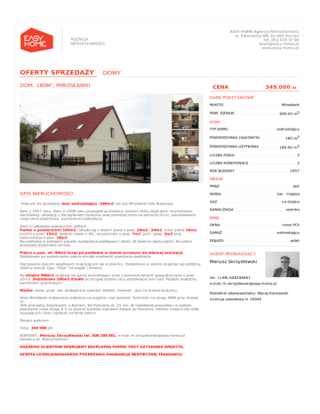 EASY-HOME Agencja Nieruchomości ul. Półwiejska 9/8, 61-885 Poznań tel. (61) 670 37 00 [email protected] www.easy-home.pl OFERTY SPRZEDAŻY DOMY DOM, 180M 2, MIROSŁAWKI CENA 349.000 ZŁ DANE PODSTAWOWE MIASTO POW. DZIAŁKI Mirosławki 900.00 m 2 DOM TYP DOMU wolnostojący POWIERZCHNIA CAŁKOWITA 180 m 2 POWIERZCHNIA UŻYTKOWA 180.00 m 2 LICZBA POKOI 3 LICZBA KONDYGNACJI 2 ROK BUDOWY 1957 MEDIA PRĄD OPIS NIERUCHOMOŚCI Polecam do sprzedaży dom wolnostojący (180m2) we wsi Mirosławki koło Stęszewa. Dom z 1957 roku. Dom w 2008 roku przeszedł gruntowny remont, który objął dach (wymieniono dachówkę), elewację z dociepleniem budynku oraz pomieszczenia na parterze (m.in. zainstalowano nowe okna plastikowe, wymieniono kaloryfery). WODA GAZ KANALIZACJA OKNA Piętro o pow. ok. 80m2 licząc po podłodze w stanie surowym do własnej aranżacji. Dodatkowo po wykończeniu piętra istnieje możliwość powstania poddasza. AGENT PROWADZĄCY Na działce 900m2 znajduje się garaż wolnostojący wraz z pomieszczeniami gospodarczymi o pow. 35m2. Dodatkowo 100m2 działki po drugiej stronie ulicy stanowiącej mini sad. Podjazd wyłożony kamieniem granitowym. Media: woda, prąd, siła, ekologiczne szambo, telefon, Internet , gaz na ścianie budynku. Wieś Mirosławki malowniczo położona na wzgórzu nad jeziorem Tomickim na skraju WNP przy drodze nr. 306 pomiędzy Stęszewem, a Bukiem. Do Poznania ok. 25 km. W niedalekiej przyszłości w pobliżu powstanie nowa droga S 5 co jeszcze bardziej usprawni dojazd do Poznania. Idealne miejsce dla osób szukających ciszy i spokoju na łonie natury. Gorąco polecam. Cena: 349 000 pln KONTAKT: Mariusz Skrzydlewski tel. 608 298 861, e-mail: [email protected] Doradca ds. Nieruchomości. KAŻDEMU KLIENTOWI OFERUJEMY BEZPŁATNĄ POMOC PRZY UZYSKANIU KREDYTU. OFERTA LICENCJONOWANEGO POŚREDNIKA GWARANCJĄ BEZPIECZNEJ TRANSAKCJI. tak - miejska na działce szambo INNE Dom o całkowitej powierzchni 180m2. Parter o powierzchni 105m2 i składa się z dwóch pokoi o pow. 24m2 i 24m2, trzeci pokój 16m2, kuchni o pow. 13m2, łazienki razem z WC i prysznicem o pow. 7m2, pom. gosp. 3m2 oraz komunikacja o pow. 18m2. Na podłodze w pokojach panele, wykładzina podłogowa i deski. W łazience ładne płytki. Na piętro prowadzą drewniane schody. Ogrzewanie piecem węglowym znajdującym się w piwnicy. Dodatkowo w salonie znajduje się ozdobny, żeliwny piecyk typu ''koza" na węgiel i drewno. jest GARAŻ nowe PCV wolnostojący DOJAZD Mariusz Skrzydlewski tel.: (+48) 608298861 e-mail: [email protected] Pośrednik odpowiedzialny: Maciej Karwowski Licencja zawodowa nr 10940 asfalt