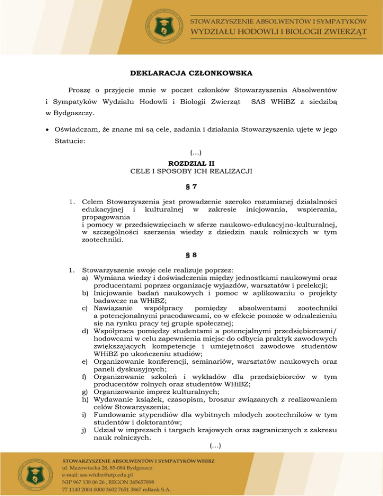 DEKLARACJA CZŁONKOWSKA Proszę o przyjęcie mnie w poczet członków Stowarzyszenia Absolwentów i Sympatyków Wydziału Hodowli i Biologii Zwierząt SAS WHiBZ z siedzibą w Bydgoszczy. Oświadczam, że znane mi są cele, zadania i działania Stowarzyszenia ujęte w jego Statucie: (…) ROZDZIAŁ II CELE I SPOSOBY ICH REALIZACJI §7 1. Celem Stowarzyszenia jest prowadzenie szeroko rozumianej działalności edukacyjnej i kulturalnej w zakresie inicjowania, wspierania, propagowania i pomocy w przedsięwzięciach w sferze naukowo-edukacyjno-kulturalnej, w szczególności szerzenia wiedzy z dziedzin nauk rolniczych w tym zootechniki. §8 1. Stowarzyszenie swoje cele realizuje poprzez: a) Wymiana wiedzy i doświadczenia między jednostkami naukowymi oraz producentami poprzez organizację wyjazdów, warsztatów i prelekcji; b) Inicjowanie badań naukowych i pomoc w aplikowaniu o projekty badawcze na WHiBZ; c) Nawiązanie współpracy pomiędzy absolwentami zootechniki a potencjonalnymi pracodawcami, co w efekcie pomoże w odnalezieniu się na rynku pracy tej grupie społecznej; d) Współpraca pomiędzy studentami a potencjalnymi przedsiębiorcami/ hodowcami w celu zapewnienia miejsc do odbycia praktyk zawodowych zwiększających kompetencje i umiejętności zawodowe studentów WHiBZ po ukończeniu studiów; e) Organizowanie konferencji, seminariów, warsztatów naukowych oraz paneli dyskusyjnych; f) Organizowanie szkoleń i wykładów dla przedsiębiorców w tym producentów rolnych oraz studentów WHiBZ; g) Organizowanie imprez kulturalnych; h) Wydawanie książek, czasopism, broszur związanych z realizowaniem celów Stowarzyszenia; i) Fundowanie stypendiów dla wybitnych młodych zootechników w tym studentów i doktorantów; j) Udział w imprezach i targach krajowych oraz zagranicznych z zakresu nauk rolniczych. (…) Zobowiązuję się do ich przestrzegania i aktywnego uczestnictwa w działalności Stowarzyszenia oraz sumiennego wypełniania uchwał Władz i zapisów Statutu, a także dbania o dobre imię Stowarzyszenia. Jednocześnie wyrażam zgodę na przechowywanie i przetwarzanie moich danych osobowych przez Stowarzyszenie Absolwentów i Sympatyków Wydziału Hodowli i Biologii Zwierząt zgodnie z ustawą z dnia 29 sierpnia 1997 r. o ochronie danych osobowych/Dz.U. z 2002 r. Nr 101 poz. 926 z późn. zmian./ w celach związanych z działalnością statutową Stowarzyszenia. Przysługuje mi prawo wglądu w te dane, ich poprawianie lub uzupełnianie. Wrażam zgodę na otrzymywanie informacji związanych z działalnością Stowarzyszenia SAS WHiBZ droga mailową. Po zgłoszeniu Kandydat zobowiązany jest opłacić składkę członkowską w wysokości 50 zł na konto Stowarzyszenia SAS WHiBZ w terminie 14 dni. (nr konta 77 1140 2004 0000 3602 7651 3867 mBank S.A.). …………dn.......................... ……………………..……… własnoręczny podpis Stowarzyszenie Absolwentów i Sympatyków Wydziału Hodowli i Biologii Zwierząt SAS WHiBZ APLIKACJA CZŁONKOWSKA Nazwisko : Pan: Imię : Data urodzenia: Tytuł : Prof Dr Dr hab. Mgr Inż. Inny Pani Dane adresowe Firma/ Uniwersytet : Adres : Kod Pocztowy : Tel. 1 : Tel. 2 : E-mail : Data zgłoszenia : Typ członkostwa : Członek zwyczajny Poczta : Student Członek wspierający (firma) Wypełniony formularz można przesłać w formie elektronicznej na adres: [email protected] lub papierowej na adres: Stowarzyszenie SAS WHiBZ, ul Mazowiecka 28, 85-084 Bydgoszcz.