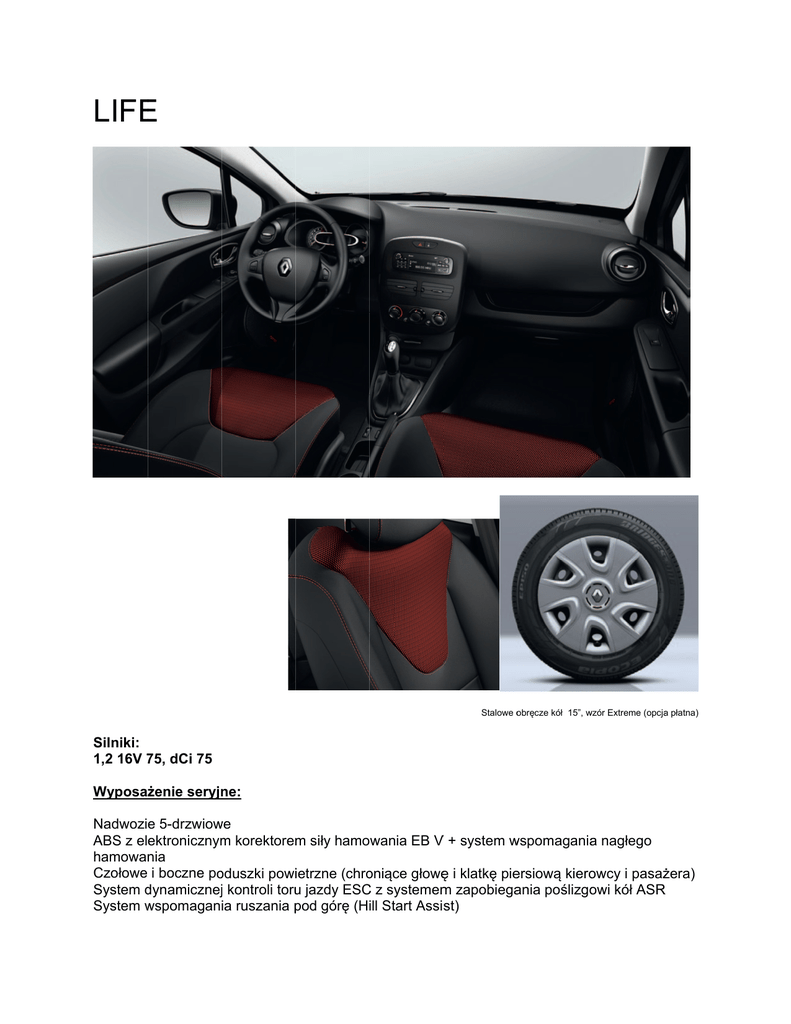 LIFE E Stalowe o obręcze kół 15”, w wzór Extreme (opcja a płatna) Silniki: 1,2 16V 75, 7 dCi 75 ne: Wyposażenie seryjn Nadwozie 5-drzwiow we ABS z elektronicznym m korektorem m siły hamowania EB V + system w wspomagania a nagłego hamowania Czołowe i boczne po oduszki powiietrzne (chro oniące głowę ę i klatkę pie ersiową kiero owcy i pasażżera) System dynamicznej d j kontroli toru u jazdy ESC C z systemem m zapobiega ania poślizgo owi kół ASR R System wspomagan w ia ruszania pod p górę (Hill Start Assisst) System mocowania fotelików dla dzieci Isofix Regulator – ogranicznik prędkości Komputer pokładowy Zespół wskaźników analogowo-cyfrowych Karta Renault (umożliwiająca włączanie silnika oraz otwieranie/zamykanie drzwi) Centralny zamek drzwi zdalnie sterowany Kartą Renault System Renault BASS REFLEX® Fotel kierowcy z regulacją wysokości Zagłówki przednie z regulacją wysokości Kierownica z regulacją wysokości i głębokości Światła do jazdy dziennej z diodami LED Elektrycznie regulowane szyby przednie Tylne szyby regulowane manualnie Lusterka boczne regulowane elektrycznie w czarnej obudowie o ziarnistej fakturze Instalacja do montażu radioodtwarzacza Przykrycie części bagażowej Zestaw do naprawy opon Przednia listwa z logo Renault w kolorze lśniącej czerni Boczne listwy ochronne oraz listwa zderzaka w kolorze czarnym o ziarnistej fakturze Wewnętrzne klamki drzwi chromowane Tapicerka materiałowa czarno-czerwona Stalowe obręcze kół 15 Opcje: Pakiet Klimat: klimatyzacja manualna i radioodtwarzacz 4x20 W, z Bluetooth®, USB i jack Pakiet Komfort: klimatyzacja manualna, system multimedialny Media Nav z ekranem dotykowym 7", nawigacją, radioodtwarzaczem z Bluetooth®, USB i Jack oraz Bass Reflex Pakiet Plus: światła przeciwmgłowe, wycieraczki przednie o zmiennej częstotliwości pracy Przegroda oddzielająca część pasażerską od bagażowej (opcja bezpłatna, konieczna do zmówienia) Wzór stalowych felg 15” Extreme Koło zapasowe DOSTĘPNE KOLORY: Szary Kasjopea, Czerwony Flamme, Szary Platynowy, Czarny Etoile, Brązowy Ardent , Biel Alpejska, Żółty Eclair, WYMIARY NOWE CLIO SOCIETE WYMIARY (mm) A Rozstaw osi 2589 B Długość całkowita 4063 C Przedni zwis 853 D Tylny zwis 621 E' Rozstaw kół przednich ( koła 15") 1509 F' Rozstaw kół tylnych ( koła 15") 1513 G Szerokość całkowita/ z rozłożonymi lusterkami wstecznymi H Wysokość pojazdu nieobciążonego H1 Wysokość z otwartą klapą pojazdu nieobciążonego J Wysokość progu bagażnika pojazdu nieobciążonego 1732 / 1945 1448 1920 716 K Prześwit pojazdu obciążonego ≥120 M Szerokość nad przednimi podłokietnikami 1363 N Szerokość na wysokości przednich podłokietników 1370 P Odległość od siedzenia do dachu pod kątem 14° na przednich siedzeniach Y Szerokość otworu bagażnika u góry Maksymnalna szerokość bagażnika 770 1038 Y1 Szerokość otworu bagażnika u dołu 905 Y2 Szerokość wewnętrzna między wnękami kół Z Wysokość otworu bagażnika Z1 Maksymalna długość bagażnika (od tylnej klapy, do przegrody ) Z3 Wysokość pod tylną półką 880 1011 550 1245 538 POJEMNOŚĆ BAGAŻNIKA (dm3) Pojemność VDA (norma ISO 3832) (do wysokości tylnej półki) 563 Pojemność maksymalna (do wysokości dachu) 911
