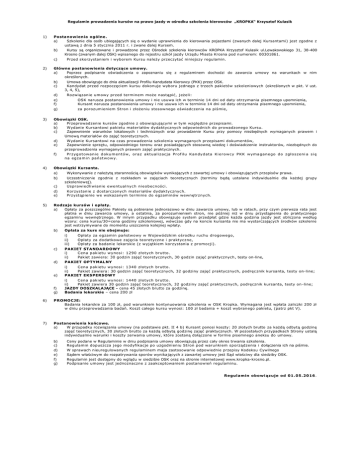 Regulamin prowadzenia kursów na prawo jazdy w ośrodku szkolenia kierowców „KROPKA“ Krzysztof Kulasik 1) Postanowienia ogólne. a) Szkolenie dla osób ubiegających się o wydanie uprawnienia do kierowania pojazdami (zwanych dalej Kursantami) jest zgodne z ustawą z dnia 5 stycznia 2011 r. i zwane dalej Kursem. b) c) 2) Kursy są organizowane i prowadzone przez Ośrodek szkolenia kierowców KROPKA Krzysztof Kulasik ul.Lewakowskiego 31, 38-400 Krosno (zwanym dalej OSK) wpisanego do rejestru szkół jazdy Urzędu Miasta Krosna pod numerem: 00301861. Przed skorzystaniem i wyborem Kursu należy przeczytać niniejszy regulamin. Główne postanowienia dotyczące umowy. a) Poprzez podpisanie oświadczenia o zapoznaniu się z regulaminem dochodzi do zawarcia umowy na warunkach w nim określonych. b) c) d) Umowa obowiązuje do dnia aktualizacji Profilu Kandydata Kierowcy (PKK) przez OSK. Kandydat przed rozpoczęciem kursu dokonuje wyboru jednego z trzech pakietów szkoleniowych (określonych w pkt. V ust. 3, 4, 5), Rozwiązanie umowy przed terminem może nastąpić, jeżeli: e) f) OSK narusza postanowienia umowy i nie usuwa ich w terminie 14 dni od daty otrzymania pisemnego upomnienia, Kursant narusza postanowienia umowy i nie usuwa ich w terminie 14 dni od daty otrzymania pisemnego upomnienia, g) za porozumieniem Stron i złożeniu stosownego oświadczenia na piśmie, 3) Obowiązki OSK. a) Przeprowadzenie kursów zgodnie z obowiązującymi w tym względzie przepisami. b) Wydanie Kursantowi pakietu materiałów dydaktycznych odpowiednich do prowadzonego Kursu. c) Zapewnienie warunków lokalowych i technicznych oraz prowadzenie Kursu przy pomocy niezbędnych wymaganych prawem i Umową materiałów do zajęć teoretycznych. d) Wydanie Kursantowi na czas prowadzenia szkolenia wymaganych przepisami dokumentów, e) Zapewnienie sprzętu, odpowiedniego terenu oraz posiadających stosowną wiedzę i doświadczenie instruktorów, niezbędnych do przeprowadzenia wymaganych prawem zajęć praktycznych. f) Przyg ot owa ni e d ok u m en tó w, ora z akt ualizacj a Pr ofilu Kan dy data Ki ero wcy P KK w yma ga nego d o zgł oszeni a si ę na egza mi n pa ńst wo w y. 4) Obowiązki Kursanta. a) b) c) d) e) 5) Wykonywanie z należytą starannością obowiązków wynikających z zawartej umowy i obowiązujących przepisów prawa. Uczestniczenie zgodnie z rozkładem w zajęciach teoretycznych (terminy będą ustalane indywidualnie dla każdej grupy szkoleniowej). Usprawiedliwianie ewentualnych nieobecności. Korzystanie z dostarczonych materiałów dydaktycznych. Przystąpienie we wskazanym terminie do egzaminów wewnętrznych. Rodzaje kursów i opłaty. a) Opłaty za poszczególne Pakiety są pobierane jednorazowo w dniu zawarcia umowy, lub w ratach, przy czym pierwsza rata jest płatna w dniu zawarcia umowy, a ostatnia, za porozumieniem stron, nie później niż w dniu przystąpienia do praktycznego egzaminu wewnętrznego. W innym przypadku obowiązuje system przedpłat gdzie każda godzina jazdy jest obliczona według wzoru: cena kursu/30=cena godziny szkoleniowej, wówczas gdy na koncie kursanta nie ma wystarczających środków szkolenie jest wstrzymywane do momentu uiszczenia kolejnej wpłaty. b) Opłata za kurs nie obejmuje: i) ii) iii) c) Opłaty za egzamin państwowy w Wojewódzkim ośrodku ruchu drogowego, Opłaty za dodatkowe zajęcia teoretyczne i praktyczne, Opłaty za badanie lekarskie (z wyjątkiem korzystania z promocji). d) PAKIET STANDARDOWY i) Cena pakietu wynosi: 1290 zł otych brutto. ii) Pakiet zawiera: 30 godzin zajęć teoretycznych, 30 godzin zajęć praktycznych, testy on-line, PAKIET OPTYMALNY e) i) Cena pakietu wynosi: 1340 zł otych brutto. ii) Pakiet zawiera: 30 godzin zajęć teoretycznych, 32 godziny zajęć praktycznych, podręc znik kursanta, testy on-line; PAKIET EKSPERSOWY f) g) i) Cena pakietu wynosi: 1440 zł otych brutto. ii) Pakiet zawiera 30 godzin zajęć teoretycznych, 32 godziny zajęć praktycznych, podręcznik kursanta, testy on -line; JAZDY DOSZKALAJĄCE - cena 45 złotych brutto za godzinę. Badania lekarskie – cena 200 zł 6) PROMOCJE: Badania lekarskie za 100 zł, pod warunkiem kontynuowania szkolenia w OSK Kropka. Wymagana jest wpłata zaliczki 200 zł w dniu przeprowadzania badań. Koszt całego kursu wynosi: 100 zł badania + koszt wybran ego pakietu, (patrz pkt V). 7) Postanowienia końcowe. a) W przypadku rozwiązania umowy (na podstawie pkt. II 4 b) Kursant ponosi koszty: 20 złotych brutto za każdą odbytą godzinę zajęć teoretycznych, 30 złotych brutto za każdą odbytą godzinę zajęć praktycznych. W pozostałych przypadkach Strony ustalą indywidualnie warunki i koszty zerwania umowy, które zostaną dołączone w formie pisemnego aneksu do umowy. b) c) d) e) f) g) Ceny podane w Regulaminie w dniu podpisania umowy obowiązują przez cały okres trwania szkolenia. Regulamin dopuszcza jego modyfikacje po uzgodnieniu Stron pod warunkiem sporządzenia i dołączenia ich na piśmie. W sprawach nieuregulowanych regulaminem maja zastosowanie odpowiednie przepisy Kodeksu Cywilnego Sądem właściwym do rozpatrywania sporów wynikających z zawartej umowy jest Sąd właściwy dla siedziby OSK. Regulamin jest dostępny do wglądu w siedzibie OSK oraz na stronie internetowej www.kropka-krosno.pl. Podpisanie umowy jest jednoznaczne z zaakceptowaniem postanowień regulaminu. Regula min obow iąz uj e od 01 . 05. 20 16 .