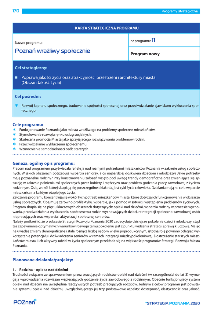 170 Programy strategiczne KARTA STRATEGICZNA PROGRAMU Nazwa programu: Poznań wrażliwy społecznie nr programu: 11 Program nowy Cel strategiczny: n Poprawa jakości życia oraz atrakcyjności przestrzeni i architektury miasta. (Obszar: Jakość życia) Cel pośredni: * Rozwój kapitału społecznego, budowanie spójności społecznej oraz przeciwdziałanie zjawiskom wykluczenia społecznego. Cele programu: * * * * * Funkcjonowanie Poznania jako miasta wrażliwego na problemy społeczne mieszkańców. Stymulowanie rozwoju rynku usług socjalnych. Skuteczna promocja Miasta jako sprzyjającego rozwiązywaniu problemów rodzin. Przeciwdziałanie wykluczeniu społecznemu. Wzmocnienie samodzielności osób starszych. Geneza, ogólny opis programu: Pracom nad programem przyświecała refleksja nad realnymi potrzebami mieszkańców Poznania w zakresie usług społecznych. W jakich obszarach potrzebują wsparcia seniorzy, a co najbardziej doskwiera dzieciom i młodzieży? Jakie potrzeby mają poznańskie rodziny? Przy konstruowaniu założeń wzięto pod uwagę trendy demograficzne oraz zmieniającą się sytuację w zakresie pełnienia ról społecznych przez kobiety i mężczyzn oraz problem godzenia pracy zawodowej z życiem rodzinnym. Osią, wokół której skupiają się poszczególne działania, jest cykl życia człowieka. Działania mają na celu wsparcie mieszkańca na każdym etapie jego życia. Założenia programu koncentrują się wokół tych potrzeb mieszkańców miasta, które dotyczą ich funkcjonowania w obszarze usług społecznych. Obejmują zarówno profilaktykę, wsparcie, jak i pomoc w sytuacji wystąpienia problemów życiowych. Program skupia się na pięciu kluczowych obszarach dotyczących: opieki nad dziećmi, wsparcia rodziny w procesie wychowania, przeciwdziałania wykluczeniu społecznemu rodzin wychowujących dzieci, reintegracji społeczno-zawodowej osób niepracujących oraz wsparcia i aktywizacji społecznej seniorów. Należy podkreślić, że o sukcesie Strategii Rozwoju Poznania 2030 zadecyduje dzisiejsze pokolenie dzieci i młodzieży, stąd też zapewnienie optymalnych warunków rozwoju temu pokoleniu jest z punktu widzenia strategii sprawą kluczową. Mając na uwadze zmiany demograficzne i stale rosnącą liczbę osób w wieku poprodukcyjnym, istotną rolę powinno odegrać wykorzystanie potencjału i doświadczenia seniorów w ramach integracji międzypokoleniowej. Dostrzeżenie starszych mieszkańców miasta i ich aktywny udział w życiu społecznym przekłada się na większość programów Strategii Rozwoju Miasta Poznania. Planowane działania/projekty: 1. Rodzina – opieka nad dziećmi Trudności związane ze sprawowaniem przez pracujących rodziców opieki nad dziećmi (w szczególności do lat 3) wymagają wprowadzenia rozwiązań wspierających godzenie życia zawodowego z rodzinnym. Obecnie funkcjonujący system opieki nad dziećmi nie uwzględnia rzeczywistych potrzeb pracujących rodziców. Jednym z celów programu jest powstanie systemu opieki nad dziećmi, uwzględniającego jej trzy podstawowe aspekty: dostępność, elastyczność oraz jakość. *STRATEGIA POZNANIA 2030 Programy strategiczne 171 Dostępność rozumiana jest tutaj jako odpowiednia infrastruktura i liczba miejsc, dostępność przestrzenna, dostępność finansowa – koszt opieki, który nie zniechęca do podejmowania zatrudnienia. Elastyczność zakłada tworzenie różnorodnych form opieki oraz dostosowywanie czasu pracy placówek i czasu opieki do różnych godzin pracy rodziców. Jakość opieki dla dzieci do lat trzech jest związana z odpowiednim podejściem do małych dzieci, przy czym istotne są: indywidualna i bliska relacja wychowawcy z dzieckiem, program dostosowany do potrzeb i możliwości rozwojowych małych dzieci, bezpieczna i inspirująca przestrzeń, wykwalifikowany i rozwijający swoje kompetencje personel, otwarta komunikacja i współpraca z rodzicami. Wysoki poziom opieki powinny zapewniać określone standardy (w tym uwzględnienie programu adaptacyjnego dostosowanego do indywidualnych potrzeb dziecka i rodziny) oraz regularny monitoring pracy placówek. Europejska Strategia Zatrudnienia zakłada, że do 2010 r. instytucjonalną opieką pozarodzinną powinno być objętych 33% dzieci w wieku 0-3 lata i 90% dzieci w wieku od 3 lat do osiągnięcia wieku obowiązku szkolnego. Założenia ustawy o formach opieki nad dziećmi w wieku do lat 3 z dnia 5 sierpnia 2009 r. wskazują na potrzebę zmian systemowych, opartych na wieloaspektowych działaniach, prowadzących do reformy tworzenia i działania zróżnicowanych, (w tym alternatywnych do żłobków), form opieki nad dziećmi w wieku do 3 lat. Obecnie opieką instytucjonalną jest objętych ok. 2% dzieci w tej grupie wiekowej. Ważne jest, aby Miasto wspierało inicjatywy zmierzające do powstania rynku usług w tym zakresie (odpowiedniego do potrzeb pracujących rodziców), mając na celu wypracowanie systemu tzw. „dobrych praktyk”. Wypromowane pilotażowe działania organizacji pozarządowych powinny pełnić funkcję pozytywnego bodźca dla innych podmiotów. Jednocześnie Miasto Poznań będzie wspierać działalność takich podmiotów poprzez preferencyjne warunki najmu lokali. Kluczowym elementem projektu jest stworzenie systemu bonów wartościowych finansowanych przez Miasto Poznań, które rodzice będą mogli wykorzystać poprzez zakup usługi w dowolnie wybranej przez siebie jednostce czy podmiocie gospodarczym. Zakłada się, że powstały w ten sposób rynek usług może sprzyjać pozostawaniu oraz osiedlaniu w mieście młodych ludzi z dużym potencjałem, a także stymulacji dzietności przy czytelnym systemie opieki nad dzieckiem, a także ograniczeniu „szarej strefy” w tym zakresie. Jednocześnie pozwoli na łatwiejszą aktywizację zawodową kobiet. Elastyczny system usług pozwoli również rodzicom na bardziej aktywne korzystanie z zasobów kulturalnych i sportowych mias