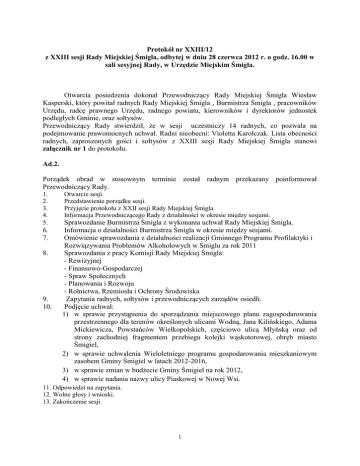 Protokół nr XXIII/12 z XXIII sesji Rady Miejskiej Śmigla, odbytej w dniu 28 czerwca 2012 r. o godz. 16.00 w sali sesyjnej Rady, w Urzędzie Miejskim Śmigla. Otwarcia posiedzenia dokonał Przewodniczący Rady Miejskiej Śmigla Wiesław Kasperski, który powitał radnych Rady Miejskiej Śmigla , Burmistrza Śmigla , pracowników Urzędu, radcę prawnego Urzędu, radnego powiatu, kierowników i dyrektorów jednostek podległych Gminie, oraz sołtysów. Przewodniczący Rady stwierdził, że w sesji uczestniczy 14 radnych, co pozwala na podejmowanie prawomocnych uchwał. Radni nieobecni: Violetta Karolczak. Lista obecności radnych, zaproszonych gości i sołtysów z XXIII sesji Rady Miejskiej Śmigla stanowi załącznik nr 1 do protokołu. Ad.2. Porządek obrad w stosownym terminie został radnym przekazany poinformował Przewodniczący Rady. 1. 2. 3. 4. 5. 6. 7. 8. 9. 10. Otwarcie sesji. Przedstawienie porządku sesji. Przyjęcie protokołu z XXII sesji Rady Miejskiej Śmigla. Informacja Przewodniczącego Rady z działalności w okresie między sesjami. Sprawozdanie Burmistrza Śmigla z wykonania uchwał Rady Miejskiej Śmigla. Informacja o działalności Burmistrza Śmigla w okresie między sesjami. Omówienie sprawozdania z działalności realizacji Gminnego Programu Profilaktyki i Rozwiązywania Problemów Alkoholowych w Śmiglu za rok 2011 Sprawozdania z pracy Komisji Rady Miejskiej Śmigla: - Rewizyjnej - Finansowo-Gospodarczej - Spraw Społecznych - Planowania i Rozwoju - Rolnictwa, Rzemiosła i Ochrony Środowiska Zapytania radnych, sołtysów i przewodniczących zarządów osiedli. Podjęcie uchwał: 1) w sprawie przystąpienia do sporządzania miejscowego planu zagospodarowania przestrzennego dla terenów określonych ulicami Wodną, Jana Kilińskiego, Adama Mickiewicza, Powstańców Wielkopolskich, częściowo ulicą Młyńską oraz od strony zachodniej fragmentem przebiegu kolejki wąskotorowej, obręb miasto Śmigiel, 2) w sprawie uchwalenia Wieloletniego programu gospodarowania mieszkaniowym zasobem Gminy Śmigiel w latach 2012-2016, 3) w sprawie zmian w budżecie Gminy Śmigiel na rok 2012, 4) w sprawie nadania nazwy ulicy Piaskowej w Nowej Wsi. 11. Odpowiedzi na zapytania. 12. Wolne głosy i wnioski. 13. Zakończenie sesji. 1 Burmistrz Śmigla Wiktor Snela zgłosił wniosek o usunięcie z porządku obrad projektu uchwały znajdującej się w pkt.10 ppkt.2 w sprawie uchwalenia Wieloletniego programu gospodarowania mieszkaniowym zasobem Gminy Śmigiel w latach 2012-2016 popierając swój wniosek wymogami prawnymi, przez co uchwała musi być dopracowana. Wobec tego Przewodniczący Rady poddał ją pod głosowanie. W głosowaniu udział wzięło 14 radnych, którzy głosowali następująco: - „za” wycofaniem uchwały z porządku obrad –14 radnych, - „przeciw” – 0, - „wstrzymało się” – 0. Uchwałę wycofano jednogłośnie. Burmistrz Śmigla złożył wniosek o wprowadzenie do porządku w pkt 10 ppkt 2 obrad projektu uchwały w sprawie udzielenia dotacji na prace konserwatorskie, restauratorskie i roboty budowlane dla obiektów zabytkowych wpisanych do rejestru zabytków niestanowiących własności Gminy Śmigiel. Pytań radni nie mieli wobec tego Przewodniczący Rady poddał ją pod głosowanie. W głosowaniu udział wzięło 14 radnych, którzy głosowali następująco: - „za” wprowadzeniem uchwały do porządku obrad –14 radnych, - „przeciw” – 0, - „wstrzymało się” – 0. Uchwałę wprowadzono jednogłośnie. Ad.3. Przewodniczący Rady poddał pod głosowanie protokół z XXII sesji Rady Miejskiej Śmigla. Poinformował, że wiernie odzwierciedla przebieg obrad. Uwag do protokołu nie wniesiono. „Za” przyjęciem protokołu z XXII sesji głosowało 14 radnych. Protokół przyjęto jednogłośnie. Ad.4. Przewodniczący Rady Wiesław Kasperski przedstawił informację ze swej działalności w okresie między sesjami. Informacja stanowi załącznik nr 2 do protokołu. Pytań do przedstawionej informacji nie było. Ad.5. Sprawozdanie Burmistrza Śmigla z wykonania uchwał Rady Miejskiej Śmigla stanowi załącznik nr 3 do protokołu. Pytań nie było. Ad.6. Informacja Burmistrza Śmigla z działalności w okresie między sesjami stanowi załącznik nr 4 do protokołu. Radny Alfred Splisteser poprosił o przybliżenie pkt.2. Burmistrz Śmigla wyjaśnił, że spotkanie dotyczyło możliwości wspólnego zamówienia na dostawę energii elektrycznej. Podczas spotkania omówiono czas na jaki każda gmina posiada umowę na dostawę energii, niestety w każdej gminie okres umowy jest inny wobec powyższego niemożliwe jest przeprowadzenie wspólnego zamówienia na dostawę energii elektrycznej. 2 Ad.7. Omówienie sprawozdania z działalności realizacji Gminnego Programu Profilaktyki i Rozwiązywania Problemów Alkoholowych w Śmiglu za rok 2011 dokonała Pani Genowefa Łączna – pełnomocnik ds. uzależnień. Sprawozdanie stanowi załącznik nr 5 Ad.8. Sprawozdania z pracy Komisji Rady Miejskiej Śmigla dokonali poszczególni przewodniczący komisji sprawozdania stanowią: - załącznik nr 6 – Komisji Rewizyjnej - załącznik nr 7 – Finansowo-Gospodarczej - załącznik nr 8 – Spraw Społecznych - załącznik nr 9 – Planowania i Rozwoju - załącznik nr 10 – Rolnictwa, Rzemiosła i Ochrony Środowiska Ad.9. Zapytania radnych, sołtysów i przewodniczących zarządów osiedli – nie było. Ad.10. Podjęcie uchwał. 1) w sprawie przystąpienia do sporządzania miejscowego planu zagospodarowania przestrzennego dla terenów określonych ulicami Wodną, Jana Kilińskiego, Adama Mickiewicza, Powstańców Wielkopolskich, częściowo ulicą Młyńską oraz od strony zachodniej fragmentem przebiegu kolejki wąskotorowej, obręb miasto Śmigiel. Projekt uchwały przedstawił Burmistrz Śmigla przedstawiając jaka funkcje pełni w tej chwili ten teren. Jest to tzw. rynna przewietrzeń miasta Śmigla i nie chcemy zabudowywać tych terenów ma