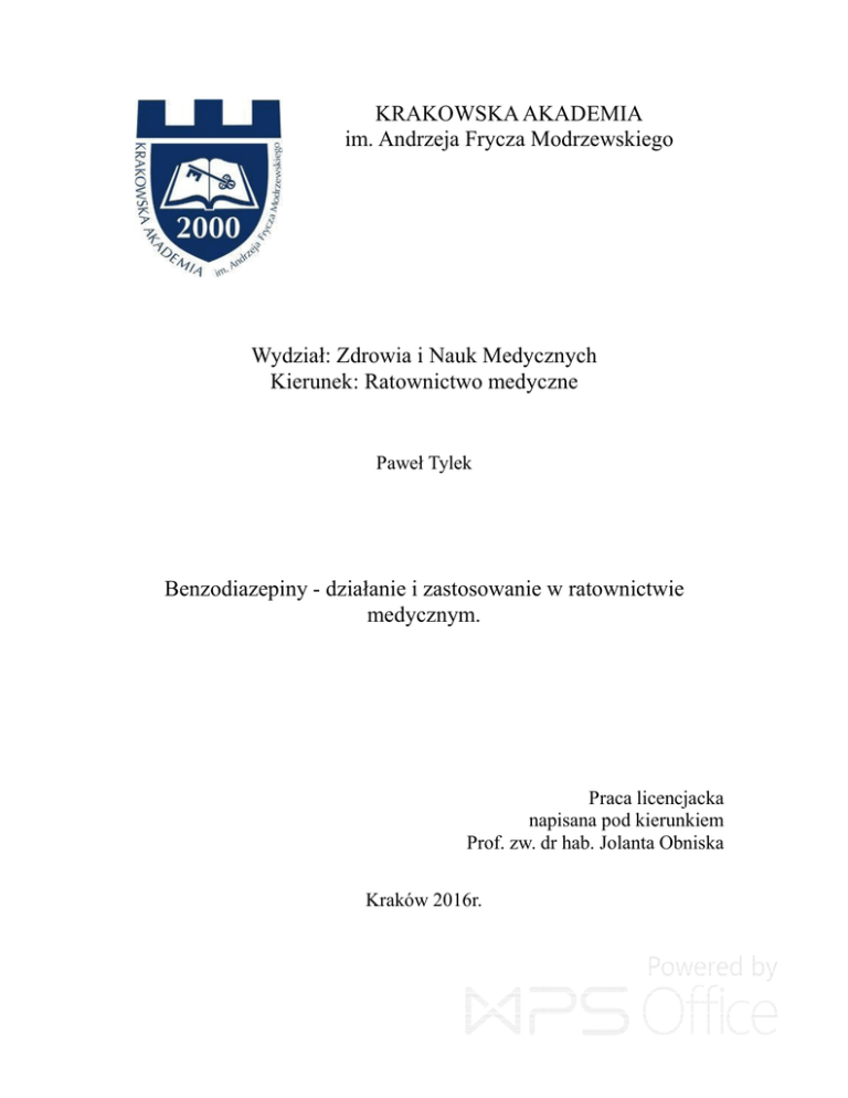 KRAKOWSKA AKADEMIA im. Andrzeja Frycza Modrzewskiego Wydział: Zdrowia i Nauk Medycznych Kierunek: Ratownictwo medyczne Paweł Tylek Benzodiazepiny - działanie i zastosowanie w ratownictwie medycznym. Praca licencjacka napisana pod kierunkiem Prof. zw. dr hab. Jolanta Obniska Kraków 2016r. Spis treści. I. Wprowadzenie..............................................................................................3 II. Mechanizm działania benzodiazepin..........................................................3 III. Metabolizm i czas działania leków............................................................4 IV. Działania niepożądane benzodiazepin.......................................................5 V. Benzodiazepiny stosowane w ratownictwie medycznym...........................6 VI. Podsumowanie........................................................................................13 VII. Streszczenie...........................................................................................14 VIII. Bibliografia...........................................................................................15 2 I. Wprowadzenie Benzodiazepiny to bardzo duża grupa leków mimo iż ich historia sięga zaledwie lat 60 XX w. Są one również jedną z najczęściej przepisywanych grup preparatów. Ich głównym działaniem jest działanie uspokajające, nasenne, przeciwlękowe i przeciwpadaczkowe. [1] W ratownictwie zaś znajdują one szerokie zastosowanie, powodem tego jest ich wpływ na różne obszary mózgu. Wpływają one na zachowanie pacjenta, zwiotczenie mięśni oraz działają przeciwdrgawkowo. Warto by ratownik medyczny znał pełne zastosowanie tych leków i ich specyfikę ponieważ ta wiedzą może się okazać bezcenna w praktycznym zawodzie. To właśnie na usystematyzowaniu tej wiedzy i przybliżeniu działania tych leków skupiać będzie się ten artykuł. W ratownictwie medycznym zastosowanie mają właściwie trzy z tej dużej grupy leków, są nimi diazepam, klonazepam i midazolam. Jako ciekawostkę wartym przytoczenia jest fakt, że większość substancji z tej grupy pochodzi od powszechnie stosowanego w ratownictwie diazepamu lub jego metabolitów [2]. II. Mechanizm działania benzodiazepin Mechanizm działania leków z grupy benzodiazepin (BZD) polega na ich wpływie na nerwowe przekaźnictwo gabaergiczne. Wiadomo jest, że w obrębie receptora GABAA znajduje się specyficzne miejsce wiązań określane jako receptor benzodiazepinowy do którego jako jego agoniści przyłączają się benzodiazepiny. W wyniku tej interakcji zwiększa się siła wiązania kwasu γ-aminomasłowego (GABA) z jego receptorem jak również nasila się działanie hamujące tego kwasu, w efekcie czego dochodzi do obniżenia pobudliwości nerwowej. Co skutkuje hamującym wpływem na ośrodkowy układ nerwowy. Zależnie od tego w którym to fragmencie ośrodkowego układu nerwowego (OUN) zachodzi ten proces możemy zaobserwować interesujące w ratownictwie efekty. Jeżeli występuje w płacie skroniowym działa przeciwlękowo i przeciwdrgawkowo, w móżdżku i rdzeniu kręgowym miorelaksacyjnie, a w tworze siatkowatym pnia mózgu nasennie. Jak wynika z przedstawionego mechanizmu działania benzodiazepiny powodują takie przemiany w organizmie w wyniku których uzyskujemy planowany efekt terapeutyczny. Istotnym jest również fakt, że benzodiazepiny wywołują efekt terapeutyczny bardzo szybko po podaniu. [4] 3 III. Metabolizm i czas działania leków Metabolizm można podzielić na dwie fazy w wyniku których dochodzi do istotnych przemian. Obie te fazy zachodzą w wątrobie. W fazie pierwszej gdzie pod wpływem izoenzymu cytochromu P450 dochodzi do reakcji utleniania benzodiazepin. W wyniku czego pwostają liczne aktywne metabolity. W fazie drugiej te aktywne metabolity ulegają reakcji z kwasem glukuronowym tworząc nieaktywne pochodne, które następnie są wydalane z żółcią i moczem. Niemniej jednak niektóre aktywne metabolity mogą zostać ponownie wchłonięte w wyniku czego znacznie wydłuża się ich czas połowicznego półtrwania. Często powstające z nich metabolity zachowują działanie oryginału (metabolity są dalej aktywne). Zasadniczo możemy podzielić ze względu na czas ich działania na długo działające, krótko działające i o pośrednim czasie działania. Czas działania jest dla nas ważny i będzie determinować zastosowanie leku. Benzodiazepiny możemy podzielić ze względu na ich czas działania na długo działające (od kilku do kilkunastu dni), benzodiazepiny o pośrednim czasie działania (od kilku godzin do kilku dni) oraz krótko działające( poniżej kilku godzin). Benzodiazepiny długo działające do których należy flurazepam, kwazepam i ważny w ratownictwie diazepam (Relanium). To leki które mogą działać nawet do kilku dni. Leki te można skutecznie podawać w leczeniu nadmiernej spastyczności mięśni, napadów padaczkowych czy też jako leki uspokajające. Skutecznie stosowane są (szczególnie diazepam) w detoksykacji pacjentów uzależnionych. Należy jednak pamiętać, że nie należy podawać żadnych pochodnych benzodiazepin gdyż wykazują one silny synergizm z alkoholem co w efekcie może doprowadzić nawet do zgonu. Długo działające benzodiazepiny nie powinny być stosowane jako leki nasenne gdyż mogą powodować senność w ciągu dnia i zabuburzać prawidłowe funkcjonowanie. 4 Benzodiazepiny krótko działające (do kilku godzin) do których należą oksazepam, triazolam i ważny w ratownictwie midazolam. Cechą charakterystyczną tej grupy leków jest wywoływany prze nie efekt niepamięci następczej, w którym pacjent nie pamięta co się stało po podaniu leku ale jest w stanie współpracować z ratownikiem. Ponad to ta grpa leków znalazła zastosowanie jako preanestetyki przed krótkimi zabiegami. Ma ona również znaczenie jako leki nasenne u osób przejawiających trudności w zasypianiu. Należy podkreślić,