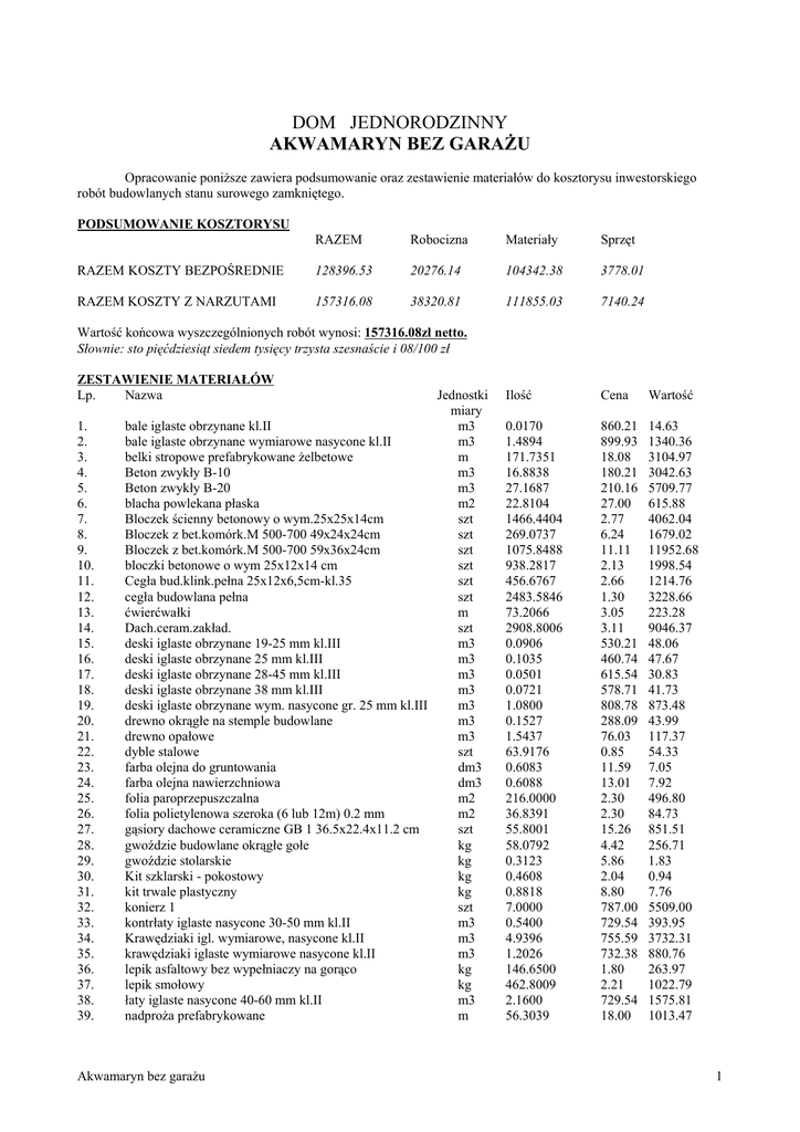 DOM JEDNORODZINNY AKWAMARYN BEZ GARAŻU Opracowanie poniższe zawiera podsumowanie oraz zestawienie materiałów do kosztorysu inwestorskiego robót budowlanych stanu surowego zamkniętego. PODSUMOWANIE KOSZTORYSU RAZEM Robocizna Materiały Sprzęt RAZEM KOSZTY BEZPOŚREDNIE 128396.53 20276.14 104342.38 3778.01 RAZEM KOSZTY Z NARZUTAMI 157316.08 38320.81 111855.03 7140.24 ZESTAWIENIE MATERIAŁÓW Lp. Nazwa Ilość Cena Wartość 1. 2. 3. 4. 5. 6. 7. 8. 9. 10. 11. 12. 13. 14. 15. 16. 17. 18. 19. 20. 21. 22. 23. 24. 25. 26. 27. 28. 29. 30. 31. 32. 33. 34. 35. 36. 37. 38. 39. 0.0170 1.4894 171.7351 16.8838 27.1687 22.8104 1466.4404 269.0737 1075.8488 938.2817 456.6767 2483.5846 73.2066 2908.8006 0.0906 0.1035 0.0501 0.0721 1.0800 0.1527 1.5437 63.9176 0.6083 0.6088 216.0000 36.8391 55.8001 58.0792 0.3123 0.4608 0.8818 7.0000 0.5400 4.9396 1.2026 146.6500 462.8009 2.1600 56.3039 860.21 899.93 18.08 180.21 210.16 27.00 2.77 6.24 11.11 2.13 2.66 1.30 3.05 3.11 530.21 460.74 615.54 578.71 808.78 288.09 76.03 0.85 11.59 13.01 2.30 2.30 15.26 4.42 5.86 2.04 8.80 787.00 729.54 755.59 732.38 1.80 2.21 729.54 18.00 14.63 1340.36 3104.97 3042.63 5709.77 615.88 4062.04 1679.02 11952.68 1998.54 1214.76 3228.66 223.28 9046.37 48.06 47.67 30.83 41.73 873.48 43.99 117.37 54.33 7.05 7.92 496.80 84.73 851.51 256.71 1.83 0.94 7.76 5509.00 393.95 3732.31 880.76 263.97 1022.79 1575.81 1013.47 Wartość końcowa wyszczególnionych robót wynosi: 157316.08zł netto. Słownie: sto pięćdziesiąt siedem tysięcy trzysta szesnaście i 08/100 zł Jednostki miary bale iglaste obrzynane kl.II m3 bale iglaste obrzynane wymiarowe nasycone kl.II m3 belki stropowe prefabrykowane żelbetowe m Beton zwykły B-10 m3 Beton zwykły B-20 m3 blacha powlekana płaska m2 Bloczek ścienny betonowy o wym.25x25x14cm szt Bloczek z bet.komórk.M 500-700 49x24x24cm szt Bloczek z bet.komórk.M 500-700 59x36x24cm szt bloczki betonowe o wym 25x12x14 cm szt Cegła bud.klink.pełna 25x12x6,5cm-kl.35 szt cegła budowlana pełna szt ćwierćwałki m Dach.ceram.zakład. szt deski iglaste obrzynane 19-25 mm kl.III m3 deski iglaste obrzynane 25 mm kl.III m3 deski iglaste obrzynane 28-45 mm kl.III m3 deski iglaste obrzynane 38 mm kl.III m3 deski iglaste obrzynane wym. nasycone gr. 25 mm kl.III m3 drewno okrągłe na stemple budowlane m3 drewno opałowe m3 dyble stalowe szt farba olejna do gruntowania dm3 farba olejna nawierzchniowa dm3 folia paroprzepuszczalna m2 folia polietylenowa szeroka (6 lub 12m) 0.2 mm m2 gąsiory dachowe ceramiczne GB 1 36.5x22.4x11.2 cm szt gwoździe budowlane okrągłe gołe kg gwoździe stolarskie kg Kit szklarski - pokostowy kg kit trwale plastyczny kg konierz 1 szt kontrłaty iglaste nasycone 30-50 mm kl.II m3 Krawędziaki igl. wymiarowe, nasycone kl.II m3 krawędziaki iglaste wymiarowe nasycone kl.II m3 lepik asfaltowy bez wypełniaczy na gorąco kg lepik smołowy kg łaty iglaste nasycone 40-60 mm kl.II m3 nadproża prefabrykowane m Akwamaryn bez garażu 1 40. 41. 42. 43. 44. 45. 46. 47. 48. 49. 50. 51. 52. 53. 54. 55. 56. 57. 58. 59. 60. 61. 62. 63. 64. 65. 66. 67. 68. 69. 70. okna i drzwi balkonowe zespolone wykończone okna typu "FAKRO"0,78*1,40 ościeżnice drewniane Papa asfaltowa na tekturze izolacyjna pasta emulsyjna asfaltowa do izolacji przeciwwilgociowej pianka poliuretanowa Piasek do zapraw płytki z betonu komórkowego 49x24x12 cm płyty styropianowe Pręty okr.gład.do zbr.bet. fi do 7mm pręty żebrowane 8-14 mm Pustak stropowy "TERIVA-I" wys.21,0cm roztwór asfaltowy do gruntowania rury spustowe 110 mm rury stalowe śr. 48.3x3.6 mm rynny dachowe 150 mm skrzydła drzwiowe drewniane zewnętrzne Szkło płask. walcow. wzorz. gr.7mm, gat.I szpachlówka celulozowa Śruby stalowe zgrubne z nakrętkami i podkładkami uchwyty do rur spustowych uchwyty rynnowe uszczelki gumowe wkręty samogwintujące typu SW do blach wsporniki stalowe do ław kominiarskich xylamit popularny zaprawa zaprawa cementowa M 80 zaprawa cementowo wapienna M 15 zaprawa wapienna M 4 materiały pomocnicze m2 kpl szt m2 kg kg m3 szt m2 kg kg szt kg m m m m2 m2 dm3 kg kpl kpl kpl szt kg kg m3 m3 m3 m3 zł 20.0550 7.0000 1.0500 151.4837 107.4497 0.8234 37.5129 886.0691 44.0180 196.3877 1201.5616 532.6969 71.9141 17.3718 5.5338 29.8067 2.1000 0.4412 0.9028 65.3700 9.6333 57.3196 16.6250 510.0000 6.3009 3.2777 12.2949 0.0371 0.3292 0.6066 600.00 12033.00 1056.00 7392.00 160.50 168.53 1.84 278.73 1.69 181.59 21.97 18.09 29.79 1117.51 3.62 3207.57 31.62 1391.85 2.76 542.03 2.76 3316.31 3.86 2056.21 3.61 259.61 14.04 243.90 8.00 44.27 14.02 417.89 750.00 1575.00 22.19 9.79 8.33 7.52 12.00 784.44 3.60 34.68 4.60 263.67 1.20 19.95 0.40 204.00 5.35 33.71 4.61 15.11 163.42 2009.24 161.96 6.01 127.60 42.01 121.29 73.57 1996.23 ZAŁOŻENIA PRZYJĘTE DO KOSZTORYSU: 1.Kosztorys sporządzono na podstawie KNRów. 2.W kosztorysie uwzględniono wskaźniki cenotwórcze oraz ceny średnie materiałów i sprzętu za II kw2007. 3.Powyższe zestawienie materiałów zawiera ilości materiałów przyjęte wg KNRów, nakłady zużycia materiałów należy zweryfikować z wytycznymi producenta. Szczegółowe nakłady zużycia materiałów w pozycjach podane są w kosztorysie. 4.Nakład zużycia dachówki ceramicznej zakładkowej w pozycji pokrycie dachu należy zweryfikować po wybraniu producenta dachówki, w kosztorysie przyjęto wg KNRów zużycie: 16,16szt./m2; ilość gąsiorów przeliczono przyjmując zużycie 3szt/mb kalenicy. Ze względu na dodatkowe elementy /gąsiory narożne, wywietrzniki, dachówki skrajne itp./ zwiększono normę na materiały pomocnicze, przyjęto 8%. W kosztorysie nie ujęto stopni i ław kominiarskich, system przyjąć po dobraniu rodzaju dachówki. 5.Kosztorys nie zawiera robót związanych z wykończeniem połaci dachowych typu: deski okapowe, podbitki, łączniki oraz wkładów i czap kominowych. 6. W materiałach pomocniczych ujęto między innymi: łączniki, blachy do mocowania belek drewnianych, kotwy do murłat, itp. Akwamar