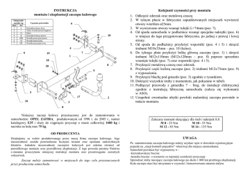 INSTRUKCJA montaŜu i eksploatacji zaczepu kulowego Oznaczenie zacisku wg ISO PN 1 L 2 + 3 31 4 R 5 58R 6 54 7 58L Łączenie przewodów Kolejność czynności przy montaŜu 6 Kierunkowskazy lewe Tylne światła przeciwmgłowe Masa Kierunkowskazy prawe Światła pozycyjne prawe Światła hamowania Światła pozycyjne lewe 10 4 6 7 19 1 18 8 20 9 5 17 10 2 3 1. Odkręcić zderzak oraz metalową czaszę. 2. W tylnym płacie w fabrycznie zapunktowanych miejscach wywiercić otwory wiertłem ø25mm. 3. W wywiercone otwory wsunąć tulejki L=74mm (poz. 7). 4. Od spodu samochodu w podłuŜnice wsunąć specjalne nakrętki (poz. 6) w miejsce do tego przygotowane fabrycznie, po jednej z prawej i lewej strony. 5. Od spodu do podłuŜnicy przyłoŜyć wsporniki (poz. 4 i 5) i skręcić śrubami M10x35mm – poz. 10 (luźno). 6. Do tylnego płata przyłoŜyć belkę główną zaczepu (poz. 1) i skręcić śrubami M12x110mm (M12x120mm – poz. 8) poprzez uprzednio wsunięte tulejki (poz. 7) oraz wsporniki (poz. 4 i 5). 7. Przykręcić metalową czaszę oraz zderzak. 8. Przykręcić część kulistą zaczepu (poz. 2) śrubami M12x75mm (poz. 9) z wyposaŜenia. 9. Przykręcić blachę pod gniazdo (poz. 3) zgodnie z rysunkiem. 10. Dokręcić wszystkie śruby z momentem, jak pokazano w tabeli. 11. Podłączyć przewody z gniazdka 7 – bieg. do instalacji elektrycznej zgodnie z instrukcją fabryczną samochodu (zaleca się wykonanie w ASO). 12. Uzupełnić ewentualne ubytki powłoki malarskiej zaczepu powstałe w trakcie montaŜu. 8 Niniejszy zaczep kulowy przeznaczony jest do zamontowania w samochodzie: OPEL ZAFIRA, produkowanym od 1998 r. do 2005 r., numer katalogowy E35 i słuŜy do ciągnięcia przyczep o masie całkowitej 1600 kg i nacisku na kulę max 75 kg. Zalecany moment skręcający dla śrub i nakrętek 8,8: M 8 - 25 Nm M 10 - 55 Nm M 12 - 85 Nm M 14 - 135 Nm OD PRODUCENTA Dziękujemy za wybór produkowanego przez naszą firmę zaczepu kulowego. Jego niezawodność została potwierdzona licznymi testami oraz opiniami zadowolonych klientów. JednakŜe niezawodność zaczepów kulowych jest zaleŜna równieŜ od prawidłowego montaŜu oraz prawidłowej eksploatacji. Z tego powodu prosimy Państwa o staranne przeczytanie niniejszej instrukcji montaŜu oraz przestrzeganie zawartych wskazówek. Zaczep naleŜy zamontować w miejscach do tego celu przeznaczonych przez producenta samochodu. UWAGA Po zamontowaniu zaczepu kulowego naleŜy uzyskać wpis w dowodzie rejestracyjnym pojazdu na „stacji kontroli pojazdów” właściwej dla miejsca zamieszkania. Samochód powinien być wyposaŜony w : -kierunkowskazy boczne -lusterka boczne o rozstawie co najmniej szerokości przyczepy Sprawdzać śruby mocujące zaczepu kulowego po około 1 000 km przebiegu eksploatacji. Kula zaczepu musi być utrzymana w czystości i konserwowana smarem stałym. PPUH AUTO-HAK S.J. WyposaŜenie zaczepu: Produkcja Haków Holowniczych Henryk & Zbigniew Nejman 76-200 SŁUPSK ul. Słoneczna 16K tel/fax (059) 8-414-414; 8-414-413 e-mail: [email protected] www. autohak.com.pl Zaczep kulowy bez wyposaŜenia elektrycznego Klasa: A50-X Nr kat. E35 Przeznaczony do zamontowania w samochodzie: Producent: OPEL Model: ZAFIRA produkowanym od 1998 r. do 2005 r. Dane techniczne: Wartość siły D : 8,9 kN maksymalna masa przyczepy: 1600 kg maksymalny nacisk na kulę: 75 kg Numer homologacji zgodnie z wytycznymi regulaminu EKG/ONZ 55.01: E20-55R-01 0807 KARTA GWARANCYJNA Producent udziela gwarancji niniejszą kartą gwarancyjną na okres 24 miesięcy licząc od dnia zakupu zaczepu kulowego do samochodu: INFORMACJA WSTĘPNA OPEL ZAFIRA produkowanego od 1998 r. do 2005 r. Data produkcji .............................. Data zakupu............................................. Zakres gwarancji obejmuje wyłącznie wady jakościowe wynikające z winy producenta. Gwarancja nie obejmuje natomiast uszkodzeń zawinionych przez nabywcę, wynikających z niewłaściwego montaŜu, uŜytkowania lub konserwacji, uszkodzeń mechanicznych, normalnego zuŜycia podczas eksploatacji itp. Gwarancja udzielona na zakupiony towar nie wyłącza, nie ogranicza ani nie zawiesza uprawnień kupującego wynikających z niezgodności towaru z umową. Reklamacje naleŜy zgłaszać w punkcie sprzedaŜy, składając jednocześnie kartę gwarancyjną. Usunięcie "wady" następuje po stwierdzeniu przez punkt sprzedaŜy wspólnie z producentem słuszności złoŜonej reklamacji. Reklamacja powinna być załatwiona w ciągu 14 dni od dnia uznania reklamacji. Karta gwarancyjna jest niewaŜna jeŜeli nie jest wypełniona i podpisana. Data zgłoszenia reklamacji: ................................................................... Zaczep kulowy jest skonstruowany zgodnie z zasadami bezpieczeństwa ruchu drogowego. Zaczep kulowy jest elementem wpływającym na bezpieczeństwo jazdy i moŜe zostać zainstalowany wyłącznie przez personel wyspecjalizowany. Niedopuszczalne jest dokonywanie jakichkolwiek zmian w konstrukcji zaczepu. Powoduje to wygaśniecie dopuszczenia do stosowania. W przypadku obecności masy izolacyjnej lub osłony podwozia w miejscu przylegania zaczepu, naleŜy ją usunąć. Nieosłonięte miejsca karoserii oraz wywiercone otwory naleŜy pomalować farbą antykorozyjną. Informacjami wiąŜącymi odnośnie wartości obciąŜeń są dane podawane przez producenta samochodu, względnie wartości maksymalnej masy przyczepy oraz maksymalnego nacisku na kulę, przy czym wartości parametrów zaczepu kulowego nie mogą być przekroczone. Wzór do obliczania wartości siły D: Maks. masa przyczepy [kg] x Maks. masa samochodu [kg] Maks. masa przyczepy [kg] + Maks. masa samochodu [kg] X 9,81 = 1000 D [kN]