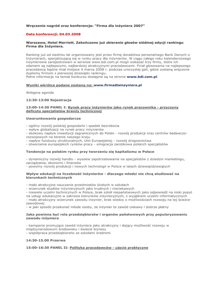 Wręczenie nagród oraz konferencja: "Firma dla inżyniera 2007" Data konferencji: 04.03.2008 Warszawa, Hotel Marriott. Zakończono już zbieranie głosów siódmej edycji rankingu Firma dla Inżyniera. Ranking już od siedmiu lat organizowany jest przez firmę doradztwa personalnego Bank Danych o Inżynierach, specjalizującą się w rynku pracy dla inżynierów. W ciągu całego roku kalendarzowego inżynierowie zarejestrowani w serwisie www.bdi.com.pl mogli wskazać trzy firmy, które ich zdaniem są najlepszymi, najbardziej atrakcyjnymi pracodawcami. Finał głosowania na najlepszego pracodawcę będzie miał miejsce 4 marca 2008 r. podczas uroczystej gali, gdzie zostaną wręczone dyplomy firmom z pierwszej dziesiątki rankingu. Pełne informacje na temat konkursu dostępne są na stronie www.bdi.com.pl. Wyniki wkrótce podane zostaną na: www.firmadlainzyniera.pl Wstępna agenda 12:30-13:00 Rejestracja 13:00-14:30 PANEL I: Rynek pracy inżynierów jako rynek pracownika - przyczyny deficytu specjalistów branży technicznej Uwarunkowania gospodarcze - ogólny rozwój polskiej gospodarki i spadek bezrobocia - wpływ globalizacji na rynek pracy inżynierów - skokowy napływ inwestycji zagranicznych do Polski - rozwój produkcji oraz centrów badawczorozwojowych na terenie naszego kraju - napływ funduszy strukturalnych, Unii Europejskiej - rozwój drogownictwa - otworzenie europejskich rynków pracy - emigracja zarobkowa polskich specjalistów Tendencje na polskim rynku przy tworzeniu się kapitalizmu w Polsce - dynamiczny rozwój handlu - wysokie zapotrzebowanie na specjalistów z dziedzin marketingu, zarządzania, ekonomii i finansów - powolny rozwój produkcji i nowych technologii w Polsce w latach dziewięćdziesiątych Wpływ edukacji na liczebność inżynierów - dlaczego młodzi nie chcą studiować na kierunkach technicznych - mało atrakcyjne nauczanie przedmiotów ścisłych w szkołach - wizerunek studiów inżynieryjnych jako trudnych i nieciekawych - niewiele uczelni technicznych w Polsce, brak szkół niepaństwowych jako odpowiedź na niski popyt na usługi edukacyjne w zakresie kierunków inżynieryjnych, z wyjątkiem uczelni informatycznych - mało atrakcyjny wizerunek zawodu inżynier, brak wiedzy o możliwościach rozwoju na tej ścieżce zawodowej - w jaki sposób przekonać młode osoby, że inżynier to zawód ciekawy i dobrze płatny Jaka powinna być rola przedsiębiorstw i organów państwowych przy popularyzowaniu zawodu inżyniera - kampanie promujące zawód inżyniera jako atrakcyjny i dający możliwość rozwoju w międzynarodowym środowisku i świecie biznesu - współpraca przedsiębiorstw ze szkołami średnimi 14:30-15.00 Przerwa 15:00-16:30 PANEL II: Polityka pracodawców - ujęcie praktyczne Pozyskiwanie inżynierów na rynku pracy - jak skutecznie kształtować wizerunek zewnętrzny firmy jako dobrego pracodawcy? - kanały komunikacji firmy z kandydatami - jakie są skuteczne formy dotarcia do inżynierów - komunikacja w rekrutacji - w jaki sposób rozmawiać z kandydatami, aby zachęcić ich do przyjęcia oferty pracy - metody budowania wizerunku pracodawcy - jak zatrzymać dobrych pracowników w organizacji Analiza rynku pracy inżynierów pod kątem wynagrodzeń ze względu na: - lokalizację branżę znajomość języków poziom stanowiska w organizacji Omówienie wyników rankingu - metodologia badań: ujęcie ilościowe i jakościowe - jak głosowali inżynierowie - rozkład cech ze względu na: wiek, poziom stanowiska w organizacji, płeć, lokalizację/województwo, znajomość języków 16:30-17:00 Przerwa 17:00 GALA - Uroczyste rozdanie nagród podsumowujących konkurs "Firma dla Inżyniera 2007" - Bankiet Organizatorzy: Patroni medialni: Kontakt: Magdalena Jóźwik Tel .022 572 78 00 [email protected]