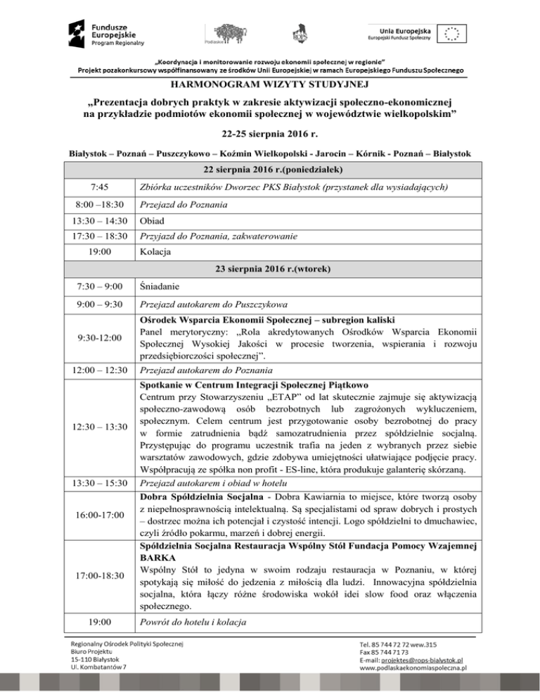 HARMONOGRAM WIZYTY STUDYJNEJ „Prezentacja dobrych praktyk w zakresie aktywizacji społeczno-ekonomicznej na przykładzie podmiotów ekonomii społecznej w województwie wielkopolskim” 22-25 sierpnia 2016 r. Białystok – Poznań – Puszczykowo – Koźmin Wielkopolski - Jarocin – Kórnik - Poznań – Białystok 22 sierpnia 2016 r.(poniedziałek) 7:45 8:00 –18:30 Zbiórka uczestników Dworzec PKS Białystok (przystanek dla wysiadających) Przejazd do Poznania 13:30 – 14:30 Obiad 17:30 – 18:30 Przyjazd do Poznania, zakwaterowanie 19:00 Kolacja 23 sierpnia 2016 r.(wtorek) 7:30 – 9:00 Śniadanie 9:00 – 9:30 Przejazd autokarem do Puszczykowa 9:30-12:00 Ośrodek Wsparcia Ekonomii Społecznej – subregion kaliski Panel merytoryczny: „Rola akredytowanych Ośrodków Wsparcia Ekonomii Społecznej Wysokiej Jakości w procesie tworzenia, wspierania i rozwoju przedsiębiorczości społecznej”. 12:00 – 12:30 12:30 – 13:30 13:30 – 15:30 16:00-17:00 17:00-18:30 19:00 Przejazd autokarem do Poznania Spotkanie w Centrum Integracji Społecznej Piątkowo Centrum przy Stowarzyszeniu „ETAP” od lat skutecznie zajmuje się aktywizacją społeczno-zawodową osób bezrobotnych lub zagrożonych wykluczeniem, społecznym. Celem centrum jest przygotowanie osoby bezrobotnej do pracy w formie zatrudnienia bądź samozatrudnienia przez spółdzielnie socjalną. Przystępując do programu uczestnik trafia na jeden z wybranych przez siebie warsztatów zawodowych, gdzie zdobywa umiejętności ułatwiające podjęcie pracy. Współpracują ze spółka non profit - ES-line, która produkuje galanterię skórzaną. Przejazd autokarem i obiad w hotelu Dobra Spółdzielnia Socjalna - Dobra Kawiarnia to miejsce, które tworzą osoby z niepełnosprawnością intelektualną. Są specjalistami od spraw dobrych i prostych – dostrzec można ich potencjał i czystość intencji. Logo spółdzielni to dmuchawiec, czyli źródło pokarmu, marzeń i dobrej energii. Spółdzielnia Socjalna Restauracja Wspólny Stół Fundacja Pomocy Wzajemnej BARKA Wspólny Stół to jedyna w swoim rodzaju restauracja w Poznaniu, w której spotykają się miłość do jedzenia z miłością dla ludzi. Innowacyjna spółdzielnia socjalna, która łączy różne środowiska wokół idei slow food oraz włączenia społecznego. Powrót do hotelu i kolacja 24 sierpnia 2016 r.(środa) 7:30 – 9:00 Śniadanie 9:00 – 10:30 Przejazd autokarem do Koźmina Wielkopolskiego 10:30 – 11:00 11:00 – 11:30 11:30 – 11:30 11:30-13:00 13:00 – 14:00 14:00-15:00 Zakład Aktywności Zawodowej w Koźminie Wielkopolskim funkcjonuje od 2007 r., zatrudnia pracowników ze znacznym i umiarkowanym stopniem niepełnosprawności, zapewnia miejsca pracy przystosowane do niepełnosprawności i indywidualnych możliwości pracownika oraz stwarza warunki do rehabilitacji zawodowej, społecznej i leczniczej. Celem głównym ZAZ jest aktywizacja zawodowa osób niepełnosprawnych i ich przystosowanie na wolny rynek pracy. Certyfikowany ZAZ - zakup prospołeczny Zapoznanie uczestników wizyty ze spółdzielnią socjalną osób prawnych VIVO. Spółdzielnia powstała w 2013 roku z inicjatywy Gminy Koźmin Wlkp. oraz powiatu Krotoszyńskiego, powstała w wyniku Partnerstwa na rzecz ekonomii społecznej w powiecie krotoszyńskim utworzonego w 2010 roku. Działalność gospodarcza: zakładanie i utrzymanie terenów zielonych, opieka nad osobami z niepełnosprawnościami i starszymi, usługi utrzymania czystości, drobne prace naprawcze. Przejazd autokarem do Jarocina Spółdzielnia Socjalna Zmysły. Zapoznanie uczestników wizyty ze spółdzielnią socjalną osób prawnych. Spółdzielnia powstała w czerwcu 2016 roku z inicjatywy Stowarzyszenia Jarocin XXI oraz Fundacji Akademia Zmysłów. Prowadzi kawiarnie filmową oraz świadczy usługi rehabilitacyjne. Przejazd autokarem do Kórnika Obiad 15:00 – 18:00 Zapoznanie uczestników wizyty z Spółką Non Profit. QQ!ryku w Kórniku – Ośrodek prowadzony przez przedsiębiorstwo społeczne zrodzone z marzenia o lokalnej przestrzeni wolnej od jakichkolwiek form wykluczenia. 18:00 – 19:00 Przejazd autokarem do hotelu 19:30 Kolacja 25 sierpnia 2016 r.(czwartek) 7:00 – 8:00 Śniadanie, wykwaterowanie z hotelu 8:00 – 12:30 Przejazd do Białegostoku 12:30 – 13:30 Obiad 13:30 Powrót do Białegostoku Dworzec PKS Białystok (przystanek dla wysiadających) – ok. 20:30 W trakcie wizyty harmonogram może ulec zmianie!!!