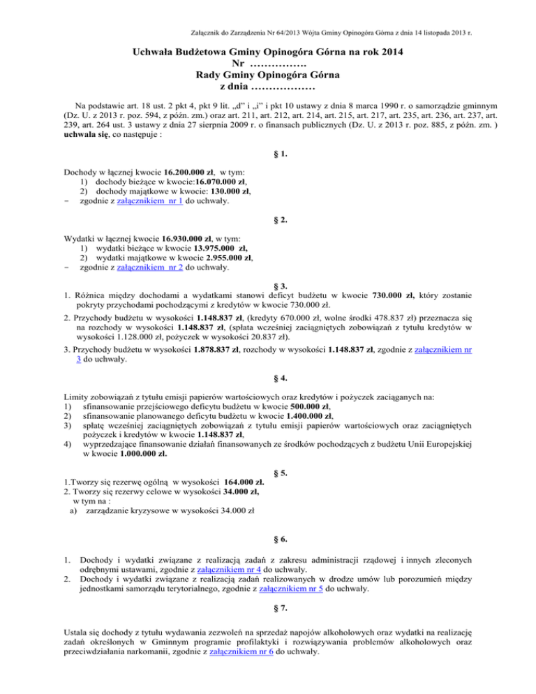 Załącznik do Zarządzenia Nr 64/2013 Wójta Gminy Opinogóra Górna z dnia 14 listopada 2013 r. Uchwała Budżetowa Gminy Opinogóra Górna na rok 2014 Nr ……………. Rady Gminy Opinogóra Górna z dnia ……………… Na podstawie art. 18 ust. 2 pkt 4, pkt 9 lit. „d” i „i” i pkt 10 ustawy z dnia 8 marca 1990 r. o samorządzie gminnym (Dz. U. z 2013 r. poz. 594, z późn. zm.) oraz art. 211, art. 212, art. 214, art. 215, art. 217, art. 235, art. 236, art. 237, art. 239, art. 264 ust. 3 ustawy z dnia 27 sierpnia 2009 r. o finansach publicznych (Dz. U. z 2013 r. poz. 885, z późn. zm. ) uchwala się, co następuje : § 1. Dochody w łącznej kwocie 16.200.000 zł, w tym: 1) dochody bieżące w kwocie:16.070.000 zł, 2) dochody majątkowe w kwocie: 130.000 zł, zgodnie z załącznikiem nr 1 do uchwały. § 2. Wydatki w łącznej kwocie 16.930.000 zł, w tym: 1) wydatki bieżące w kwocie 13.975.000 zł, 2) wydatki majątkowe w kwocie 2.955.000 zł, zgodnie z załącznikiem nr 2 do uchwały. § 3. 1. Różnica między dochodami a wydatkami stanowi deficyt budżetu w kwocie 730.000 zł, który zostanie pokryty przychodami pochodzącymi z kredytów w kwocie 730.000 zł. 2. Przychody budżetu w wysokości 1.148.837 zł, (kredyty 670.000 zł, wolne środki 478.837 zł) przeznacza się na rozchody w wysokości 1.148.837 zł, (spłata wcześniej zaciągniętych zobowiązań z tytułu kredytów w wysokości 1.128.000 zł, pożyczek w wysokości 20.837 zł). 3. Przychody budżetu w wysokości 1.878.837 zł, rozchody w wysokości 1.148.837 zł, zgodnie z załącznikiem nr 3 do uchwały. § 4. Limity zobowiązań z tytułu emisji papierów wartościowych oraz kredytów i pożyczek zaciąganych na: 1) sfinansowanie przejściowego deficytu budżetu w kwocie 500.000 zł, 2) sfinansowanie planowanego deficytu budżetu w kwocie 1.400.000 zł, 3) spłatę wcześniej zaciągniętych zobowiązań z tytułu emisji papierów wartościowych oraz zaciągniętych pożyczek i kredytów w kwocie 1.148.837 zł, 4) wyprzedzające finansowanie działań finansowanych ze środków pochodzących z budżetu Unii Europejskiej w kwocie 1.000.000 zł. § 5. 1.Tworzy się rezerwę ogólną w wysokości 164.000 zł. 2. Tworzy się rezerwy celowe w wysokości 34.000 zł, w tym na : a) zarządzanie kryzysowe w wysokości 34.000 zł § 6. 1. 2. Dochody i wydatki związane z realizacją zadań z zakresu administracji rządowej i innych zleconych odrębnymi ustawami, zgodnie z załącznikiem nr 4 do uchwały. Dochody i wydatki związane z realizacją zadań realizowanych w drodze umów lub porozumień między jednostkami samorządu terytorialnego, zgodnie z załącznikiem nr 5 do uchwały. § 7. Ustala się dochody z tytułu wydawania zezwoleń na sprzedaż napojów alkoholowych oraz wydatki na realizację zadań określonych w Gminnym programie profilaktyki i rozwiązywania problemów alkoholowych oraz przeciwdziałania narkomanii, zgodnie z załącznikiem nr 6 do uchwały. Załącznik do Zarządzenia Nr 64/2013 Wójta Gminy Opinogóra Górna z dnia 14 listopada 2013 r. § 8. Dotacje podmiotowe dla : a) Gminnego Ośrodka Kultury b) Gminnej Biblioteki Publicznej - zgodnie z załącznikiem nr 7 do uchwały. § 9. Dotacje celowe dla podmiotów niezaliczanych do sektora finansów publicznych na 2014 rok określa załącznik nr 8. § 10. Wydatki budżetu gminy na zadania inwestycyjne na 2014 rok nieobjęte Wieloletnią Prognozą Finansową, zgodnie z załącznikiem nr 9 do uchwały. § 11. Upoważnia się Wójta do: 1) zaciągania zobowiązań z tytułów i w kwotach określonych w § 3 i 4 uchwały, 2) lokowania wolnych środków budżetowych na rachunkach bankowych w innych bankach, 3) dokonywania zmian polegających na przesunięciach w planie wydatków majątkowych określonych załącznikiem nr 9 w ramach działu obejmujących środki zaplanowane na istniejące zadanie inwestycyjne o ile nie powodują zmiany kwoty wydatków majątkowych, z wyjątkiem kreowania nowych zadań inwestycyjnych i likwidacji zadań inwestycyjnych istniejących, 4) do dokonywania zmian w planie wydatków na wynagrodzenia i uposażenia ze stosunku pracy w ramach działu z wyłączeniem wydatków bieżących objętych Wieloletnią Prognozą Finansową. § 12. Wykonanie Uchwały powierza się Wójtowi Gminy. § 13. Uchwała wchodzi w życie z dniem 1 stycznia 2014 roku i podlega publikacji w Dzienniku Urzędowym Województwa Mazowieckiego oraz na tablicy ogłoszeń Urzędu Gminy. Wójt Gminy mgr Stanisław Wieteska Przewodniczący Rady Gminy Jolanta Grochowska Załącznik do Zarządzenia Nr 64/2013 Wójta Gminy Opinogóra Górna z dnia 14 listopada 2013 r. MATERIAŁY INFORMACYJNE DO PROJEKTU UCHWAŁY BUDŻETOWEJ GMINY OPINOGÓRA GÓRNA NA ROK 2014 Zgodnie z art. 33 ust. 1 pkt 1 ustawy z dnia 13 listopada 2003 r. o dochodach jednostek samorządu terytorialnego (Dz. U. z 2010 r. Nr 80, poz. 526 z późn. zm.) - pismem ST3/4820/10/2013 z dnia 10.10.2013 r. Minister Finansów przekazał Wójtowi Gminy informację o: - planowanych rocznych kwotach subwencji, przyjętych w projekcie ustawy budżetowej na 2014 rok, - planowanej na 2014 r. kwocie dochodów z tytułu udziału we wpływach z podatku dochodowego od osób fizycznych, Natomiast Wojewoda Mazowiecki na podstawie art. 143 ust. 1 ustawy z dnia 27 sierpnia 2009 roku o finansach publicznych (Dz. U. z 2013 r. poz. 594, z późn. zm.) pismem FIN-I.3111.23.88.2013 z dnia 25.10.2013 roku przekazał Wójtowi Gminy informację o kwotach dotacji celowych, przyjętych w projekcie ustawy budżetowej na 2014 rok. Wielkości te zostały przyjęte do projektu uchwały budżetowej gminy na 2014 rok. Uwzględnione zostały również założenia i wskaźniki, które były przyjęte do opracowania projektu budżetu państwa na 2014 rok : - prognozowany średnioroczny wskaźnik cen towarów i usług konsumpcyjnych w wysokości 102,4 %, - średnioroczny wskaźnik wzrostu wynagrodzeń w państwowej sferze bud