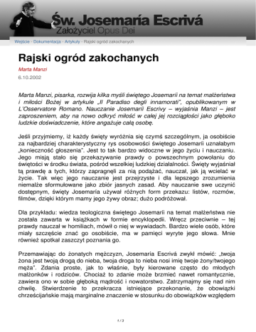 Wejście - Dokumentacja - Artykuły - Rajski ogród zakochanych Rajski ogród zakochanych Marta Manzi 6.10.2002 Marta Manzi, pisarka, rozwija kilka myśli świętego Josemaríi na temat małżeństwa i miłości Bożej w artykule „Il Paradiso degli innamorati”, opublikowanym w L’Osservatore Romano. Nauczanie Josemaríi Escrivy – wyjaśnia Manzi – jest zaproszeniem, aby na nowo odkryć miłość w całej jej rozciągłości jako głęboko ludzkie doświadczenie, które angażuje całą osobę. Jeśli przyjmiemy, iż każdy święty wyróżnia się czymś szczególnym, ja osobiście za najbardziej charakterystyczny rys osobowości świętego Josemaríi uznałabym „konieczność głoszenia”. Jest to tak bardzo widoczne w jego życiu i nauczaniu. Jego misją stało się przekazywanie prawdy o powszechnym powołaniu do świętości w środku świata, pośród wszelkiej ludzkiej działalności. Święty wyjaśniał tą prawdę a tych, którzy zapragnęli za nią podążać, nauczał, jak ją wcielać w życie. Tak więc jego nauczanie jest przejrzyste i dla lepszego zrozumienia niemalże sformułowane jako zbiór jasnych zasad. Aby nauczanie swe uczynić dostępnym, święty Josemaría używał różnych form przekazu: listów, rozmów, filmów, dzięki którym mamy jego żywy obraz; dużo podróżował. Dla przykładu: wiedza teologiczna świętego Josemaríi na temat małżeństwa nie została zawarta w książkach w formie encyklopedii. Wręcz przeciwnie – tej prawdy nauczał w homiliach, mówił o niej w wywiadach. Bardzo wiele osób, które miały szczęście znać go osobiście, ma w pamięci wyryte jego słowa. Mnie również spotkał zaszczyt poznania go. Przemawiając do żonatych mężczyzn, Josemaría Escrivá zwykł mówić: „twoja żona jest twoją drogą do nieba, twoja droga to nieba nosi imię twoje żony/twojego męża”. Zdania proste, jak to właśnie, były kierowane często do młodych małżonków i rodziców. Chociaż to zdanie może brzmieć nawet romantycznie, zawiera ono w sobie głęboką mądrość i nowatorstwo. Zatrzymajmy się nad nim chwilę. Stwierdzenie to przekracza istniejące przekonanie, że obowiązki chrześcijańskie mają marginalne znaczenie w stosunku do obowiązków względem 1/3 Boga. Święty mówi o wzajemnym nakładaniu się relacji z Bogiem i ze współmałżonkiem. Chodzi o to, że nie można wyobrazić sobie życia w pełni chrześcijańskiego na marginesie życia małżeńskiego – Bóg nie czeka na nich poza domem czy poza łożem małżeńskim. Małżonkowie potrzebują tego właśnie małżeństwa do relacji i ze sobą, i z Bogiem. Taka perspektywa rzuca nowe światło na małżeństwa, na ludzką miłość i przekazywanie życia. Nie wymaga nawet jakichś nowych zasad. Aby żyć tą prawdą, trzeba jedynie nowego ducha, głębszego zrozumienia wartości małżeństwa. Każdy małżonek uczestniczy w Bożych planach, jest za siebie osobiście odpowiedzialny, musi wyjść z anonimowości. Każdy jest jak aktor w wielkim, ogromnie ważnym przedstawieniu, które jest w planach Opatrzności Bożej. Małżeństwo to pierwsza komórka miłości i życia, która objawia oblicze Stwórcy. Przyjęcie małżeństwa jako podstawowej relacji a jednocześnie drogi zjednoczenia z Bogiem, pomaga zrozumieć znaczenie dziewictwa, ukazanego przez Chrystusa jako dar w Bożym planie zbawienia. Małżeństwo podkreśla znaczenie dziewictwa i vice versa. Nie ma dysonansu między „świętą” miłością Bożą a ludzką, gdyż ludzka miłość jest jakby mostem, który w naturalny sposób wiedzie nas ku Bogu. Dziewictwo jest również pieśnią miłości ludzkiego serca, które znajduje miłość bezpośrednio w ramionach Boga. Zwracając się do kobiet Josemaría Escrivá dzielił się z nimi tą obserwacją: „jesteście psychologami, dlatego to wasza wina, gdy coś źle się układa”. To spostrzeżenie może wydać się trudne do zaakceptowania, ale właśnie ten paradoks jest podstawą szczególnej roli, jaką kobieta posiada w tworzeniu relacji. Podobnie Jan Paweł II w liście apostolskim Mulieris dignitatem (1988) tłumaczy naukowo, antropologicznie godność i znaczenie kobiety. Rozpoznając tę specyficzną jakość psychiki kobiecej, Josemaría Escrivá próbuje wytłumaczyć to jako jakość ontologiczną, otrzymaną od Boga, jakość ściśle związaną z jej bytem jako bytem kobiety. To ona jest tą, która ma w sobie „innego” (człowieka-dziecko) i czuje go/zna go w samej sobie. To ona ma tę intymną więź z innym, bo jest stworzona, by nosić go w swoim łonie. To ona w sposób bezpośredni i naturalny „współpracuje” z życiem. Niestety w obecnym czasie kobieta próbuje zanegować tę naturę, bardziej psychologicznie niż realnie. Często zwraca się ku mężczyźnie w sposób typowo męski, agresywnie, bez właściwej jej otwartości. W kontaktach personalnych jej „nie” wobec macierzyństwa przekłada się na „nie” wobec człowieka. 2/3 W tym kontekście słowa nowego świętego są autentycznym wyzwaniem dla kobiety. Uznając rzeczywistą kondycję kobiety („jesteście psychologami”), są one zaproszeniem do dotarcia w głąb znaczenia kobiecości. Dlatego one właśnie mają do spełnienia zadanie o zasięgu uniwersalnym. Josemaría Escrivá często pytał małżonków: „Czy kochasz swoją żonę? Czy kochasz swego męża? Czy kochasz także jego wady?” Brzmi to być może ironicznie, być może i romantycznie. Ale za tym pytaniem kryje się głęboka prawda dotycząca wielkości relacji małżeńskiej w ekonomii zbawienia. Pokazuje także, iż wzajemna pomoc jest podstawowym wymiarem ludzkiej egzystencji i relacji z innymi. Mylimy się, kiedy przyjmujemy uczucia jako jedyną podstawę miłości, kiedy myślimy, że miłość jest piękna tylko wtedy, gdy jest idyllą, że dana rzecz jest dobra, gdy daje doraźną korzyść, a bezużyteczna w sytuacji przeciwnej. Kiedy miłość staje si