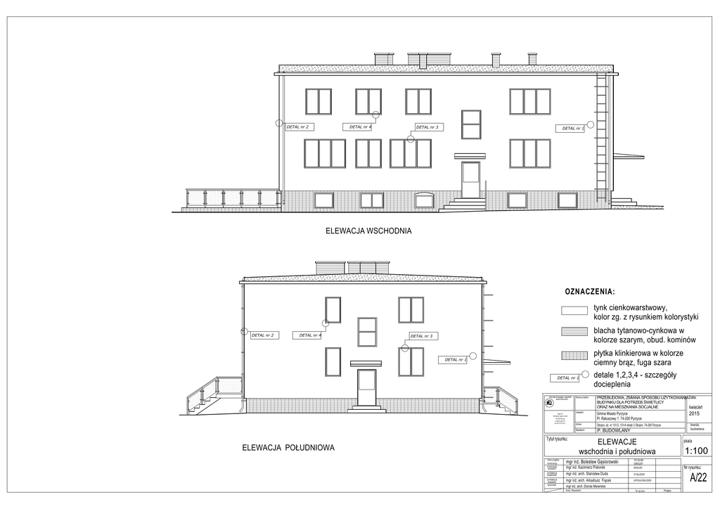 DETAL nr 2 DETAL nr 4 DETAL nr 3 DETAL nr 1 ELEWACJA WSCHODNIA OZNACZENIA: tynk cienkowarstwowy, kolor zg. z rysunkiem kolorystyki DETAL nr 2 DETAL nr 4 blacha tytanowo-cynkowa w kolorze szarym, obud. kominów DETAL nr 3 płytka klinkierowa w kolorze ciemny brąz, fuga szara DETAL nr 1 DETAL nr 1 PROJEKTOWANIE I NADZÓR BUDOWLANY mgr inż. Bolesław Gąsiorowski 74-200 Pyrzyce ul.Dworcowa 23 tel.091/5701613 Tytuł rysunku: ELEWACJA POŁUDNIOWA Autor projektu konstrukcja: konstrukcja sprawdził: architektura projektował: architektura sprawdził: opracował: detale 1,2,3,4 - szczegóły docieplenia Nazwa projektu: PRZEBUDOWA, ZMIANA SPOSOBU UŻYTKOWANIAData: BUDYNKU DLA POTRZEB ŚWIETLICY ORAZ NA MIESZKANIA SOCJALNE kwiecień Inwestor: Gmina Miasto Pyrzyce Pl. Ratuszowy 1 74-200 Pyrzyce Adres: Obojno, dz. nr 131/3, 131/4 obręb 3 Obojno 74-200 Pyrzyce Stadium: P. BUDOWLANY 2015 branża: budowlana ELEWACJE wschodnia i południowa mgr inż. Bolesław Gąsiorowski mgr inż. Kazimierz Piskorek mgr inż. arch. Stanisław Duda mgr inż. arch. Arkadiusz Fiącek skala 1:100 161/Sz/84 309/Sz/87 65/Sz/83 Nr rysunku: A/22 51/Sz/2000 4/POIA/OKK/2009 mgr inż. arch. Dorota Marańska Imię i Nazwisko: Nr upr.proj. Podpis: