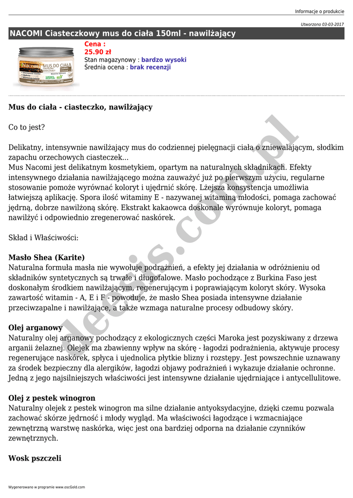 Informacje o produkcie Utworzono 03-03-2017 NACOMI Ciasteczkowy mus do ciała 150ml - nawilżający Cena : 25.90 zł Stan magazynowy : bardzo wysoki Średnia ocena : brak recenzji Mus do ciała - ciasteczko, nawilżający m .p l Co to jest? Skład i Właściwości: .c o Delikatny, intensywnie nawilżający mus do codziennej pielęgnacji ciała o zniewalającym, słodkim zapachu orzechowych ciasteczek... Mus Nacomi jest delikatnym kosmetykiem, opartym na naturalnych składnikach. Efekty intensywnego działania nawilżającego można zauważyć już po pierwszym użyciu, regularne stosowanie pomoże wyrównać koloryt i ujędrnić skórę. Lżejsza konsystencja umożliwia łatwiejszą aplikację. Spora ilość witaminy E - nazywanej witaminą młodości, pomaga zachować jędrną, dobrze nawilżoną skórę. Ekstrakt kakaowca doskonale wyrównuje koloryt, pomaga nawilżyć i odpowiednio zregenerować naskórek. de es is Masło Shea (Karite) Naturalna formuła masła nie wywołuje podrażnień, a efekty jej działania w odróżnieniu od składników syntetycznych są trwałe i długofalowe. Masło pochodzące z Burkina Faso jest doskonałym środkiem nawilżającym, regenerującym i poprawiającym koloryt skóry. Wysoka zawartość witamin - A, E i F - powoduje, że masło Shea posiada intensywne działanie przeciwzapalne i nawilżające, a także wzmaga naturalne procesy odbudowy skóry. Olej arganowy Naturalny olej arganowy pochodzący z ekologicznych części Maroka jest pozyskiwany z drzewa arganii żelaznej. Olejek ma zbawienny wpływ na skórę - łagodzi podrażnienia, aktywuje procesy regenerujące naskórek, spłyca i ujednolica płytkie blizny i rozstępy. Jest powszechnie uznawany za środek bezpieczny dla alergików, łagodzi objawy podrażnień i wykazuje działanie ochronne. Jedną z jego najsilniejszych właściwości jest intensywne działanie ujędrniające i antycellulitowe. Olej z pestek winogron Naturalny olejek z pestek winogron ma silne działanie antyoksydacyjne, dzięki czemu pozwala zachować skórze jędrność i młody wygląd. Ma właściwości łagodzące i wzmacniające zewnętrzną warstwę naskórka, więc jest ona bardziej odporna na działanie czynników zewnętrznych. Wosk pszczeli Wygenerowano w programie www.oscGold.com Jest naturalnym składnikiem mającym działanie ochronne, delikatnie natłuszczając skórę zapobiega nadmiernej utracie wody. Wykazuje działanie regenerujące. Ziarno Kakaowca Naturalne ziarno kakaowca jest bogate w wartościowe substancje nawilżające, tonizujące i odżywcze. Oprócz pozytywnego wpływu na psychikę, kakao jest z powodzeniem używane w produkcji kosmetyków - minerały i mikroelementy obecne w ekstrakcie kakaowca biorą udział w usuwaniu wolnych rodników i delikatnie pobudzają mikrokrążenie. m .p l Jak używać? Mus do ciała przeznaczony jest do codziennego stosowania na skórę całego ciała. Niewielką ilość kosmetyku należy nałożyć na osuszoną, czystą skórę i wmasować kulistymi ruchami. Ciekawostki: .c o Naturalny wosk pszczeli jest od lat stosowany jako podstawa dla kosmetyków i leków przeciwalergicznych. Długotrwałe, regularne stosowanie kosmetyków na bazie wosku pszczelego pomaga łagodzić objawy zmian skórnych o podłożu alergicznym, ponieważ intensywnie wpływa on na regenerację uszkodzonych tkanek, a skóra staje się odporna na działanie alergenów. de es is Skład: Butyrospermum Parkii Butter, Vitis Vinifera Seed Oil, Caprylic Capric Triglyceride, Cera Alba, Helianthus Annuus Sunflower Seed Oil, Glycerin, , Argania Spinosa Kernel Oil, Cetyl Alcohol, Cocoa Bean Extract, , Tocopheryl Acetate, Parfum
