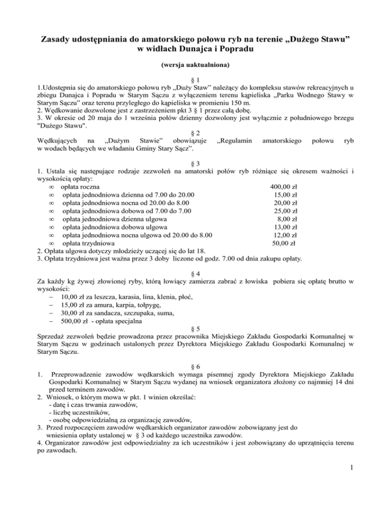 Zasady udostępniania do amatorskiego połowu ryb na terenie „Dużego Stawu” w widłach Dunajca i Popradu (wersja uaktualniona) §1 1.Udostępnia się do amatorskiego połowu ryb „Duży Staw” należący do kompleksu stawów rekreacyjnych u zbiegu Dunajca i Popradu w Starym Sączu z wyłączeniem terenu kąpieliska „Parku Wodnego Stawy w Starym Sączu” oraz terenu przyległego do kąpieliska w promieniu 150 m. 2. Wędkowanie dozwolone jest z zastrzeżeniem pkt 3 § 1 przez całą dobę. 3. W okresie od 20 maja do 1 września połów dzienny dozwolony jest wyłącznie z południowego brzegu "Dużego Stawu". §2 Wędkujących na „Dużym Stawie” obowiązuje „Regulamin amatorskiego połowu ryb w wodach będących we władaniu Gminy Stary Sącz”. §3 1. Ustala się następujące rodzaje zezwoleń na amatorski połów ryb różniące się okresem ważności i wysokością opłaty: • opłata roczna 400,00 zł • opłata jednodniowa dzienna od 7.00 do 20.00 15,00 zł • opłata jednodniowa nocna od 20.00 do 8.00 20,00 zł • opłata jednodniowa dobowa od 7.00 do 7.00 25,00 zł • opłata jednodniowa dzienna ulgowa 8,00 zł • opłata jednodniowa dobowa ulgowa 13,00 zł • opłata jednodniowa nocna ulgowa od 20.00 do 8.00 12,00 zł • opłata trzydniowa 50,00 zł 2. Opłata ulgowa dotyczy młodzieży uczącej się do lat 18. 3. Opłata trzydniowa jest ważna przez 3 doby liczone od godz. 7.00 od dnia zakupu opłaty. §4 Za każdy kg żywej złowionej ryby, którą łowiący zamierza zabrać z łowiska pobiera się opłatę brutto w wysokości: − 10,00 zł za leszcza, karasia, lina, klenia, płoć, − 15,00 zł za amura, karpia, tołpygę, − 30,00 zł za sandacza, szczupaka, suma, − 500,00 zł - opłata specjalna §5 Sprzedaż zezwoleń będzie prowadzona przez pracownika Miejskiego Zakładu Gospodarki Komunalnej w Starym Sączu w godzinach ustalonych przez Dyrektora Miejskiego Zakładu Gospodarki Komunalnej w Starym Sączu. §6 Przeprowadzenie zawodów wędkarskich wymaga pisemnej zgody Dyrektora Miejskiego Zakładu Gospodarki Komunalnej w Starym Sączu wydanej na wniosek organizatora złożony co najmniej 14 dni przed terminem zawodów. 2. Wniosek, o którym mowa w pkt. 1 winien określać: - datę i czas trwania zawodów, - liczbę uczestników, - osobę odpowiedzialną za organizację zawodów, 3. Przed rozpoczęciem zawodów wędkarskich organizator zawodów zobowiązany jest do wniesienia opłaty ustalonej w § 3 od każdego uczestnika zawodów. 4. Organizator zawodów jest odpowiedzialny za ich uczestników i jest zobowiązany do uprzątnięcia terenu po zawodach. 1. 1 REGULAMIN amatorskiego połowu ryb na terenie „Dużego Stawu” w wodach będących we władaniu Gminy Stary Sącz. Wstęp 1. Regulamin dotyczy amatorskiego połowu ryb wędką na terenie „Dużego Stawu”w wodach będących we władaniu Gminy Stary Sącz i obowiązuje wszystkich wędkujących w tych wodach. 2. Zakres wód udostępnionych do wędkowania oraz związane z tym opłaty określa Burmistrz Starego Sącza. 3. Wejście na łowisko jest równoznaczne z akceptacją Regulaminu. Zasady udostępnienia łowiska §1 1. Zabrania się wędkowania na terenie kąpieliska „Parku Wodnego Stawy w Starym Sączu”, oraz na terenie przyległym do niego w promieniu 150 m. 2. Miejsce do wędkowania można zająć jedynie po uprzedniej konsultacji z osobą obsługującą. Dotyczy to także osób posiadających zezwolenie roczne. 3. Dzieci i młodzież do lat 18 mogą przebywać na terenie łowiska wyłącznie pod opieką osób pełnoletnich, którzy w pełni ponoszą za nich odpowiedzialność. 4. Każdy z łowiących wchodzi na łowisko na własną odpowiedzialność. Właściciel łowiska nie ponosi odpowiedzialności za wypadki oraz rzeczy pozostawione na łowisku. 5. Odpowiedzialność za osoby towarzyszące ponosi osoba, która wykupiła zezwolenie na wędkowanie. 6. Zmiana miejsca wędkowania jest możliwa po uprzednim zgłoszeniu obsłudze łowiska. 7. Na terenie łowiska należy zachować cisze. 8. Na łowisku obowiązuje zakaz: − zaśmiecania terenu, − niszczenia roślinności, − rozpalania ognisk, za wyjątkiem miejsc do tego przeznaczonych, − kąpieli, poza miejscem do tego wyznaczonym, − parkowania samochodów poza miejscem do tego wyznaczonym, − głośnego zachowania Obowiązki wędkującego §2 1. W czasie wędkowania wędkarz ma obowiązek posiadać przy sobie dokument tożsamości oraz ważne zezwolenie na połów ryb. 2. Wędkarz posiadający wykupioną opłatę roczną każdorazowe wejście na łowisko winien zgłaszać obsłudze łowiska. 3. Ryby z haczyka należy uwalniać z zastosowaniem maksymalnych ostrożności. 4. Ryby o wadze pow. 3 kg (w przypadku suma 10 kg) należy po złowieniu bezwłocznie wypuścić z powrotem do łowiska. 5. Pozostałe ryby, których wędkarz nie zamierza zabrać należy także bezwłocznie po złowieniu wypuścić. 6. Za ryby, które wędkarz przetrzymuje obsługa łowiska może naliczyć opłatę w dowolnym momenie wędkowania. 7. Po opuszczeniu łowiska wędkarz bewzględnie jest zobowiązany zgłosić obsłudze łowiska 2 złowione ryby w celu ich zważenia i naliczenia stosownej opłaty. 8. Naliczenie opłaty za złowione ryby odbywa się wyłącznie w godzinach ustalonych przez Dyrektora Miejskiego Zakładu Gospodarki Komunalnej w Starym Sączu. 9. W czasie wędkowania wędki muszą być pod stałym nadzorem ich właściciela. 10. Wędkarz zobowiązany jest utrzymać w czystości stanowisko wędkarskie w promieniu minimum 5 m, bez względu na stan, jaki zastał przed rozpoczęciem połowu. 11. Obowiązkiem wędkarza jest opuszczenie łowiska, jeśli rozgrywane mają być na nim zawody sportowe. Zasady wędkowania §3 1. Wędkarze mogą wędkować dwoma wędkami. Dopuszczalne jest łowienie większą ilością wędek jedynie w przypadku wykupienia dodatkowych zezwoleń. 2. Wędkarze niepełnoletni posiadający zezwolenie ulgowe m