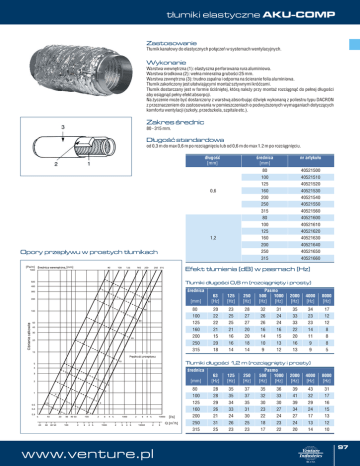 t³umiki elastyczne AKU-COMP Zastosowanie T³umik kana³owy do elastycznych po³¹czeñ w systemach wentylacyjnych. Wykonanie Warstwa wewnêtrzna (1): elastyczna perforowana rura aluminiowa. Warstwa œrodkowa (2): we³na mineralna gruboœci 25 mm. Warstwa zewnêtrzna (3): trudno zapalna i odporna na œcieranie folia aluminiowa. T³umik zakoñczony jest u³atwiaj¹cymi monta¿ sztywnymi króæcami. T³umik dostarczany jest w formie œciœniêtej, któr¹ nale¿y przy monta¿ rozci¹gn¹æ do pe³nej d³ugoœci aby osi¹gn¹æ pe³ny efekt absorpcji. Na ¿yczenie mo¿e byæ dostarczony z warstw¹ absorbuj¹c dŸwiêk wykonan¹ z poliestru typu DACRON z przeznaczeniem do zastosowania w pomieszczeniach o podwy¿szonych wymaganiach dotycz¹cych komfortu wentylacji (szko³y, przedszkola, szpitale etc.). Zakres œrednic 80 - 315 mm. D³ugoœæ standardowa od 0,3 m do max 0,6 m po rozci¹gniêciu lub od 0,6 m do max 1.2 m po rozci¹gniêciu. d³ugoœæ [mm] œrednica [mm] 0,6 1,2 Opory przep³ywu w prostych t³umikach [Pa/m] [mm] nr artyku³u 80 40521500 100 40521510 125 40521520 160 40521530 200 40521540 250 40521550 315 40521560 80 40521600 100 40521610 125 40521620 160 40521630 200 40521640 250 40521650 315 40521660 Efekt t³umienia [dB] w pasmach [Hz] T³umiki d³ugoœci 0,6 m (rozci¹gniêty i prosty) œrednica [mm] 63 [Hz] 125 [Hz] 250 [Hz] Pasmo 500 1000 [Hz] [Hz] 2000 [Hz] 4000 [Hz] 8000 [Hz] 80 20 23 28 32 31 35 34 17 100 22 25 27 26 24 33 23 12 12 125 22 25 27 26 24 33 23 160 21 21 20 16 16 22 14 8 200 15 16 20 14 15 20 11 8 250 20 16 18 10 13 16 9 8 315 18 14 14 9 12 13 9 5 T³umiki d³ugoœci 1,2 m (rozci¹gniêty i prosty) œrednica [mm] [l/s] 3 Q [m /h] www.venture.pl 63 [Hz] 125 [Hz] 250 [Hz] Pasmo 500 1000 [Hz] [Hz] 2000 [Hz] 4000 [Hz] 8000 [Hz] 80 28 35 37 35 36 39 43 31 100 28 35 37 32 33 41 32 17 125 29 34 35 30 30 39 29 16 160 26 33 31 23 27 34 24 15 200 21 24 30 22 24 27 17 13 250 31 26 25 18 23 24 13 12 315 25 23 23 17 22 20 14 10 97